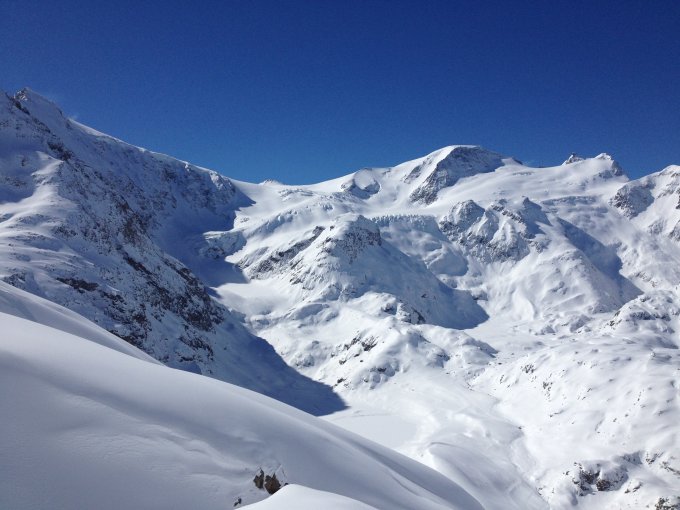 In der Abfahrt oben z. T. Windverpresster Schnee, nordseitig lockerer Pulver unten dann wo die Sonne drankam zum Teil mit dünnem Deckel um die Mittagszeit. in der Sonne Sulz.