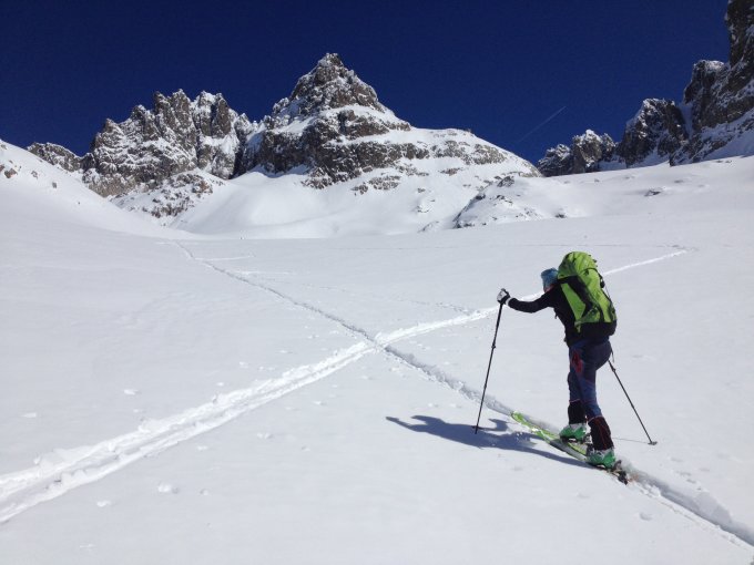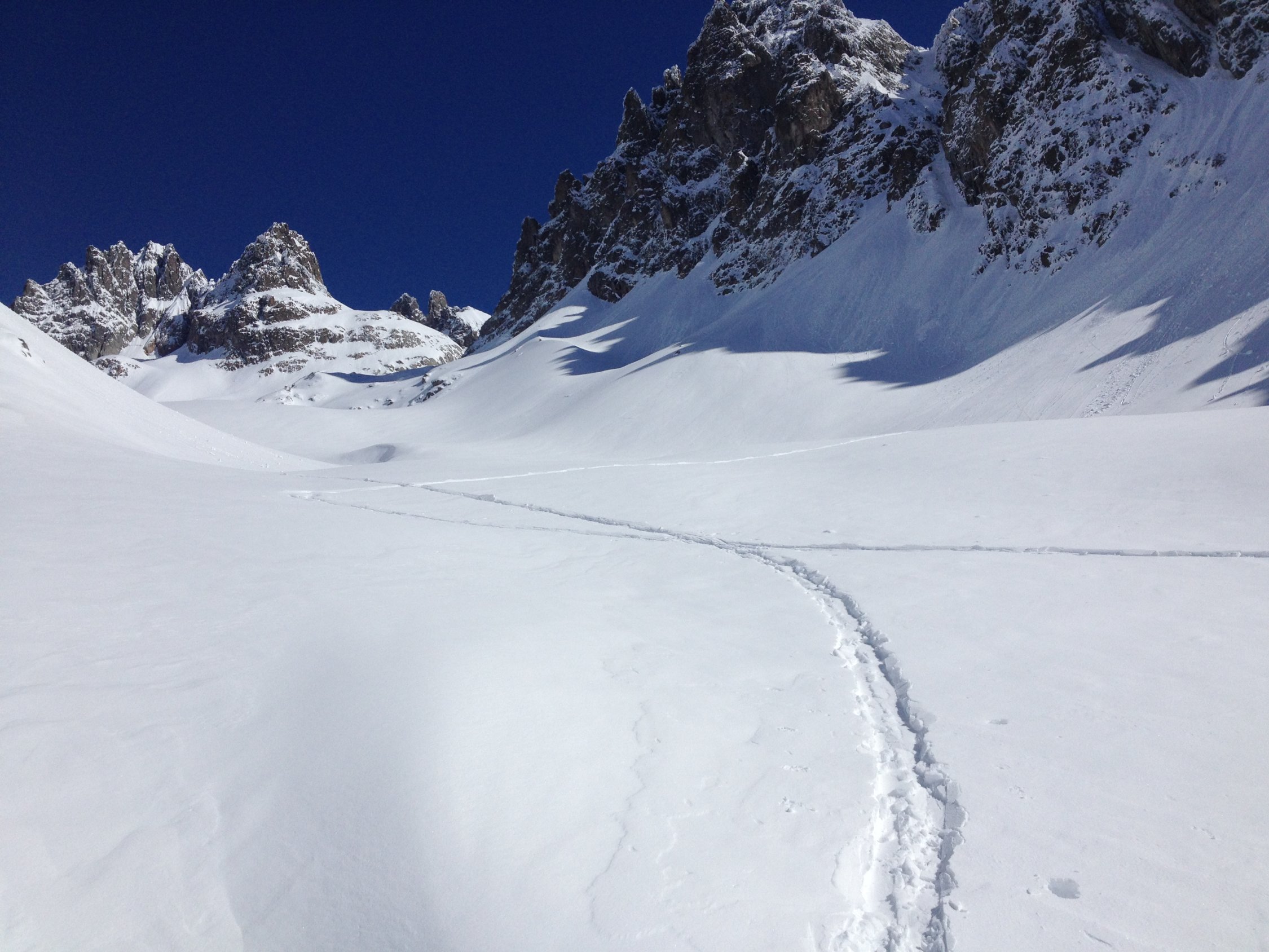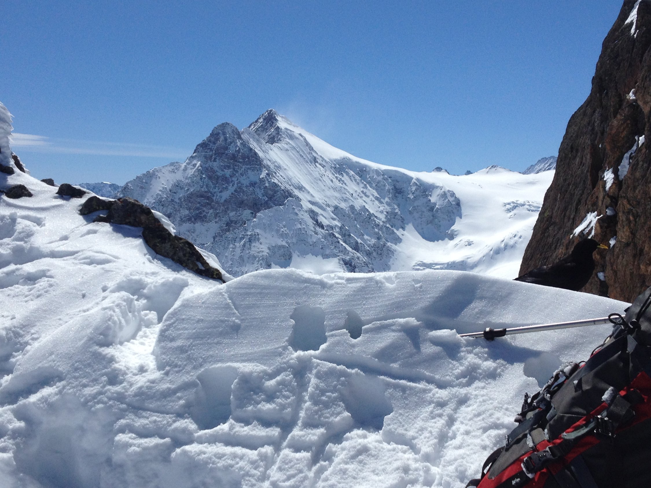 Auf nicht tragendem Harschdeckel aufgestiegen. Viele Lockerschneeruzsche aus den steilen Felsen waren schon unten. In der Abfahrt dann zum Teil Firn, verblasener Schnee, und unten raus natürlich schwerer Sulz.
