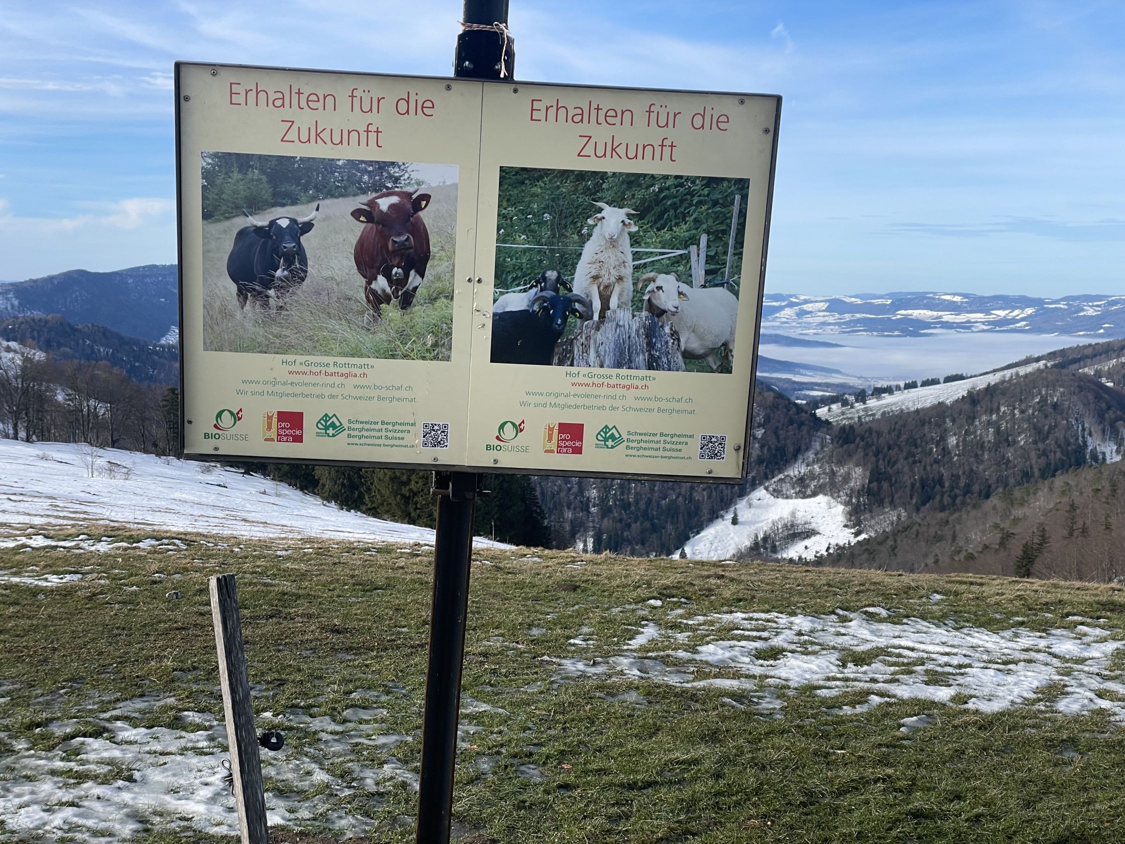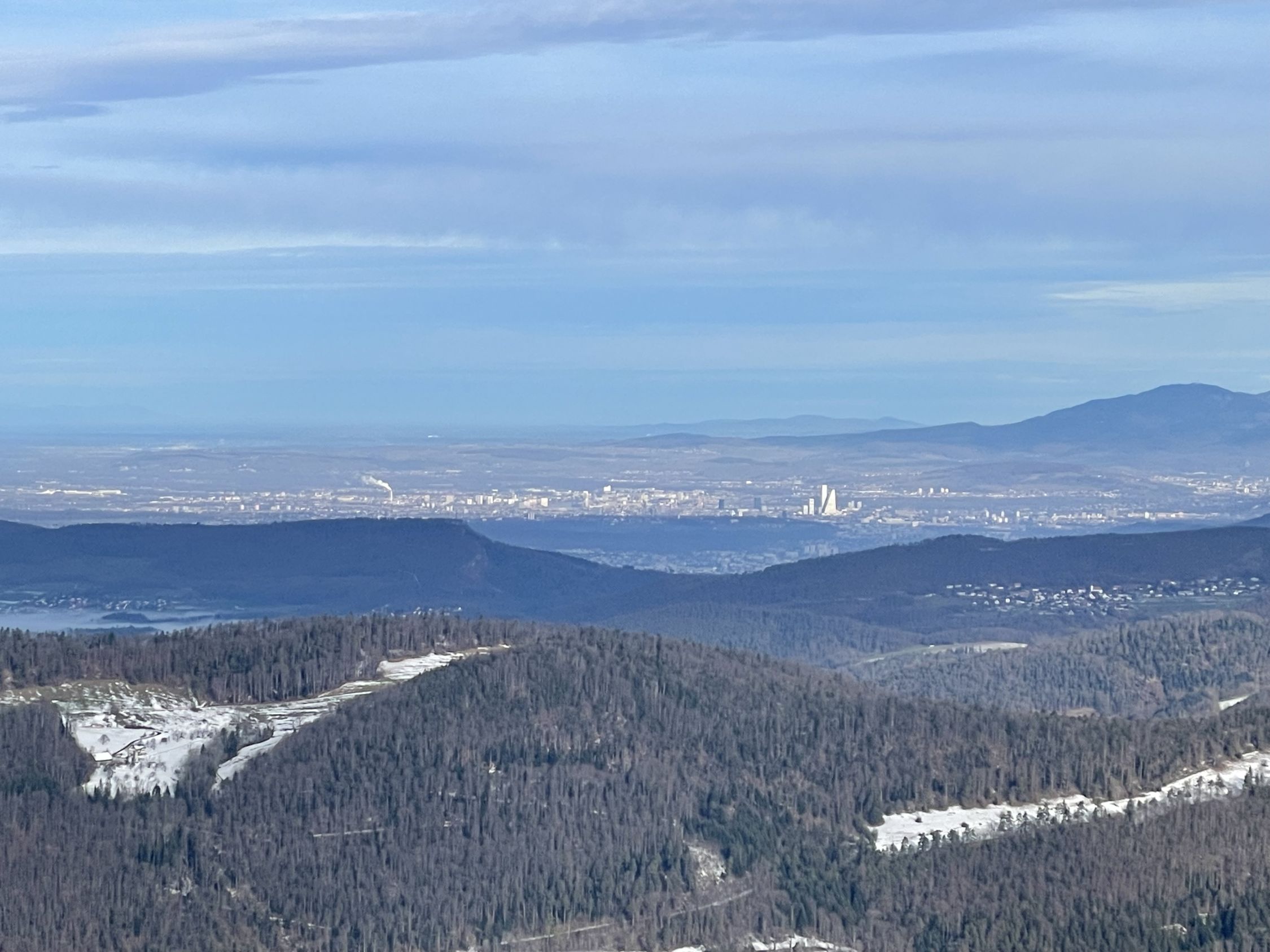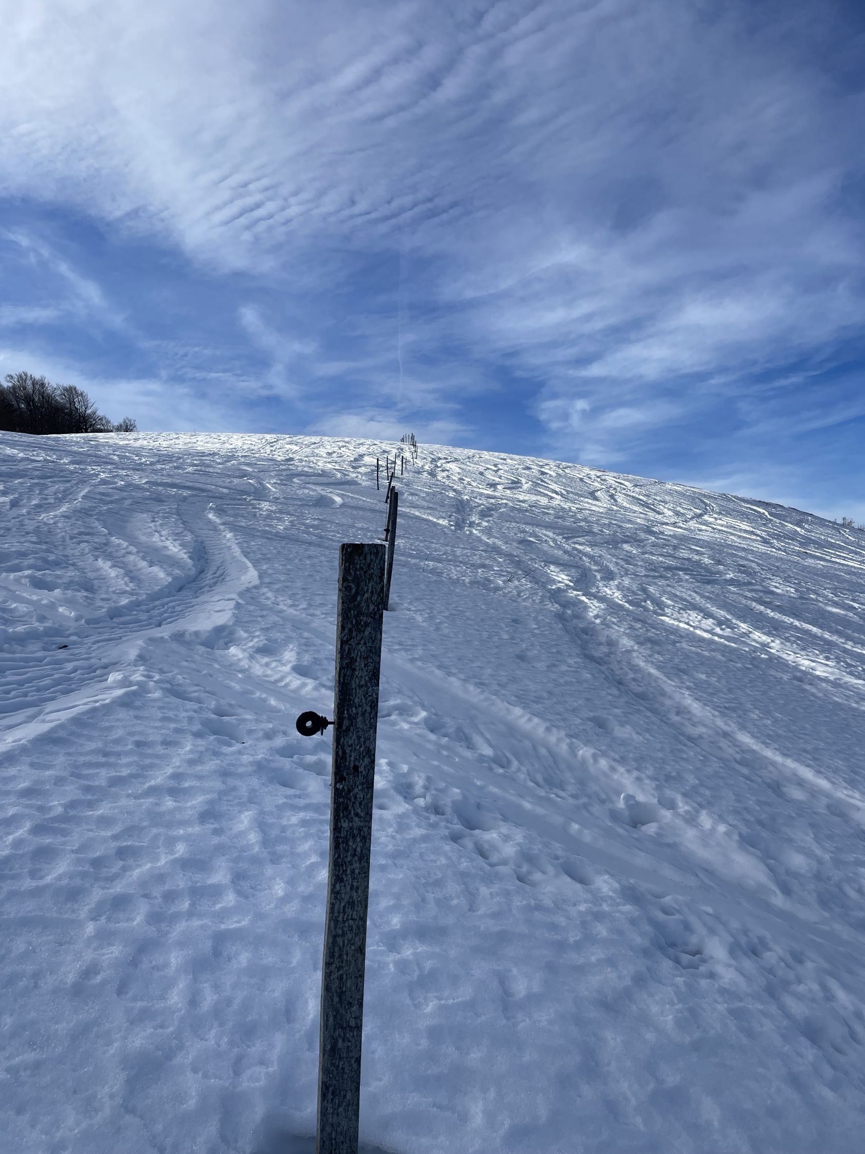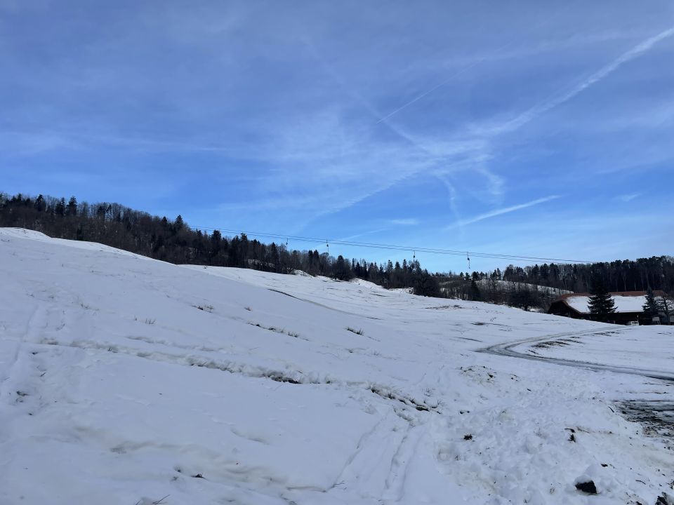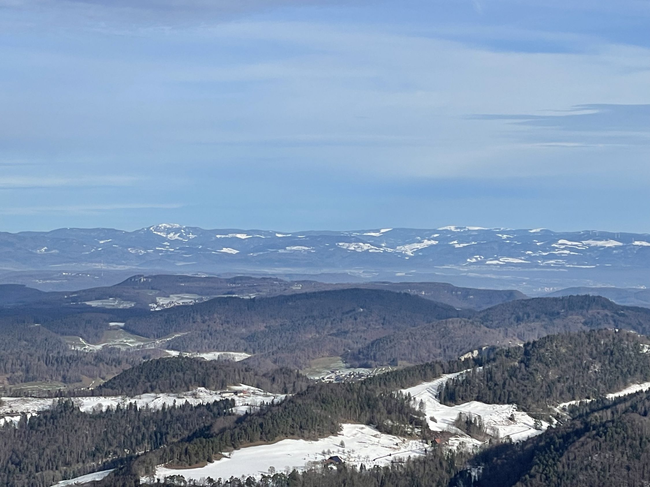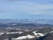 Plus 4 Grad beim Start heute, ich bin vom Skilift gestartet. Schnee gerade noch knapp durchgängig, nur bei der kurzen heiklen Stelle im Wald musste ich die Ski kurz tragen. Den Spuren nach gab es hier auch den einen oder anderen Sturz. Am Gipfel warm mit leichtem Wind und Sonne, hübsch. Richtung Rotmatt bereits weitgehend aper. Schöner Blick nach Basel und in den Schwarzwald. Abfahrt im Gipfelhang gut schwingbarer Nassschnee, weiter unten dann entweder Bruchharsch neben oder eisig hart auf der Piste. Ich habe letzteres bevorzugt. Nicht schön, aber fahrbar.
