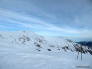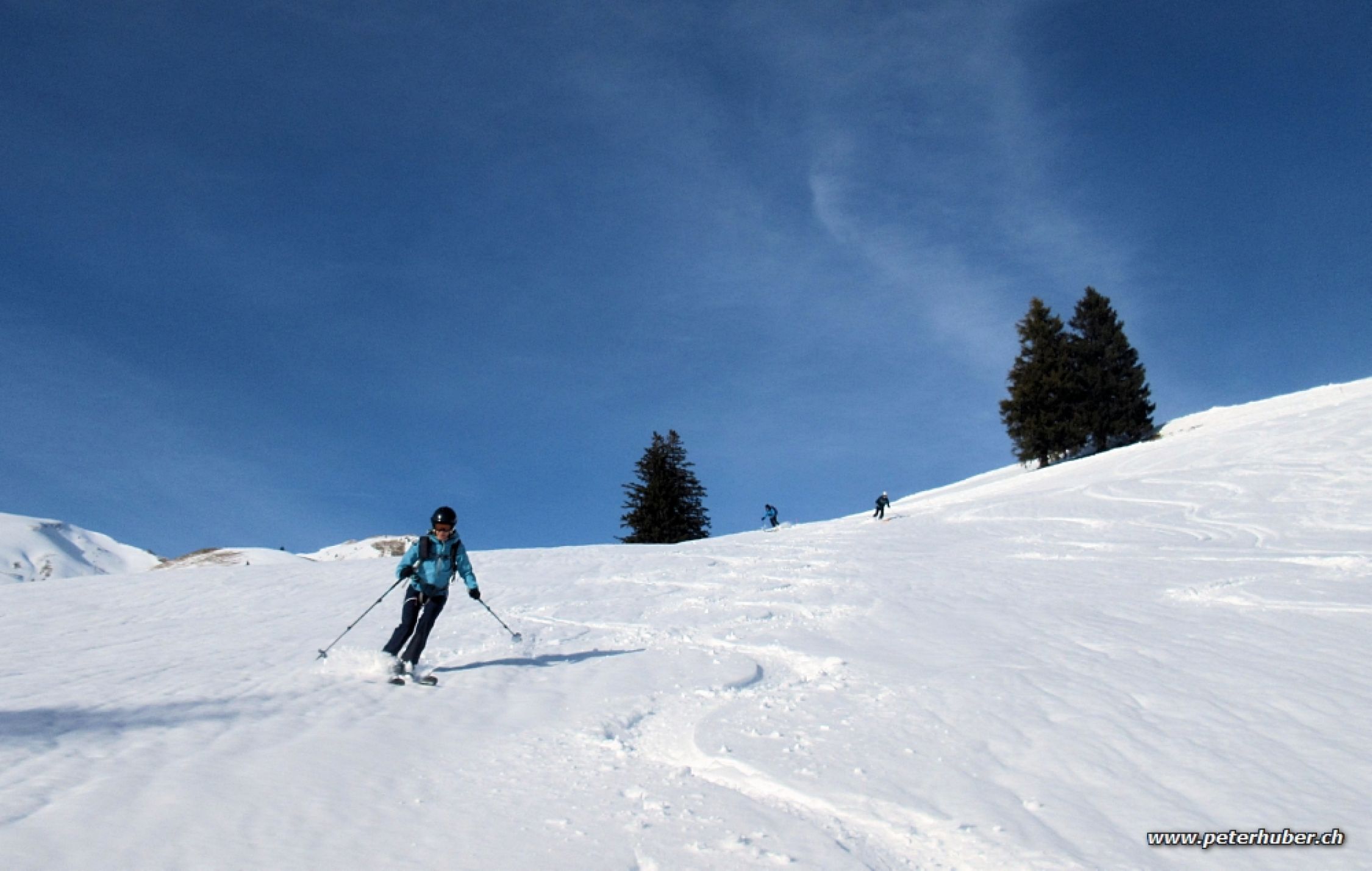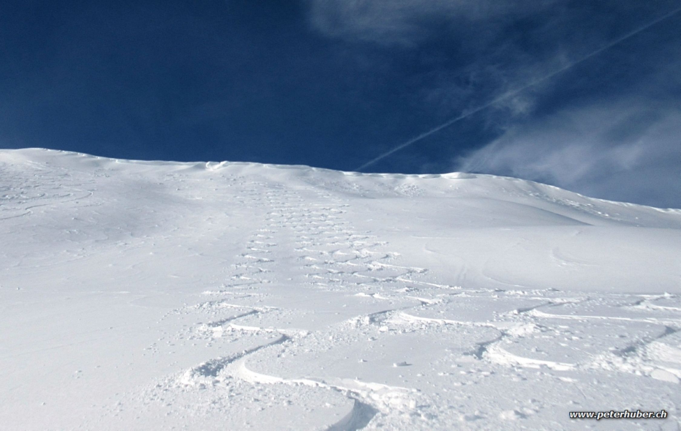 Abfahrt: Der Gipfelhang war leicht windgepresster Pulver. Er lies sich gut fahren. Viel Platz für eigene Spuren. Zwischen Schönbüel und Breitenfeld fast tragender Schnee und auch sehr feuchte Passagen in den etwas steileren Hängen - Frühlingsgefühle.