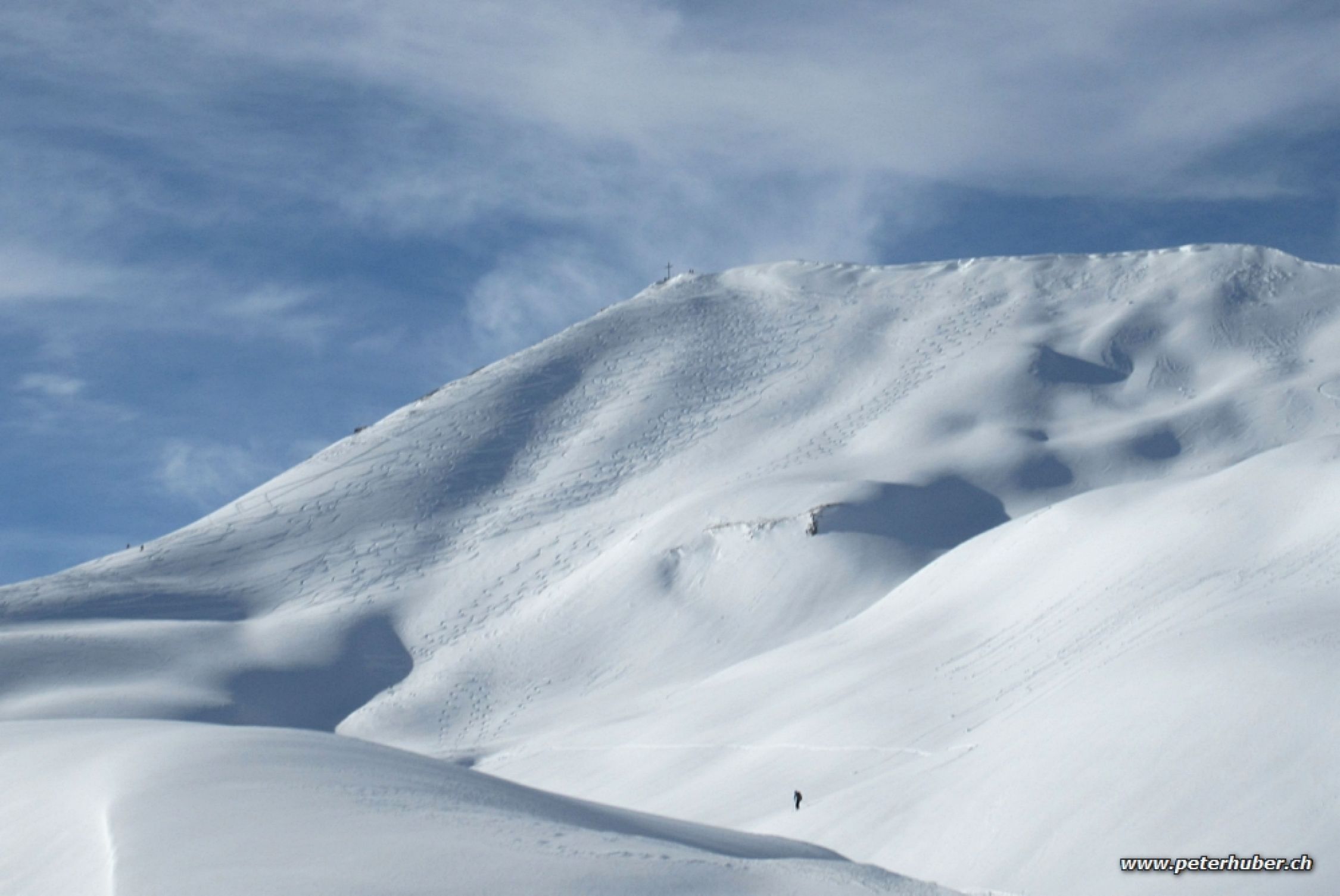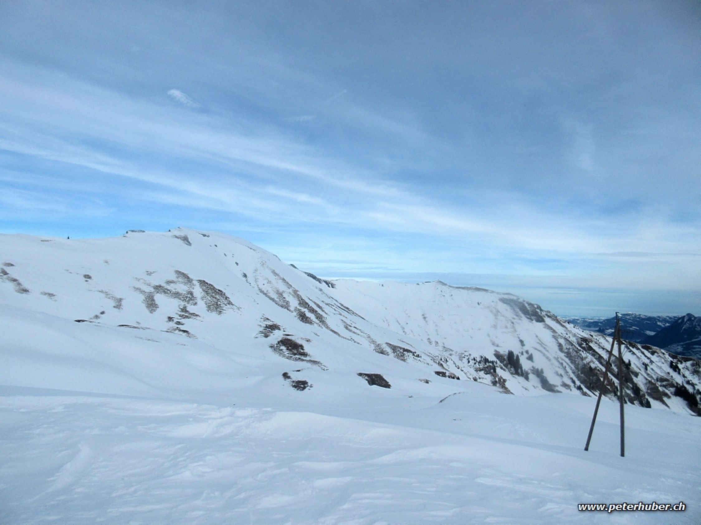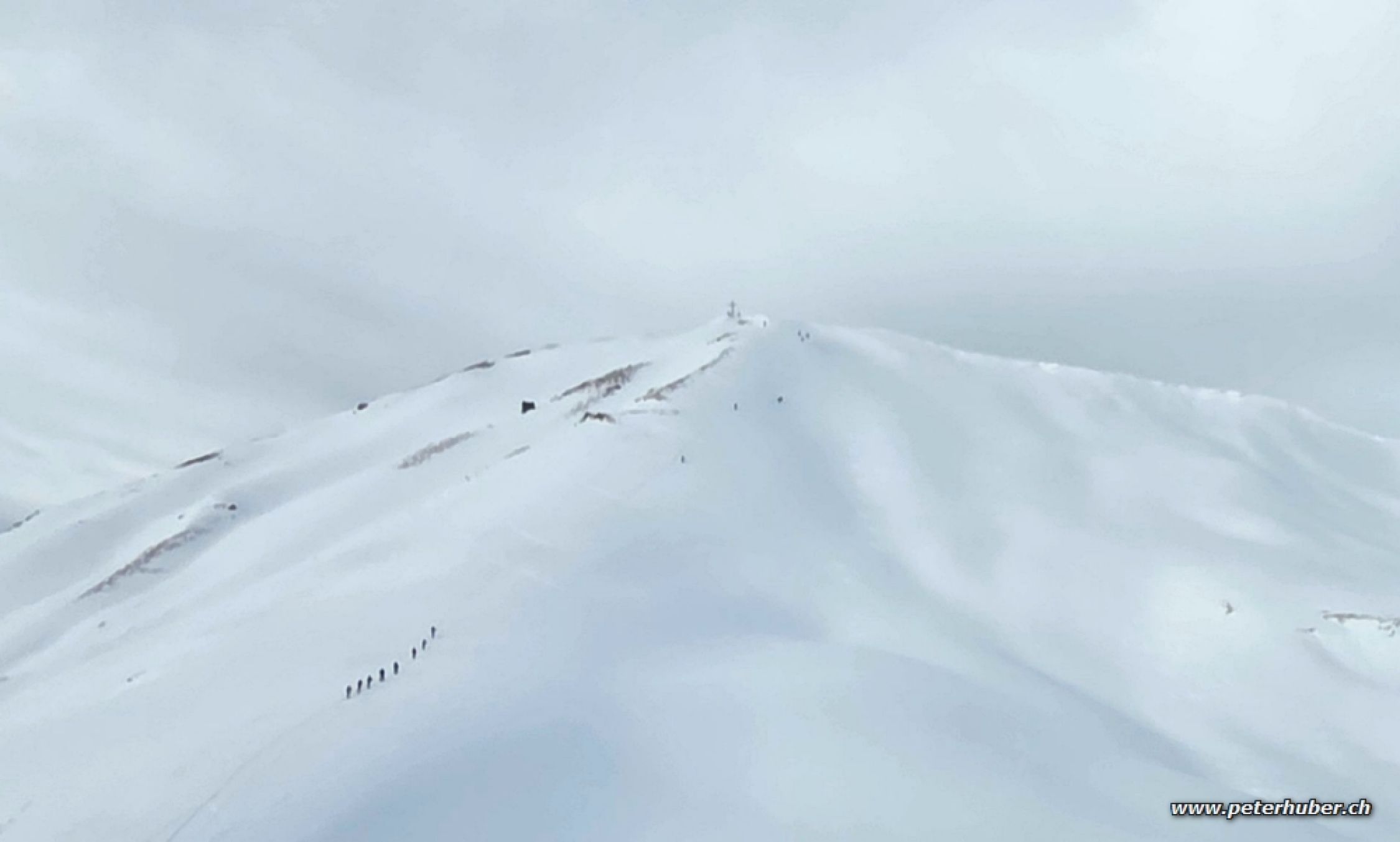 Es hat durchgehend Schnee. Bis etwa 2000 m recht feucht und kompakt. Etliche Kuppen und Rippen sind abgeweht. Vom grossen Schnee ist nicht mehr so viel zu spüren. Auf guter Spur via Restaurant Schönbüel zum Gipfel. Mit einer längeren Kaffeepause im Aufstieg warteten wir das sich bessernde Wetter ab. Es hat sich gelohnt, denn bei der Abfahrt hatten wir viel Sonnenschein.