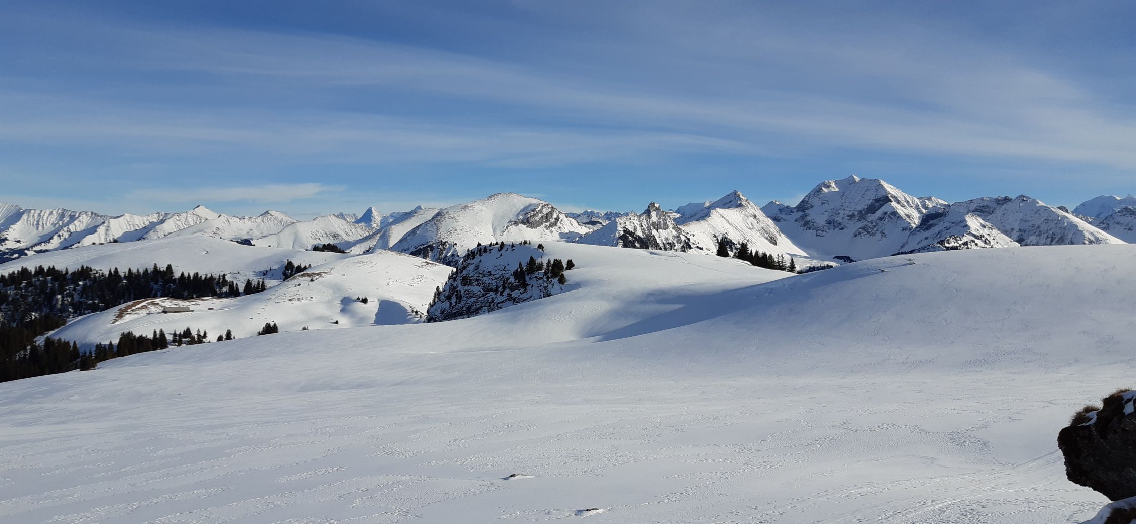 Sehr warm und ziemlich sonnig. Genügend Schnee ab Parkpkatz. Der Schnee schwindet und leidet unter den warmen Temperaturen, er ist meist nass, aber gut fahrbar.