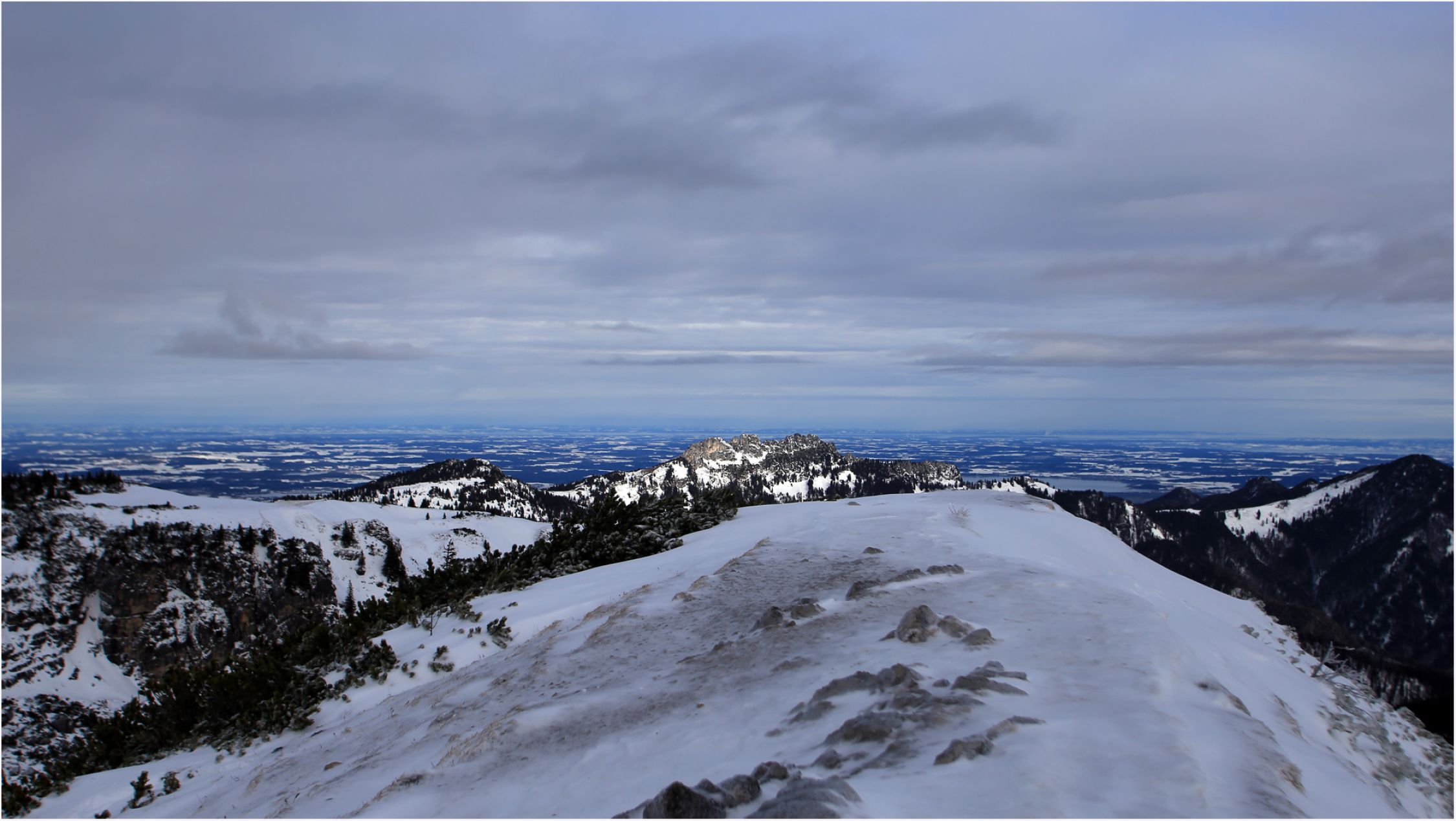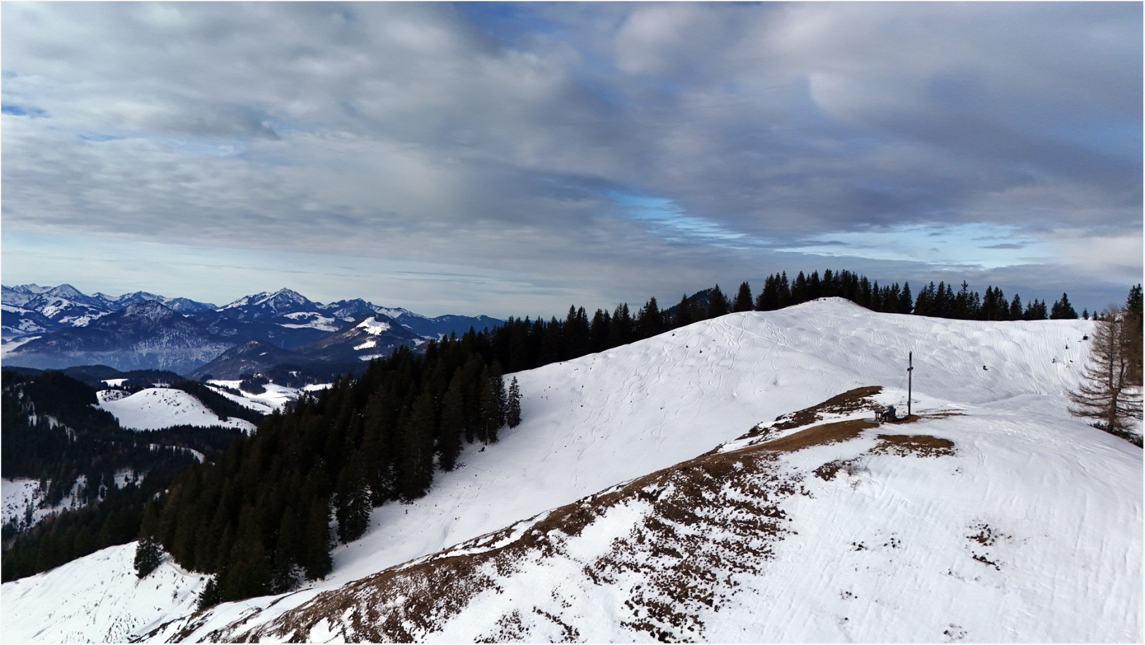 Blick in die Runde: Der Eindruck täuscht. Viel Schnee liegt nirgends, meistens keine Unterlage, Westhänge vielfach angeblasen.
