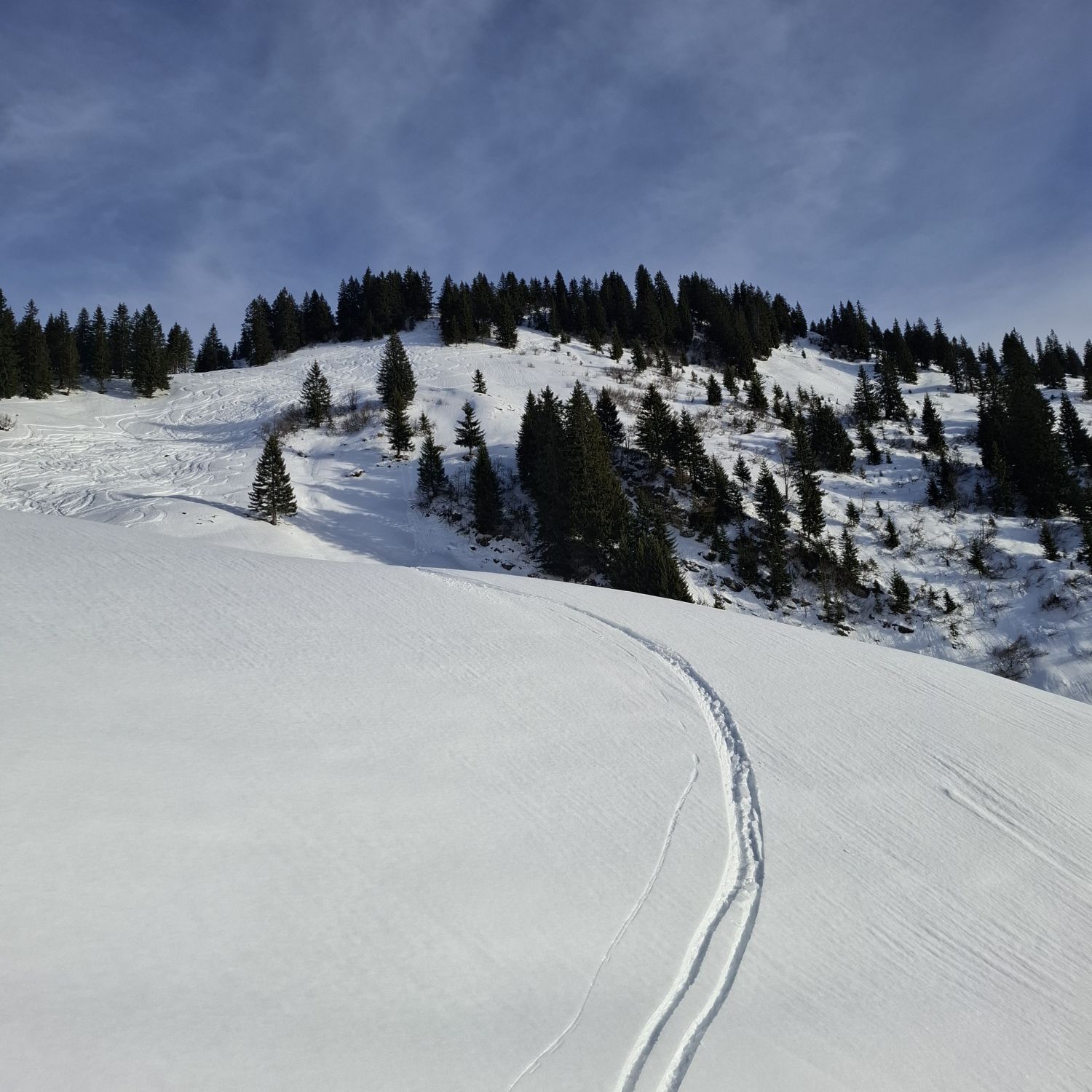 Auf guter Spur zur Piste und dann auf feiner Spur dugch den Wald bis hinauf alles bestens. Nasser "Pulver" aber sehr gut zu fahren bis Gapfohler Alpe und auf bestens präparierter Piste zum Ausgangspunkt.