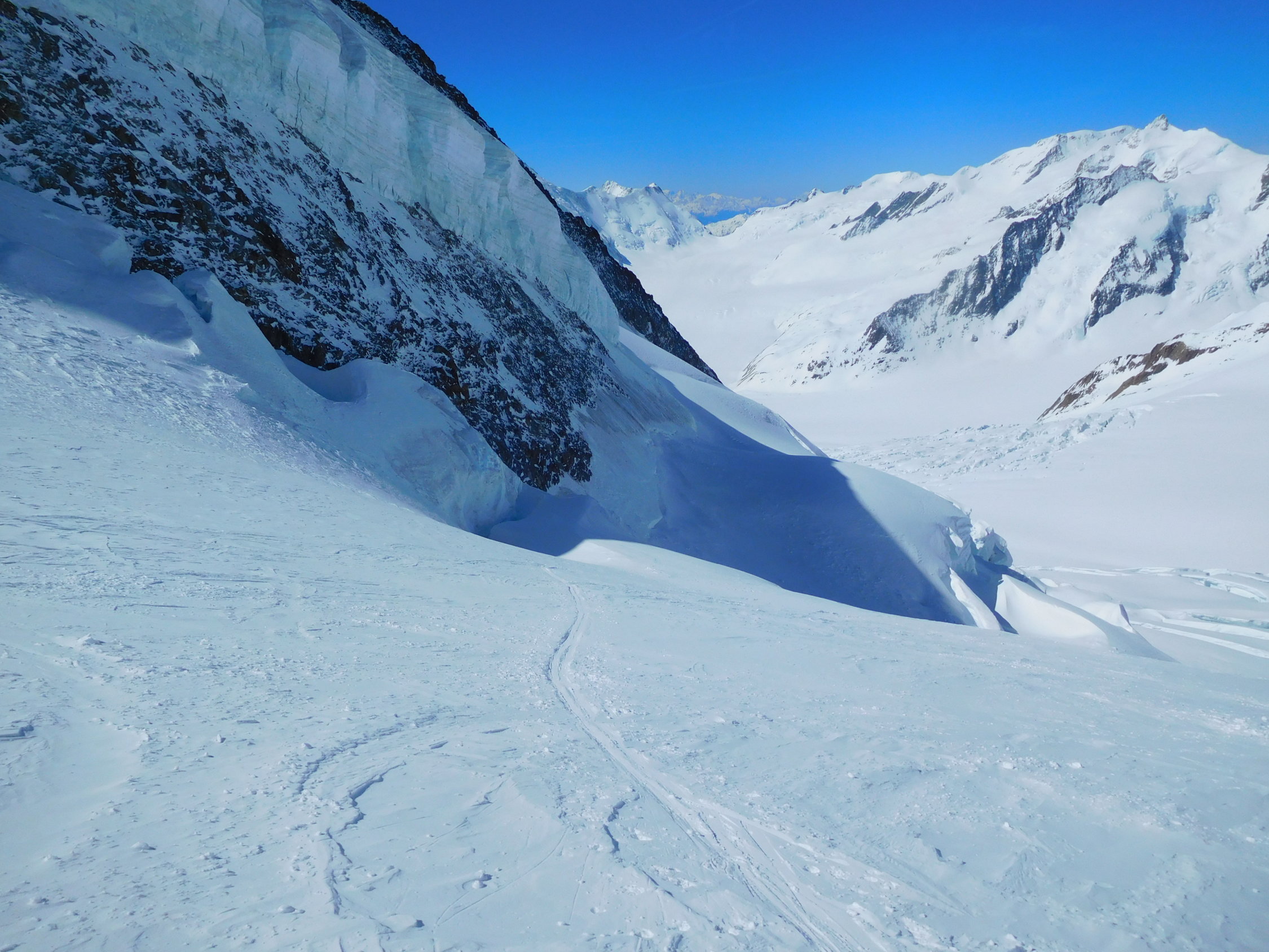 Start der Tour beim Jungfraujoch bei Wolkenlosem Himmel am 9 Uhr, kurzer Aufstieg zum Mönchsjoch, dann folgte die Abfahrt durch das Ewigschneefeld bei Presspulver, der Aufstieg in Richtung gross Grünhorn ist recht Hochalpin mit grossen Spalten und einem Hängegletscher, die Aufstiegsspur war recht gut, die Temperaturen waren eher kalt, vielfach auch windig, der Aufstieg zur Lötschenlücke endlos, Abfahrt bis Fafleralp noch Schnee, wenn man Glück hat fährt gerade ein Bus nach Blatten.