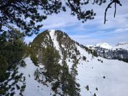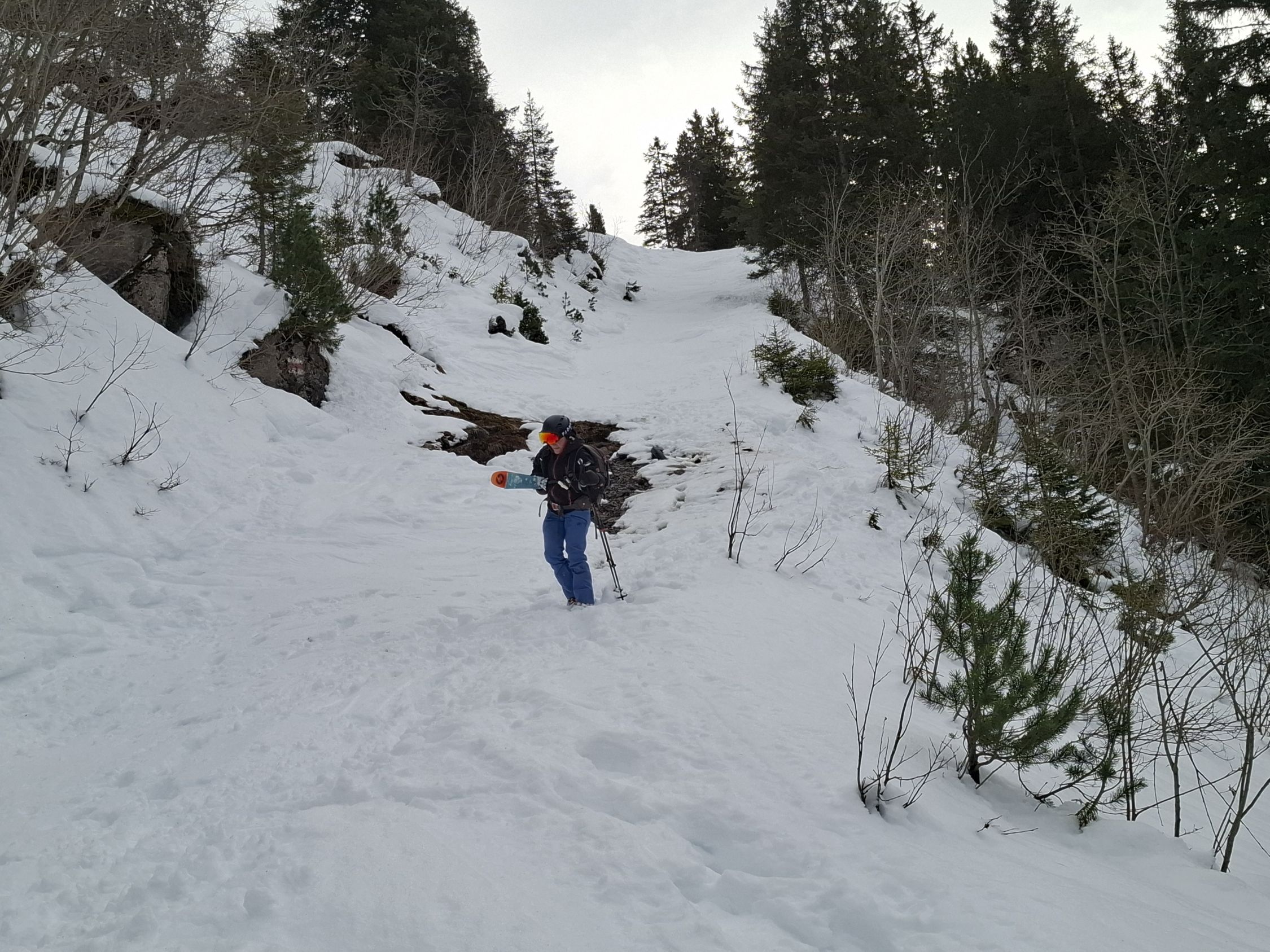 Ziemlich verfahren, die Spur manchmal hart. Die steile Engstelle ist pickelhart, mit Gras-, Fels- und Eisflecken. Es empfiehlt sich, die Ski kurz zu tragen oder die Harscheisen zu montieren. Nachdem die W-Flanke unter dem Gipfel sehr verfahren war, drehten wir beim Wegweiser (ca. 1680m) nach Süden und gingen auf das Farenstöckli. Dessen steile W-Flanke sah noch vielversprechender aus.