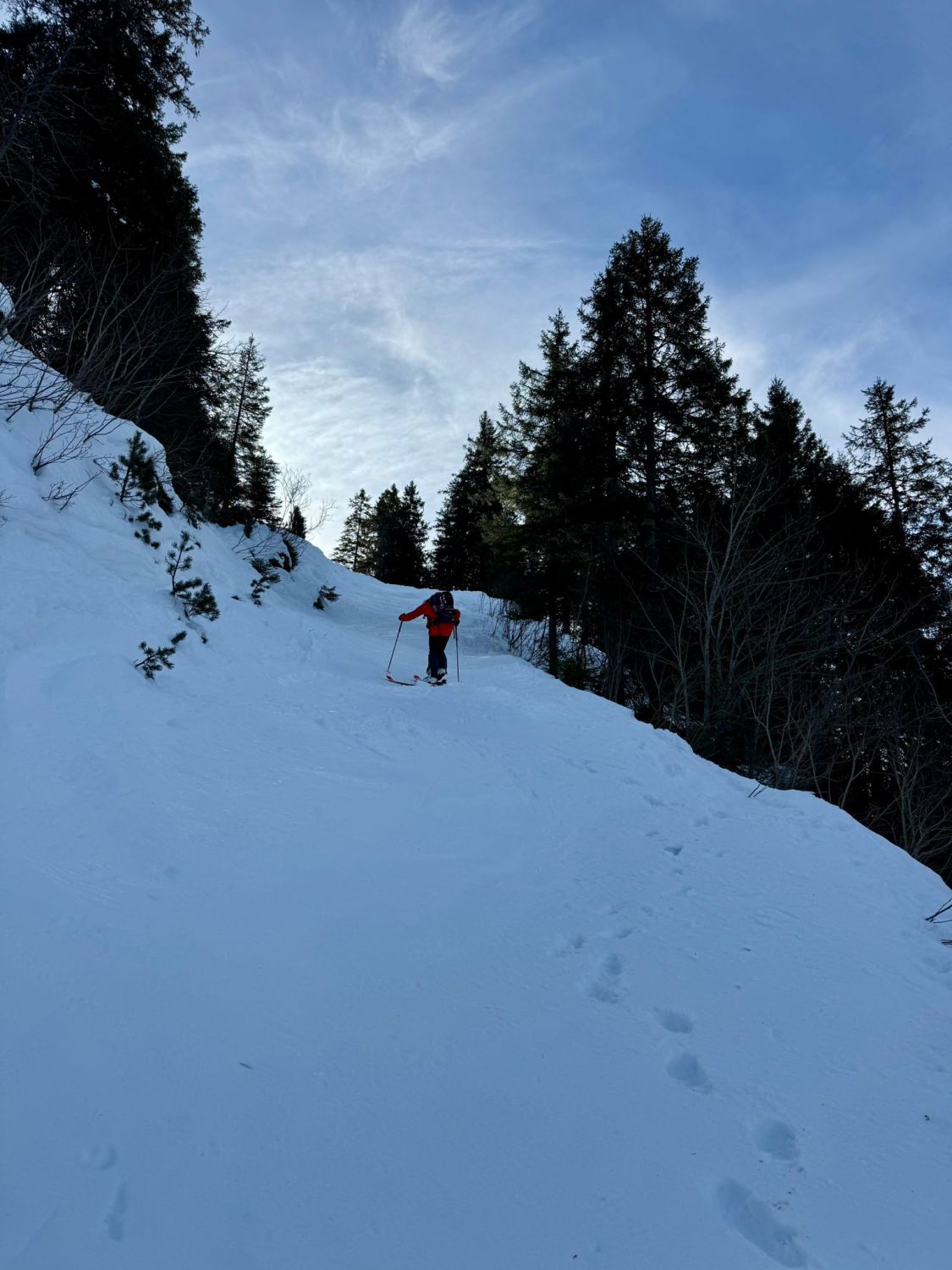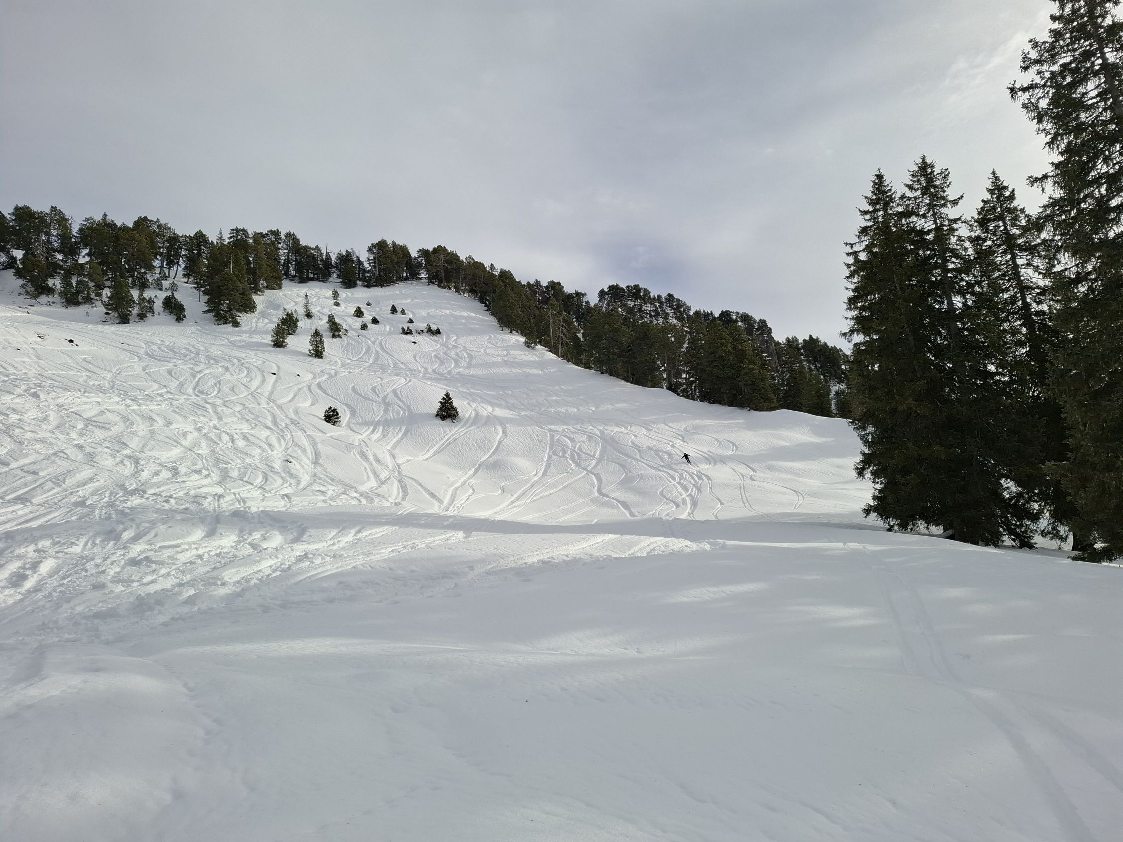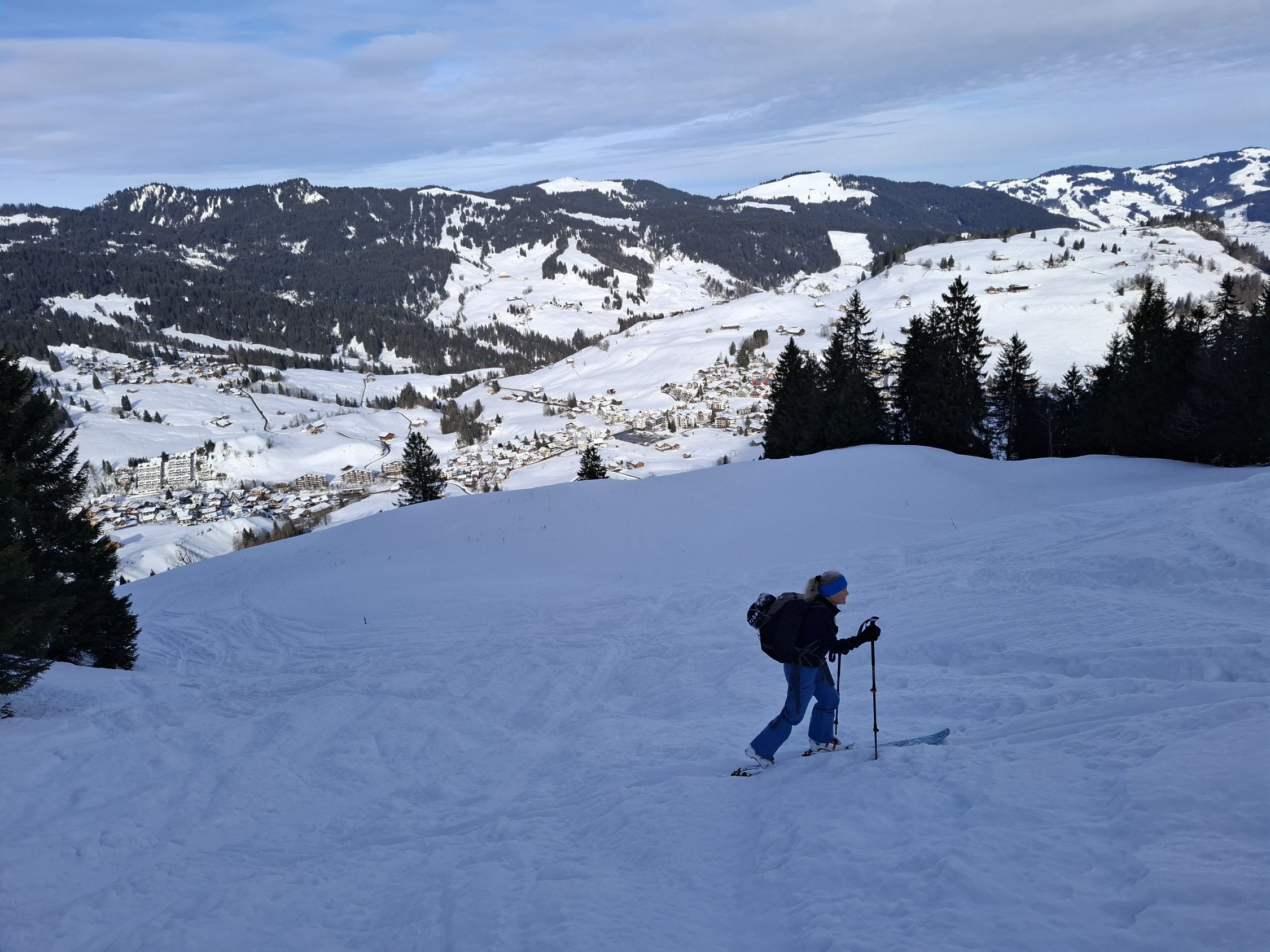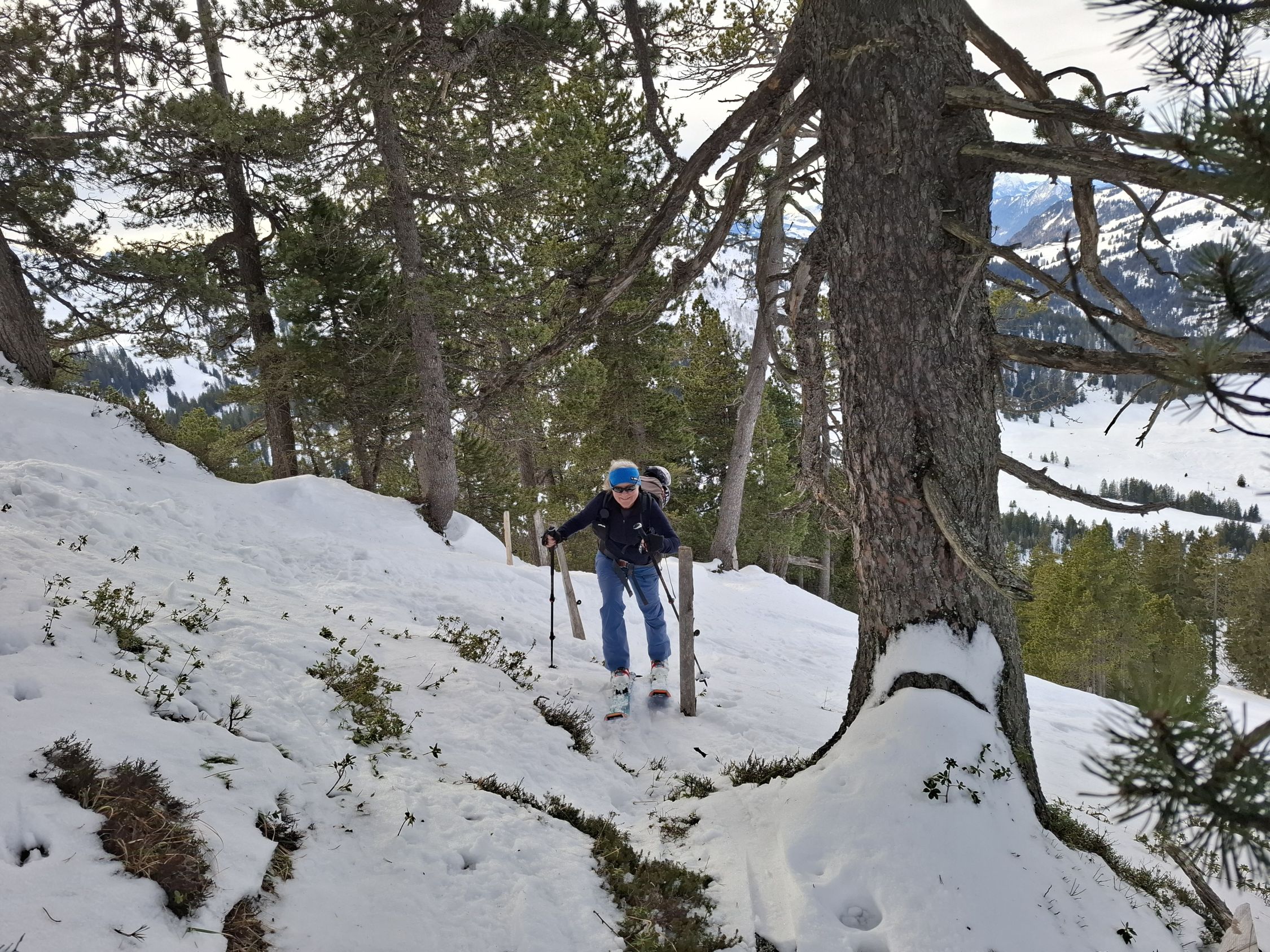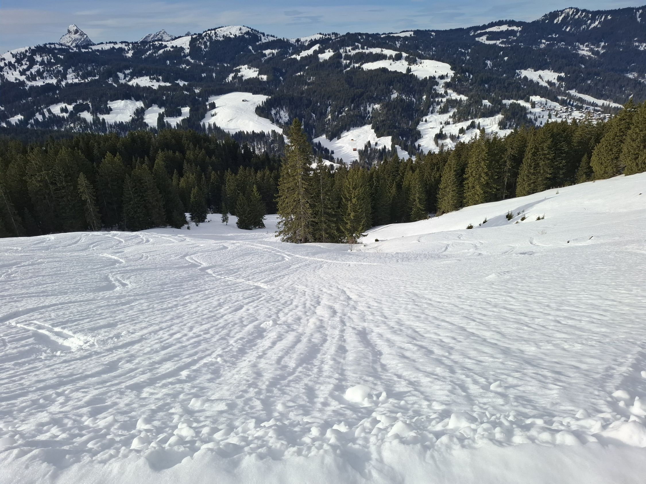 Der, 10 bis 15 cm tiefe, Nassschnee war ganz gut zu fahren. Unterhalb Unter Grossweid war zu wenig Schnee, also fuhren wir entlang der Strasse, bis zur Piste und auf dieser nach Oberiberg.
