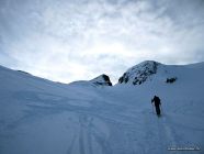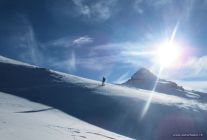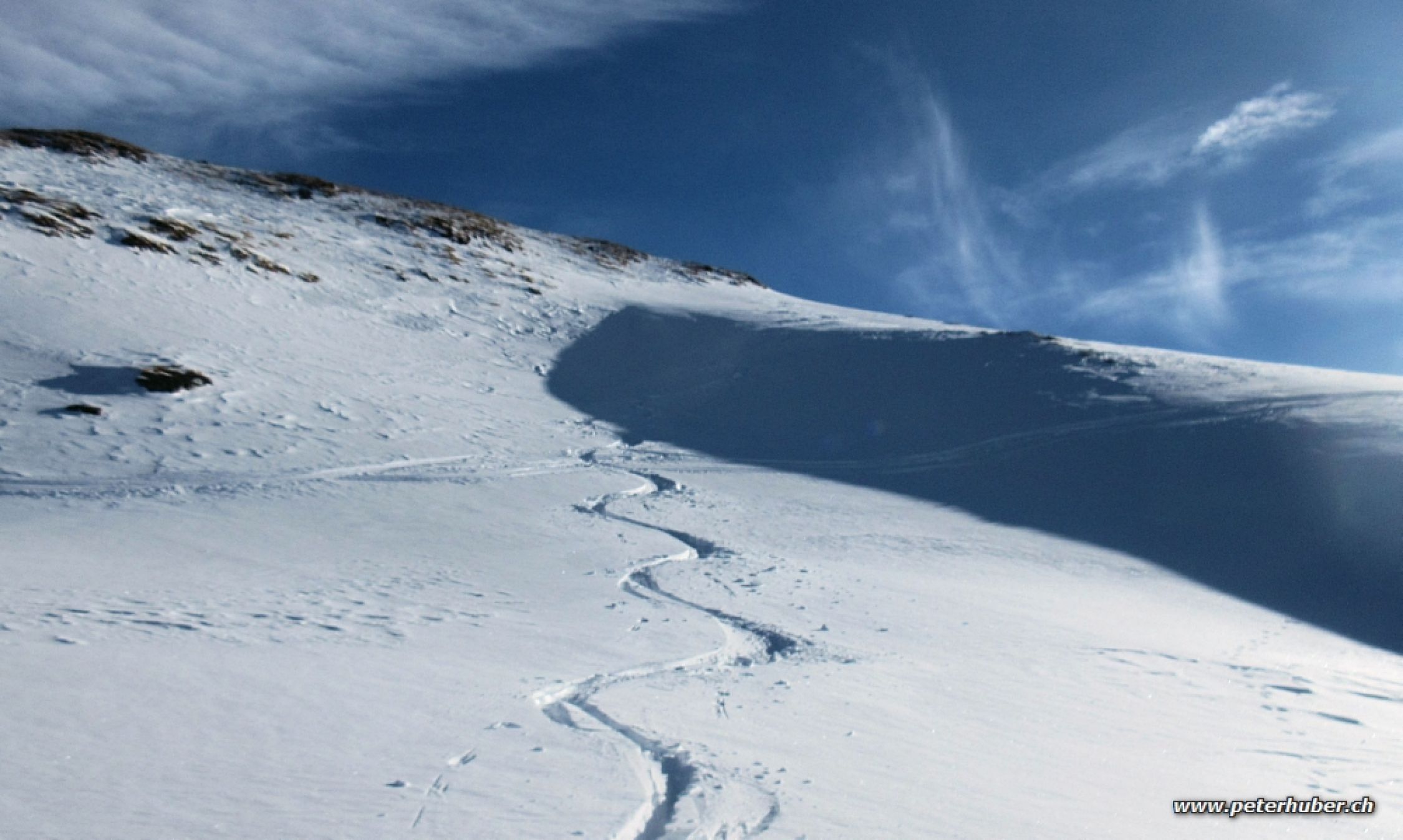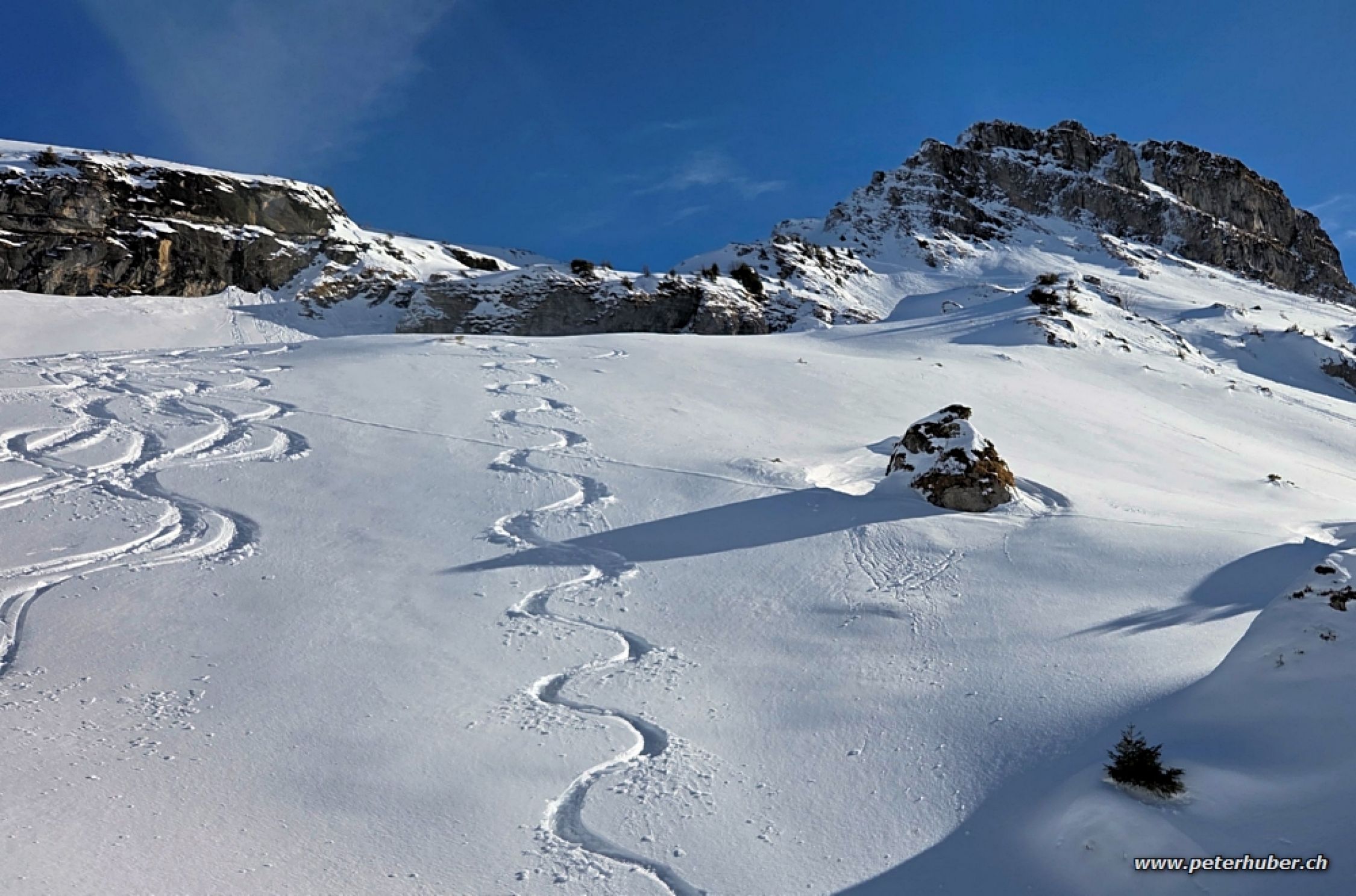 Abfahrt: Unter dem Skidepot zuerst ein Stück eisig. Dann in den Mulden mit leichtem Deckel schöner Pulverschnee. Immer schön von einer Mulde in die nächste wechseln. Dazwischen Gras und wenig Steine. Ganz unten toller feuchter Pulverschnee, schön zu fahren.