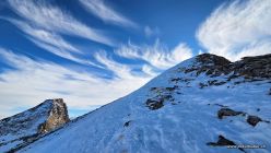 Morgens hohe Wolken und Schatten auf der ganzen Tour. Nur ganz oben etwas Wind. Auf dem Gipfel und bei der Abfahrt schöner Sonnenschein.