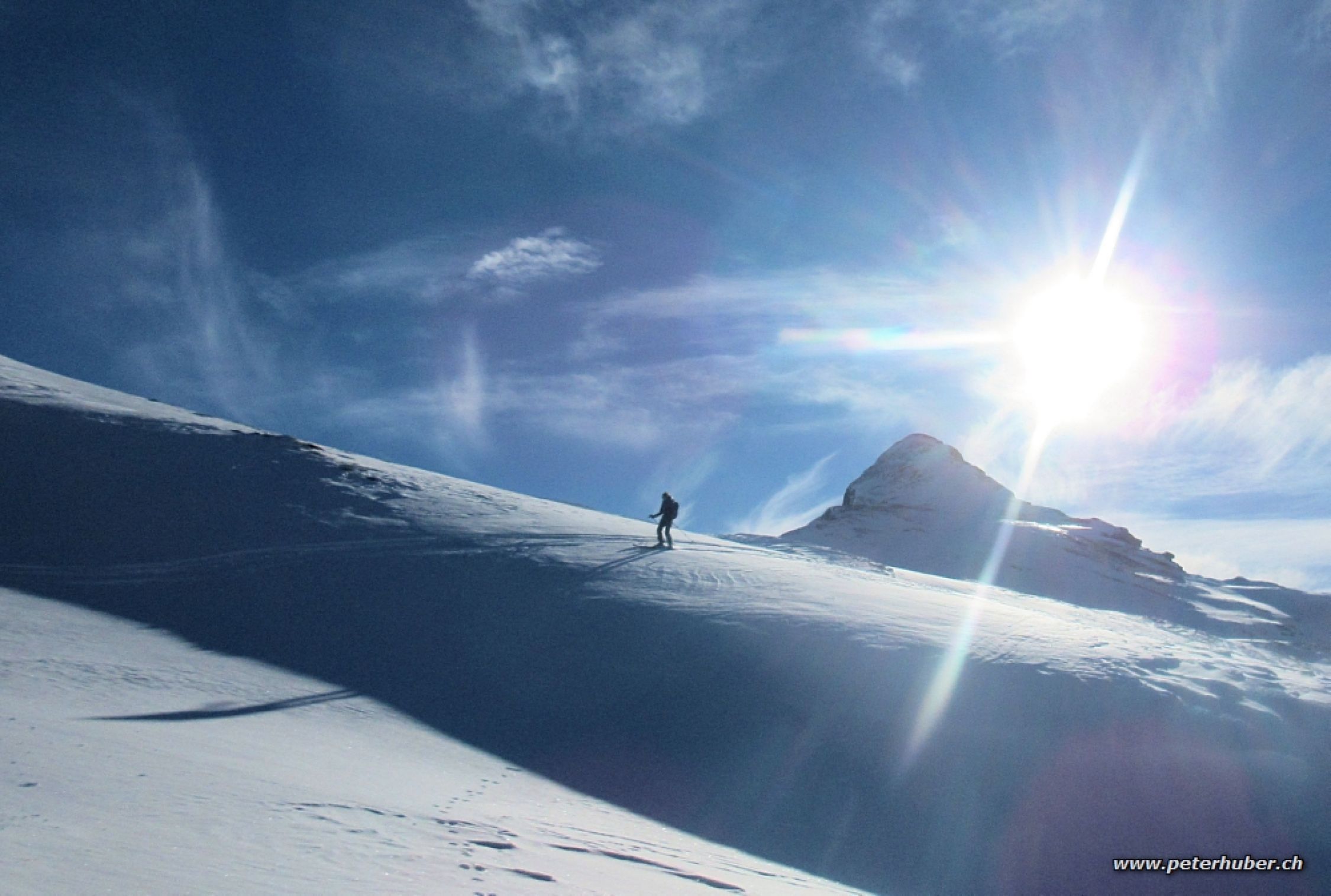 Bei der Bergstation hat es zirka 60 cm Schnee. Jedoch hat der Wind den Schnee mächtig verfrachtet. Viele Rücken und Kuppen sind aper. In den Mulden hat es genug Schnee für eine schöne Tour. Der Schnee war unten feucht, weiter oben pulverig und kompakt. Skidepot beim Wegweiser und mit guten Tritten zum Gipfel.
