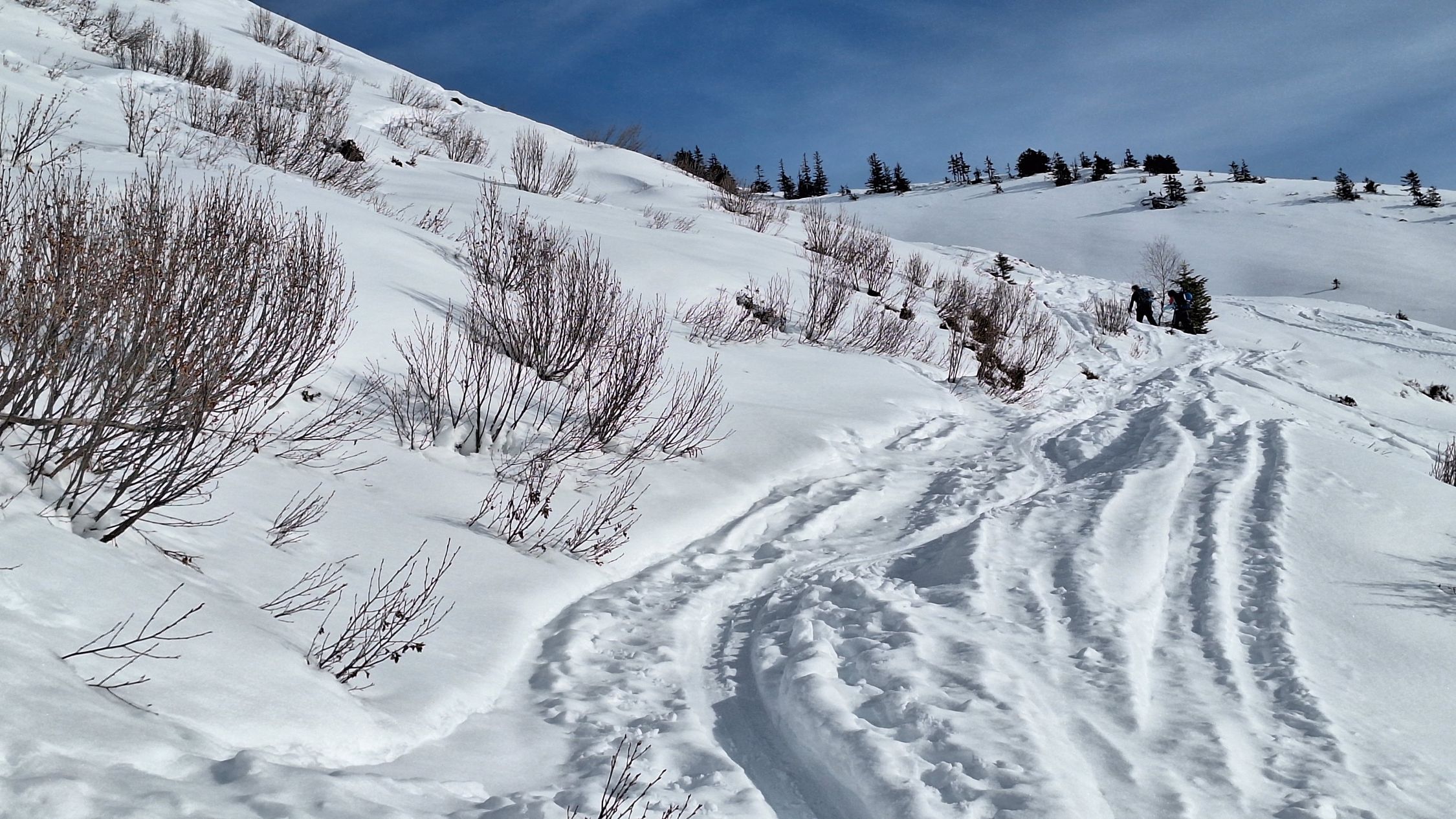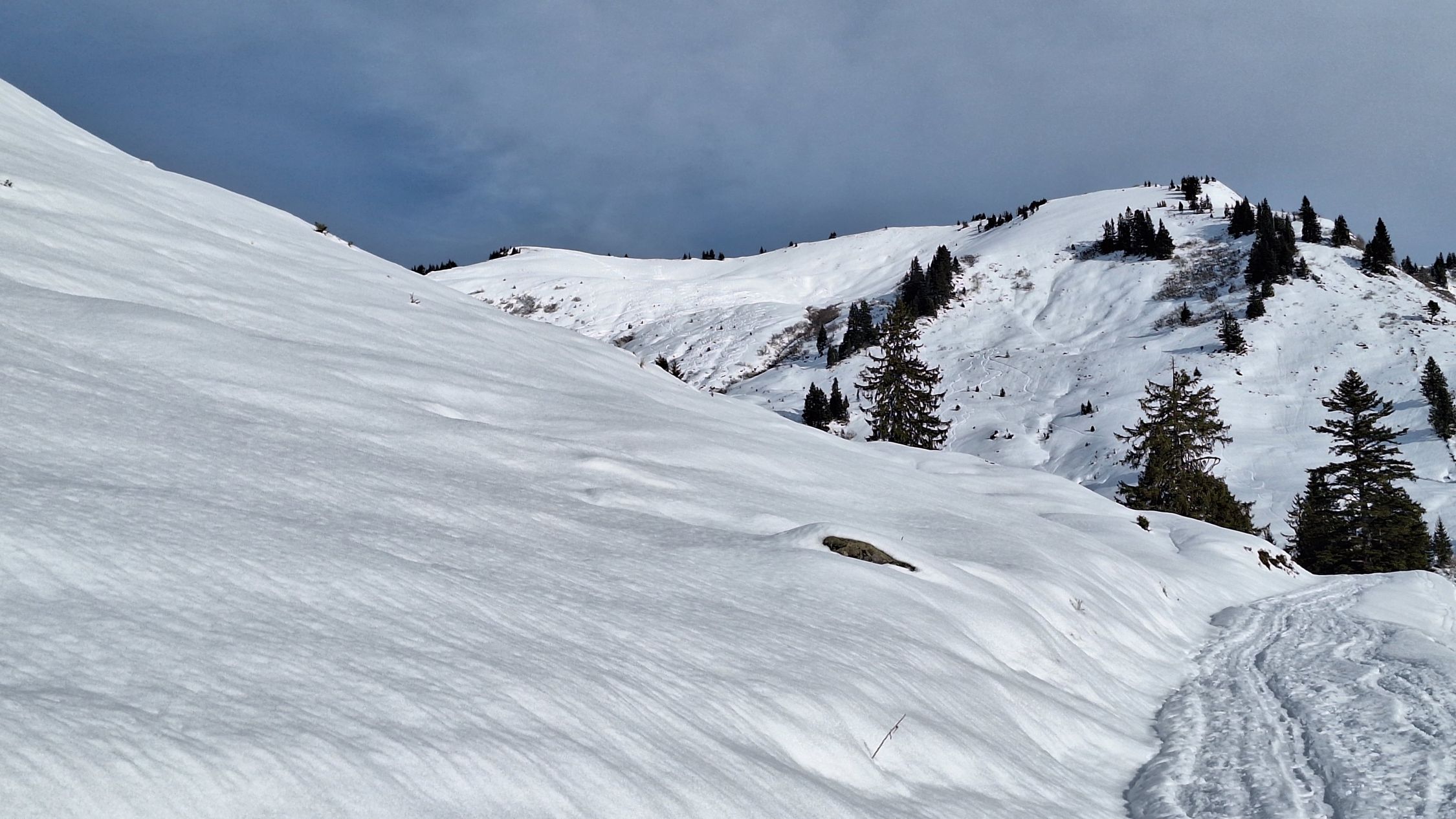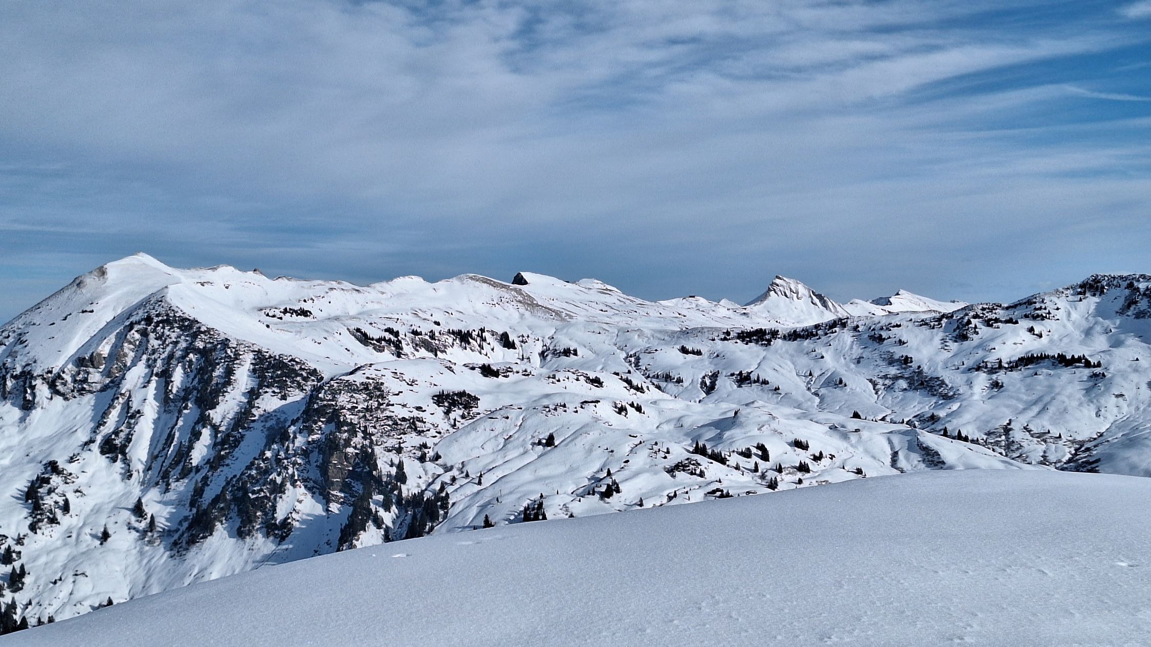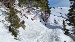 Ausreichend Schnee auf der Straße. Im Gelände reichts auch noch, aber nix übrigs - mit dem warmen Wetter wirds jeden Tag weniger. Abfahrt nicht wirklich ein Genuss. Schwerer Schnee von oben bis unten. Im flacheren Gelände noch Bruchharsch um 12 uhr. Sonst ein herrlicher Tag. Tolle Fernsicht.