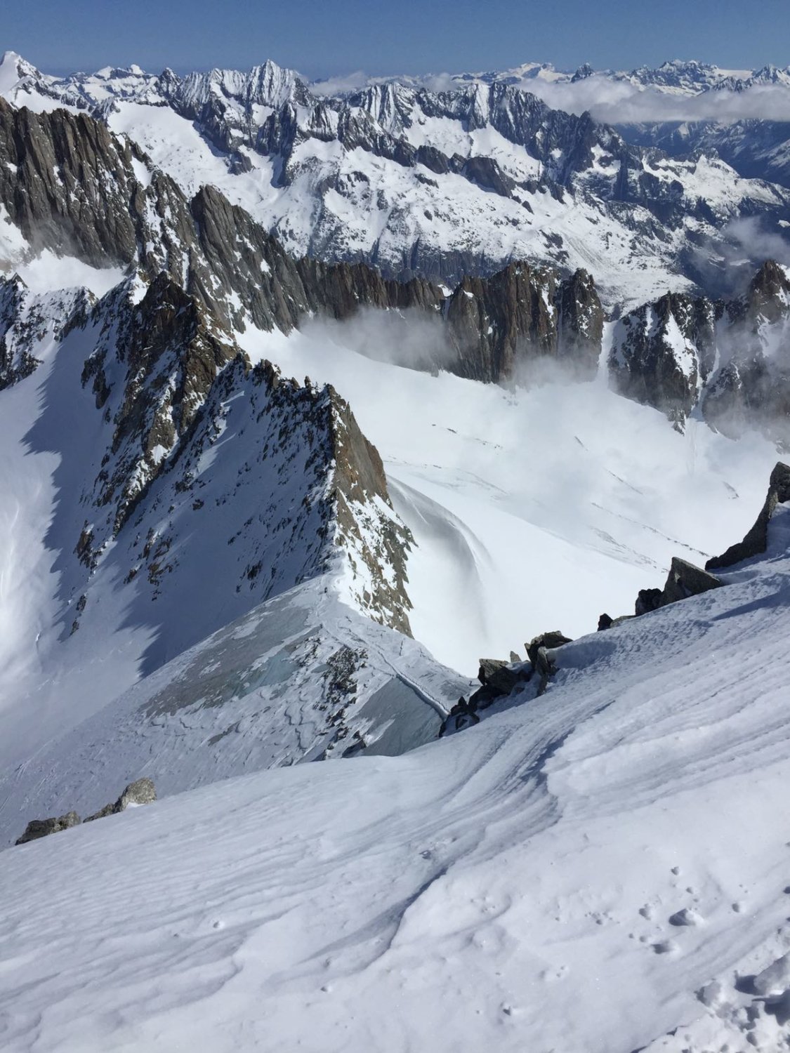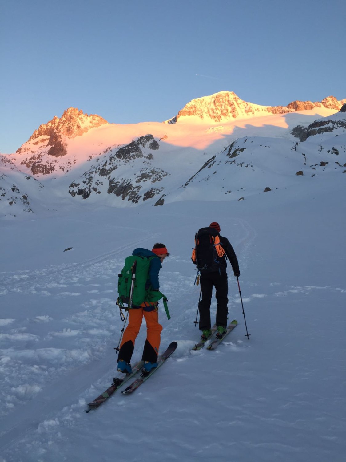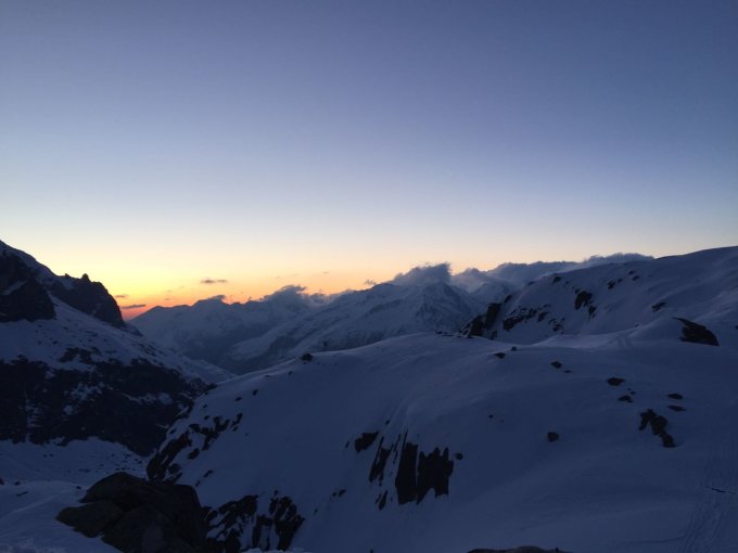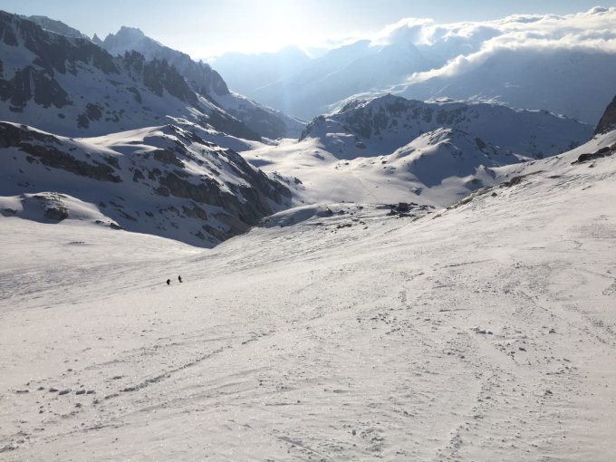 Das Gebiet ist noch relativ gut eingeschneit. Aufstieg guter Trittschnee vom Skidepot zum Pass auf dem Grat Trittschnee und Fels. Gute Verhältnisse. Schnee windbearbeitet aber sehr gut fahrbar. Leider hat uns der aufkommende Nebel die Abfahrt etwas vermiest. Das Ost-Culoir weist gute Verhältnisse auf aber ohne Sicht....