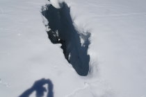 Weg zum gehen. Zwei grosse Querspalten stark offen, Weg suchen zum übersteigen.