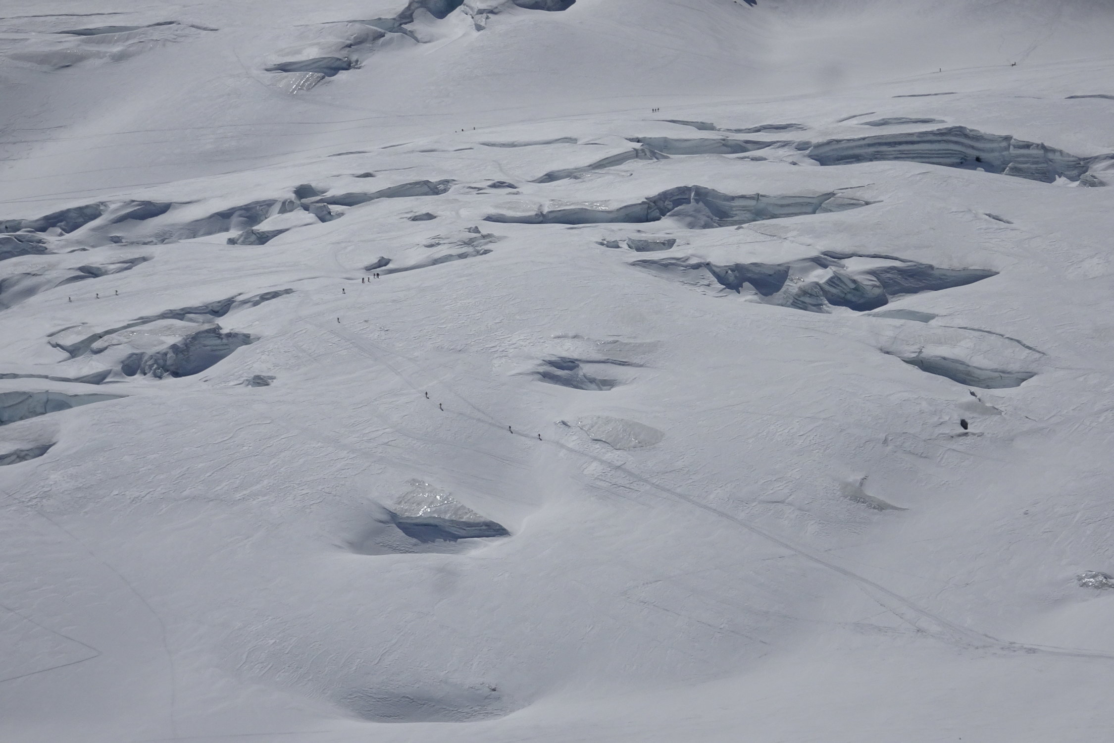 Sollte man, so wie wir, die Abfahrt wieder über Mont Blanc du Tacul nehmen, ist es gut sich den Hang ein bischen einzuprägen wegen der Spalten.