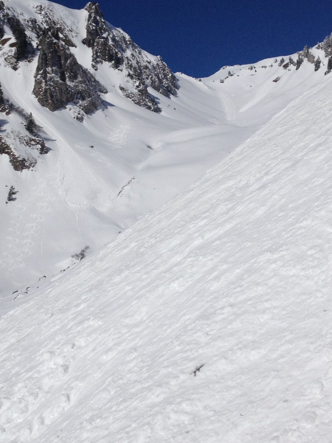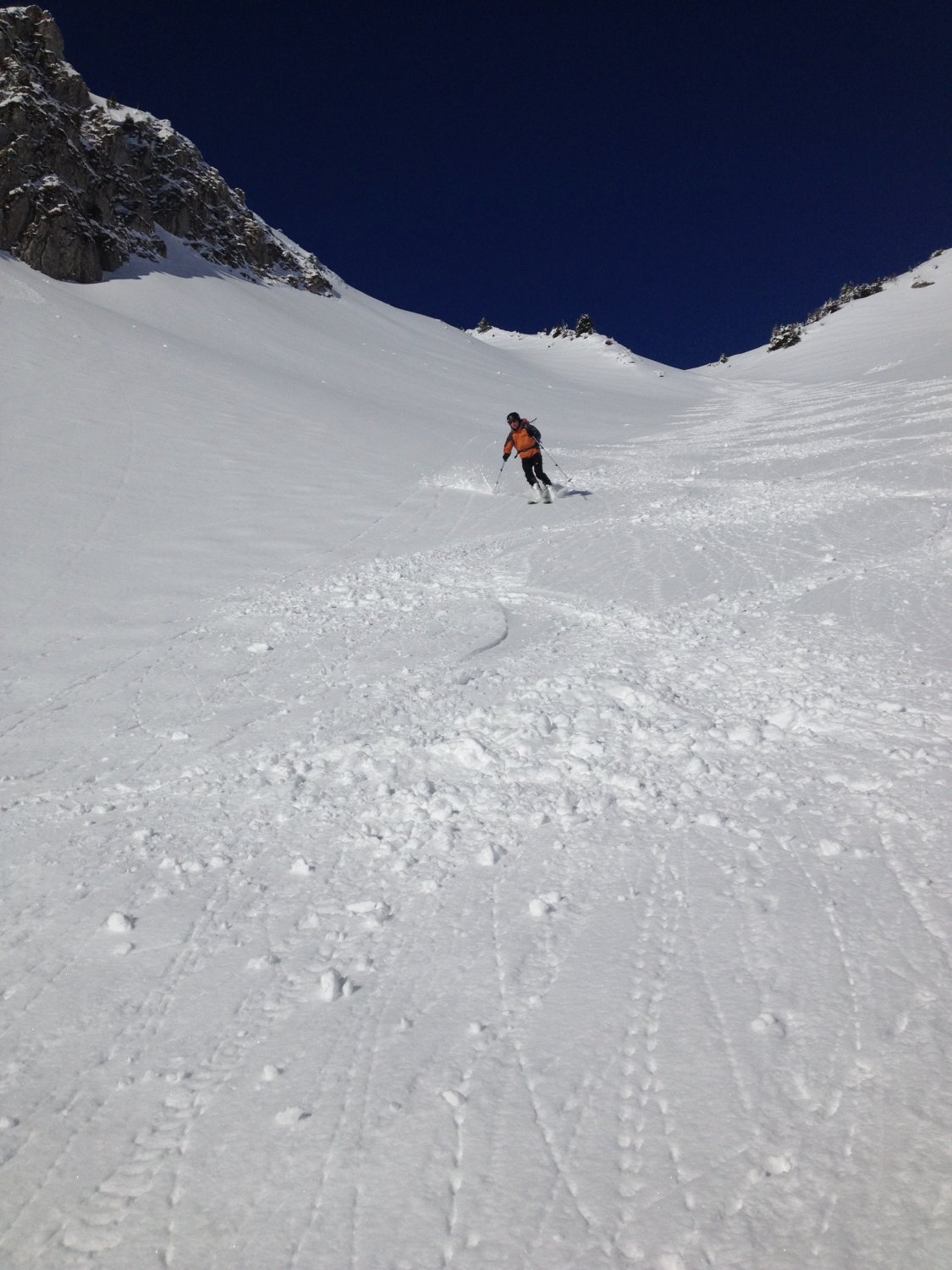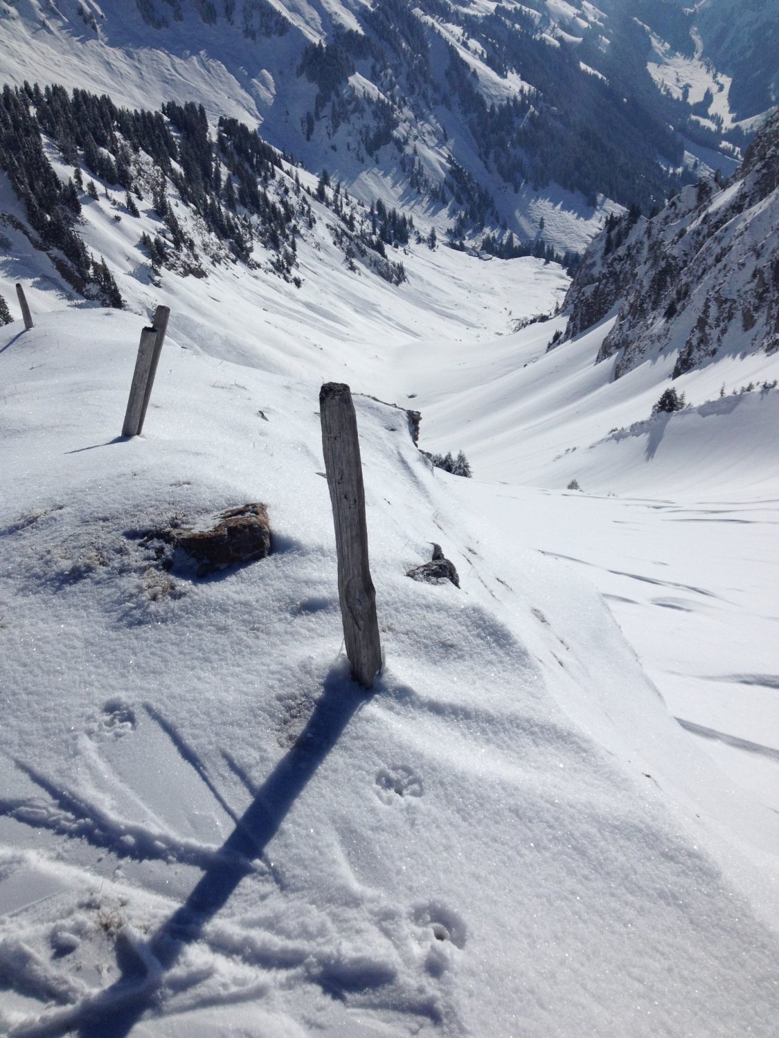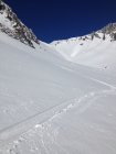 Unten im Talmattetäli gegen Mittelberg hat ein kleiner Lockerschneerutsch unsere Spuren zugedeckt. An den Südhängen des Tales und auch im Aufstieg dem Sommerweg entlang zur Wannenhütte überquert man kleine Lawinenkegel von Schneerutschen die bis auf die Grasnarbe abgerutscht sind. Es ist doch nicht mehr Januar...daher früh unterwegs sein.