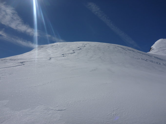 Aufstieg auf griffiger Spur. Sehr gute Spuranlage - perfekt vom Start bis zum Gipfel. Heute sogar mit den Skis bis zum Gipfel möglich. Am Anfang bei Start in Gitschen starker Wind, der sich verflachte. Auf dem Gipfel praktisch Windstill. Der angesagte Föhn liess zum Glück noch auf sich warten.
