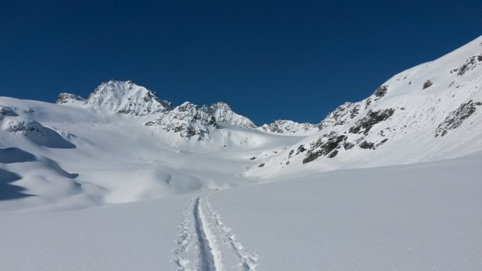 Bei der Abfahrt schon etwas schwererer Pulver. Das ist leider dem späten Frühstück (ab 7:00) geschuldet. Abfahrt auf 2560 und Aufstieg zur Gamsspitze.