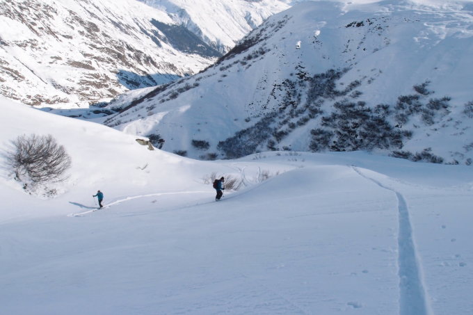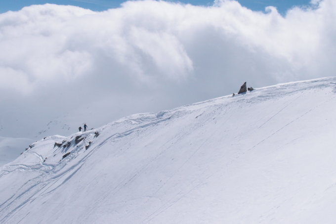 Ca. 40 cm gesetzter Pulverschnee. Leichter, aber schneidender Schmelzharschdeckel in sonnnenexponierten Lagen.