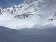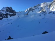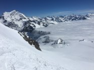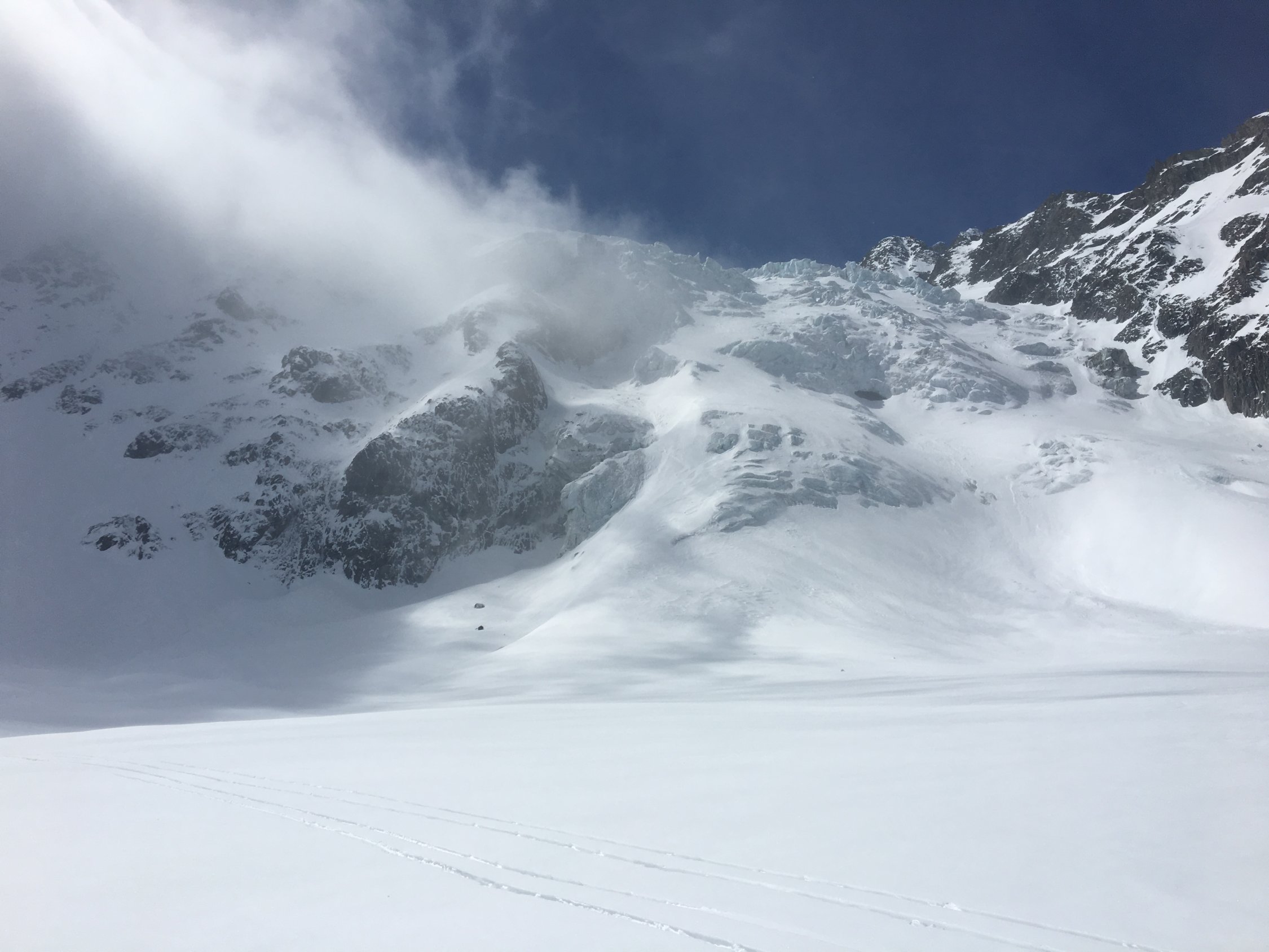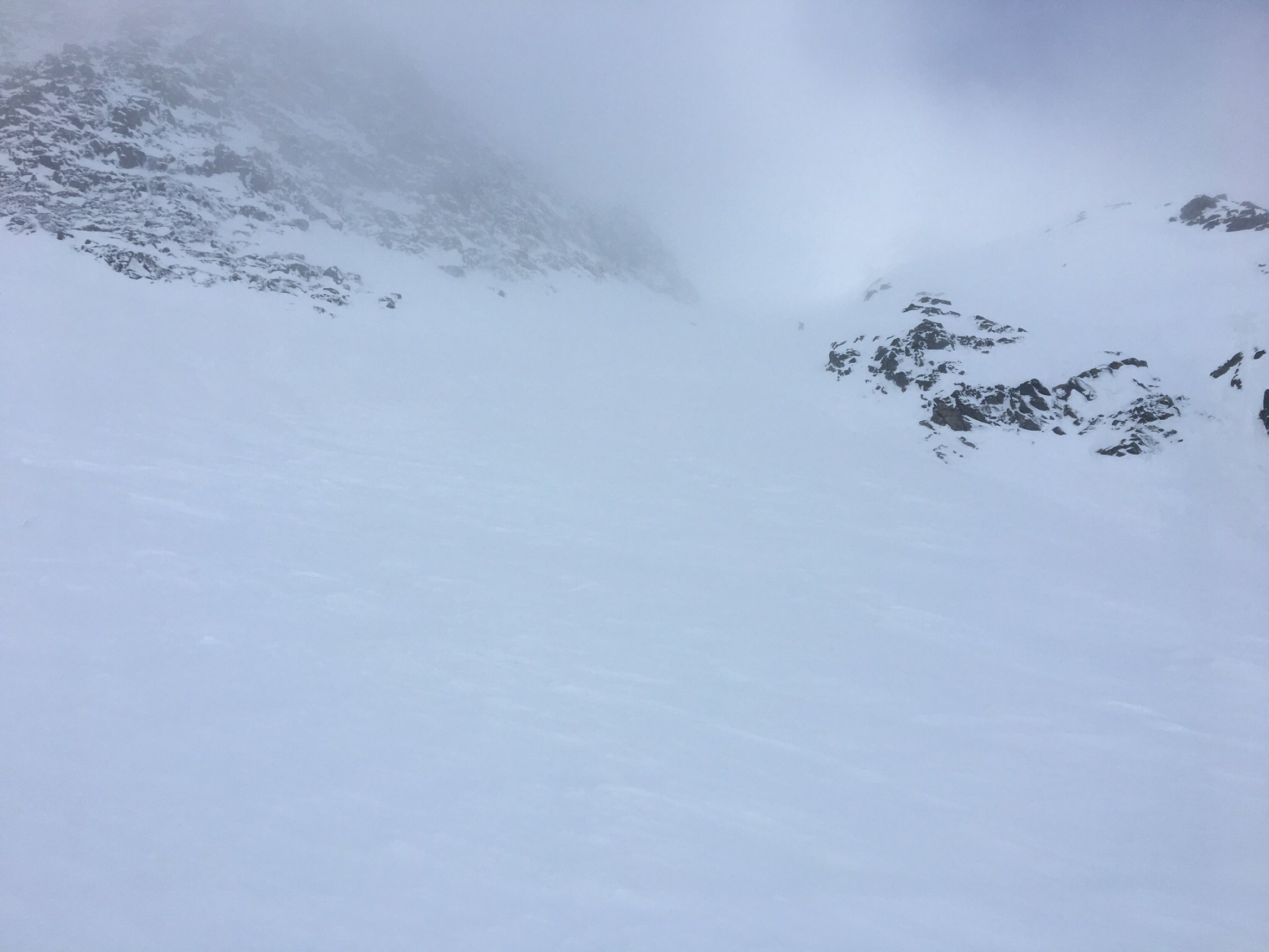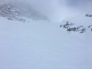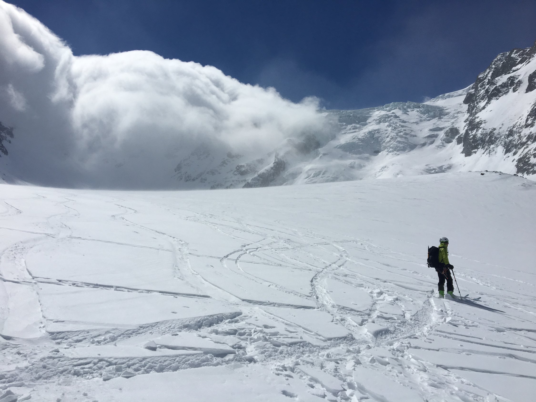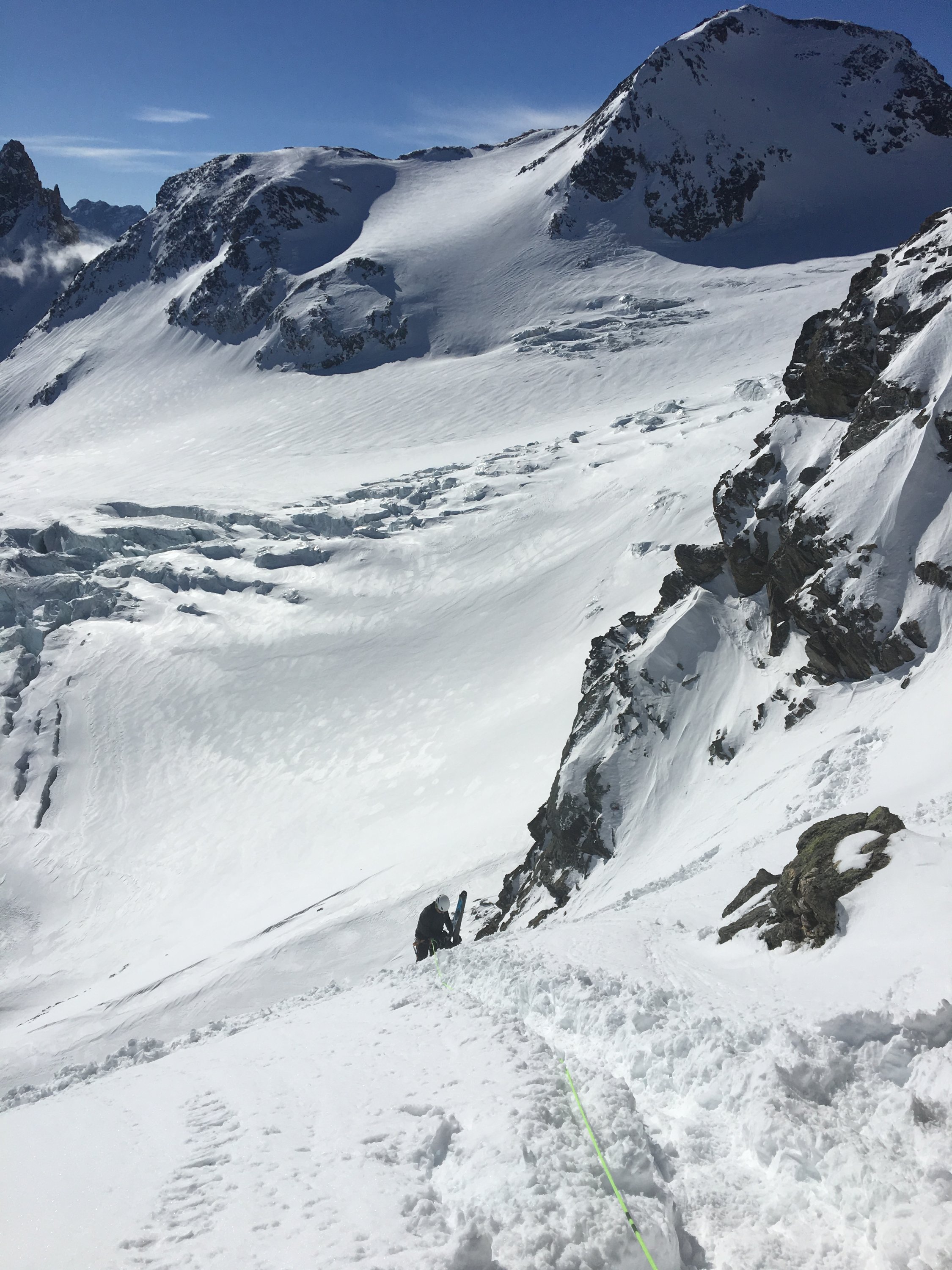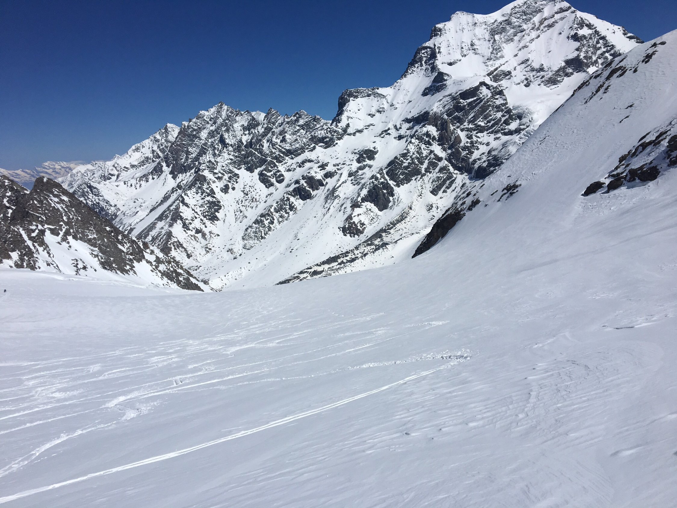 Aufgrund vielfach vorhandener Abfahrtsspuren und unkritischeren Einstufung der Lawinensituation (gemeldet 3) entschieden wir uns für die Abfahrt über den Valsorey Gletscher. Erstaunlich gute Verhältisse, Steilstufen wurden einzeln befahren. Lediglich im Bereich 3200 - 3000 m etwas Bruchharst, sonst recht schöner Pulver. Bei der Abfahrt ins Couloir drückte der Südföhn etwas Wolken in die Route, Sicht dadurch etwas eingeschränkt.