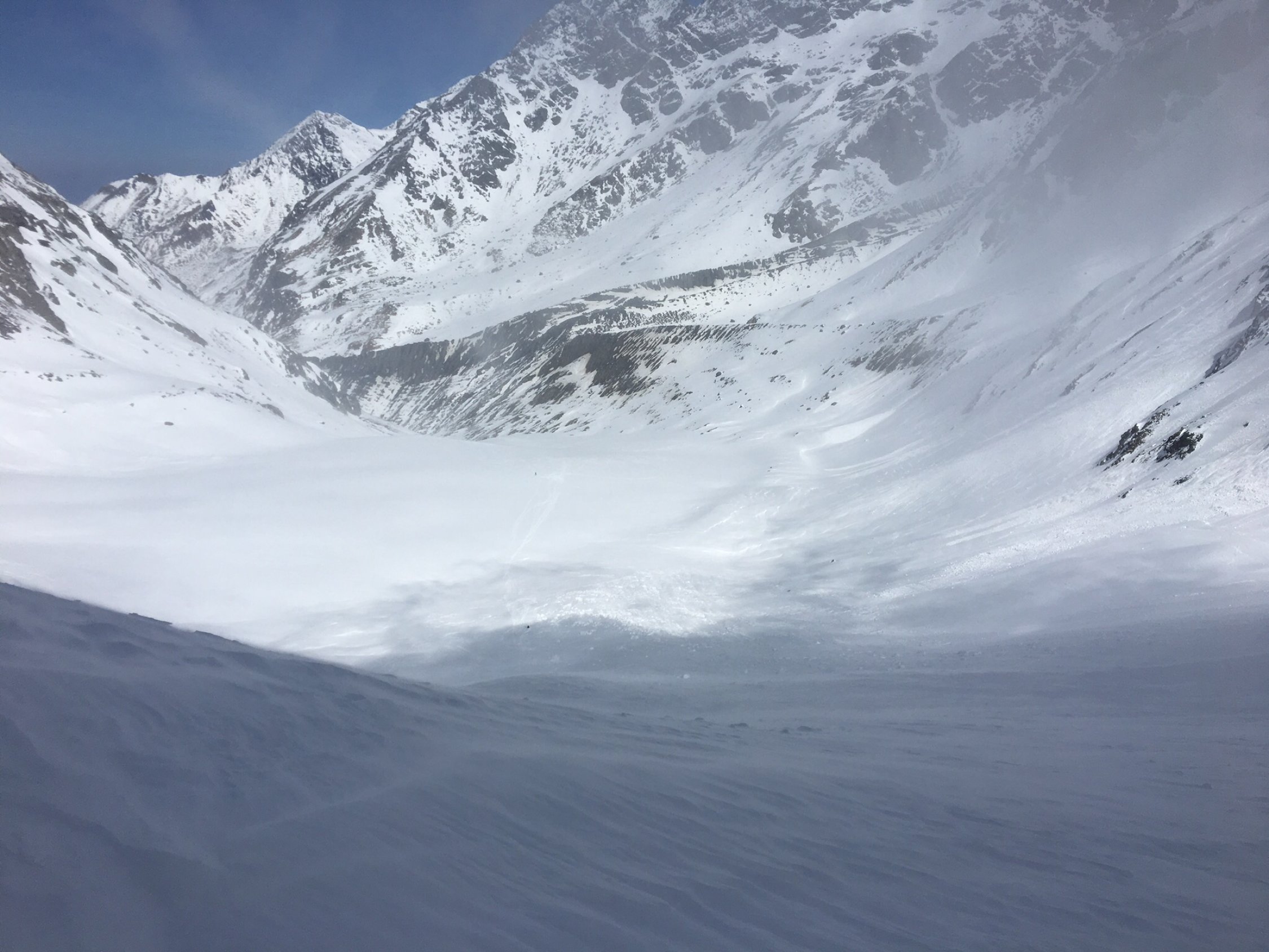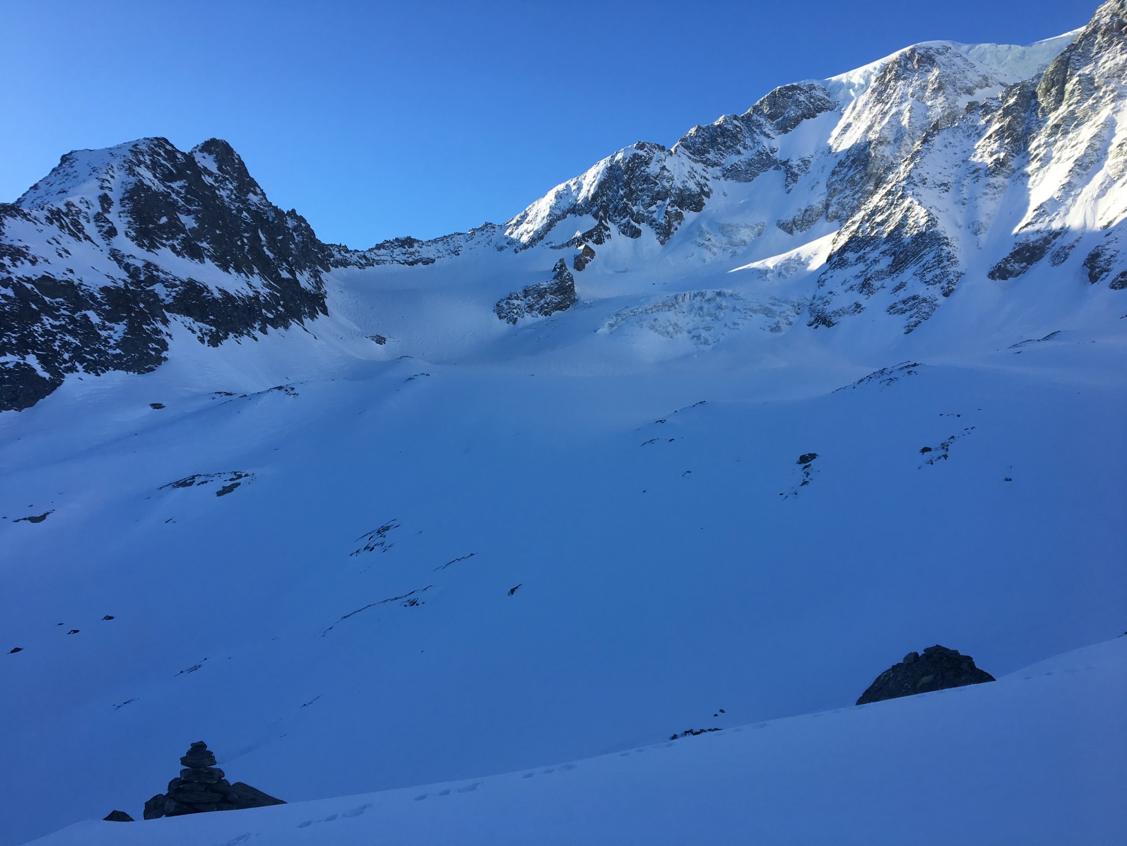 Nassschneerutsch nordseitig Col de la Gouille auf Aufstiegsspur vom 29.04., wahrscheinlich am 29.04. aus den Südhängen. Keine Schneebrettanrisse, keine Warnzeichen im Gebiet beobachtet.