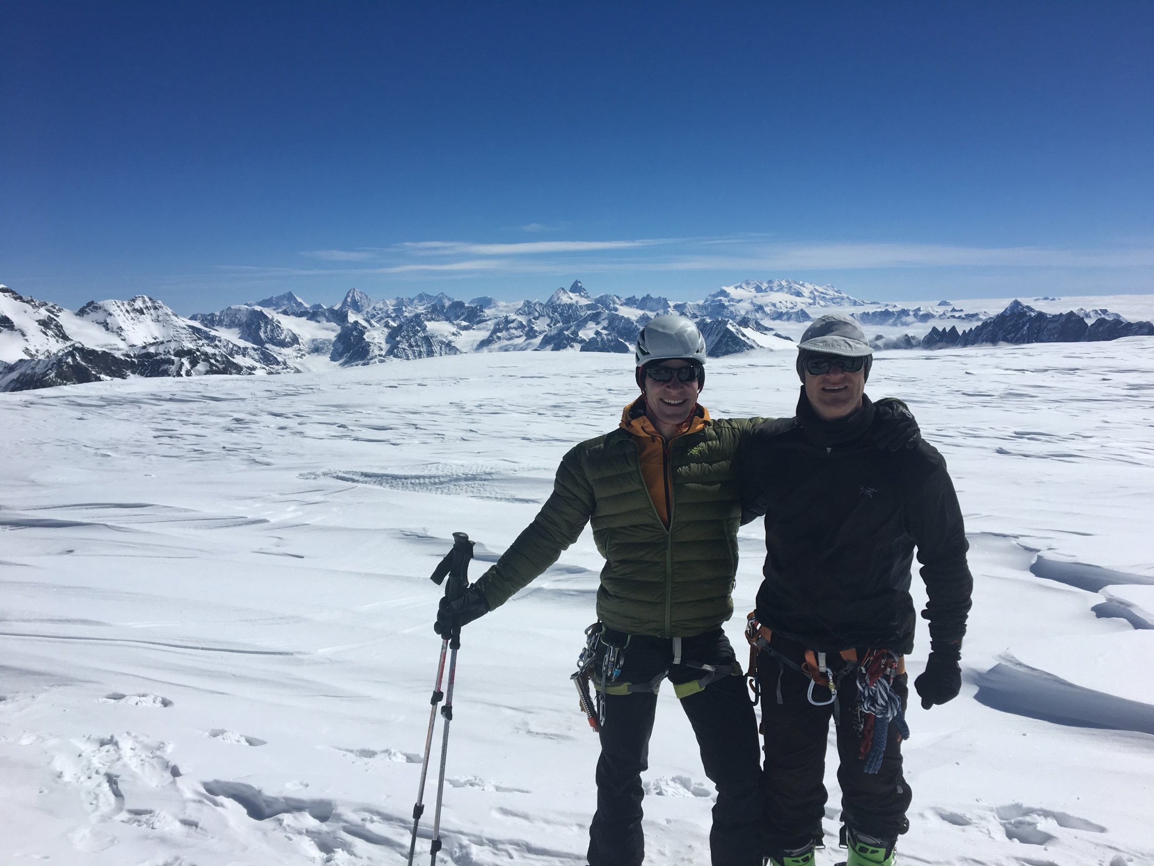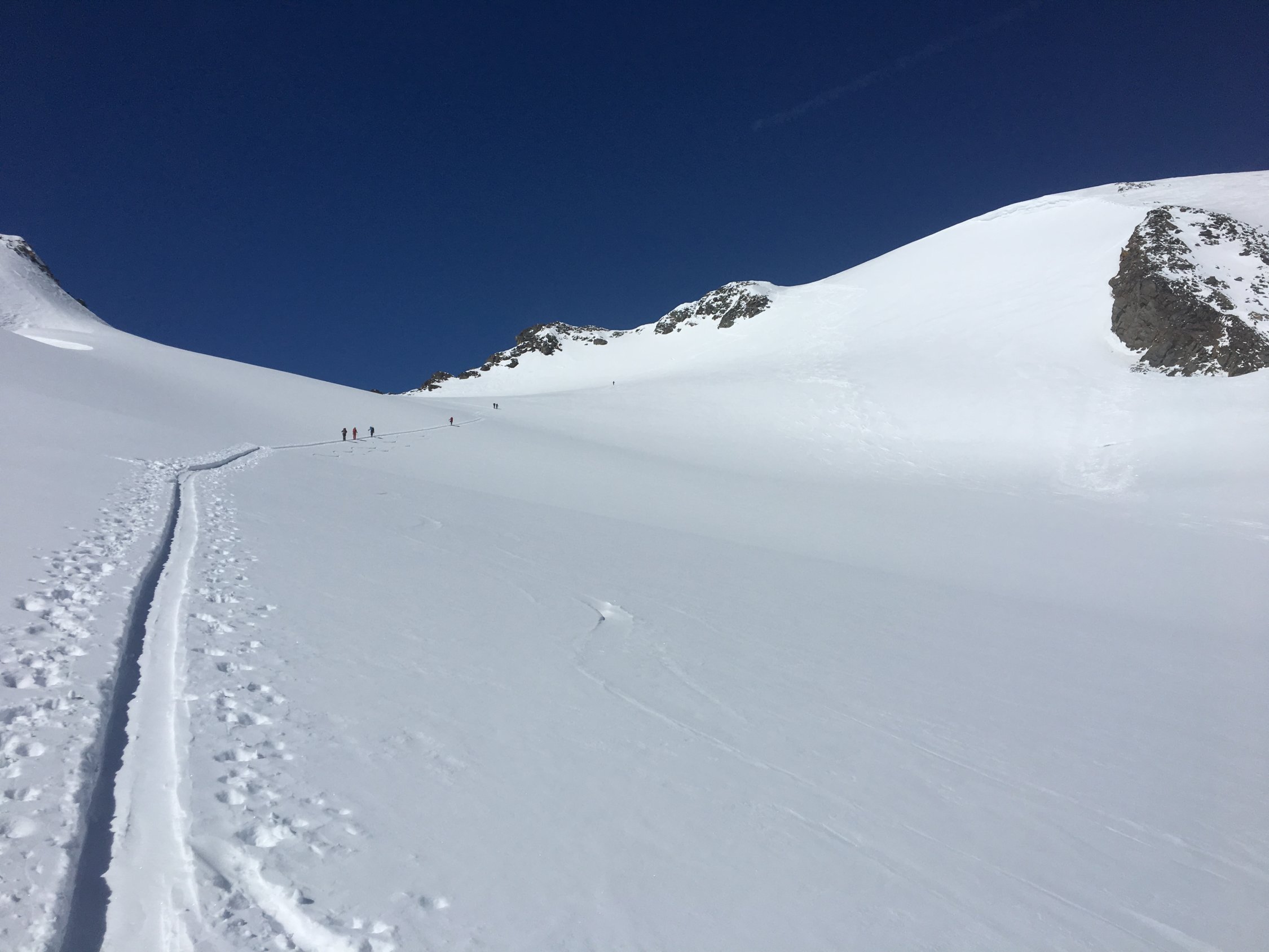Verhältnisse wesentlich besser als erwartet - sieht man von der etwa 90 minütigen Wanderung durch das Valsorey ab. Gute Spur über die Gletscher, keine offenen bzw. kritischen Spalten. Keine Schneebrettanrisse beobachtet, einige wenige Nassschneerutsche vom Vortag. Ketten westseitig Col de la Gouile frei, ostseitig vollständig schneebedeckt. Abstieg steil (45 Grad über 45 Hm) mit Steigeisen&Pickel. Plateau auf 3500 m apert an der Flanke aus, Spur bereits nahe am Blankeis.
