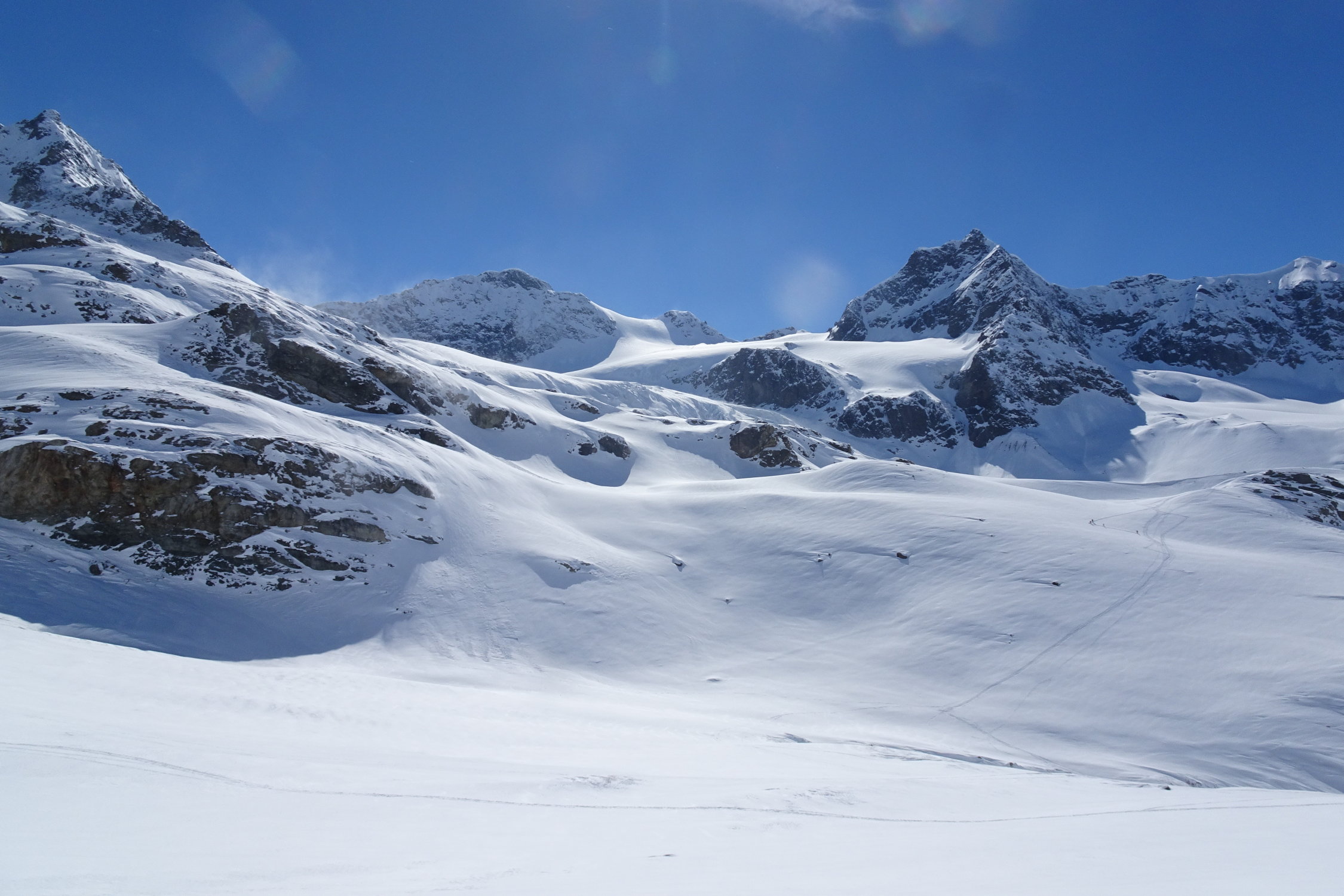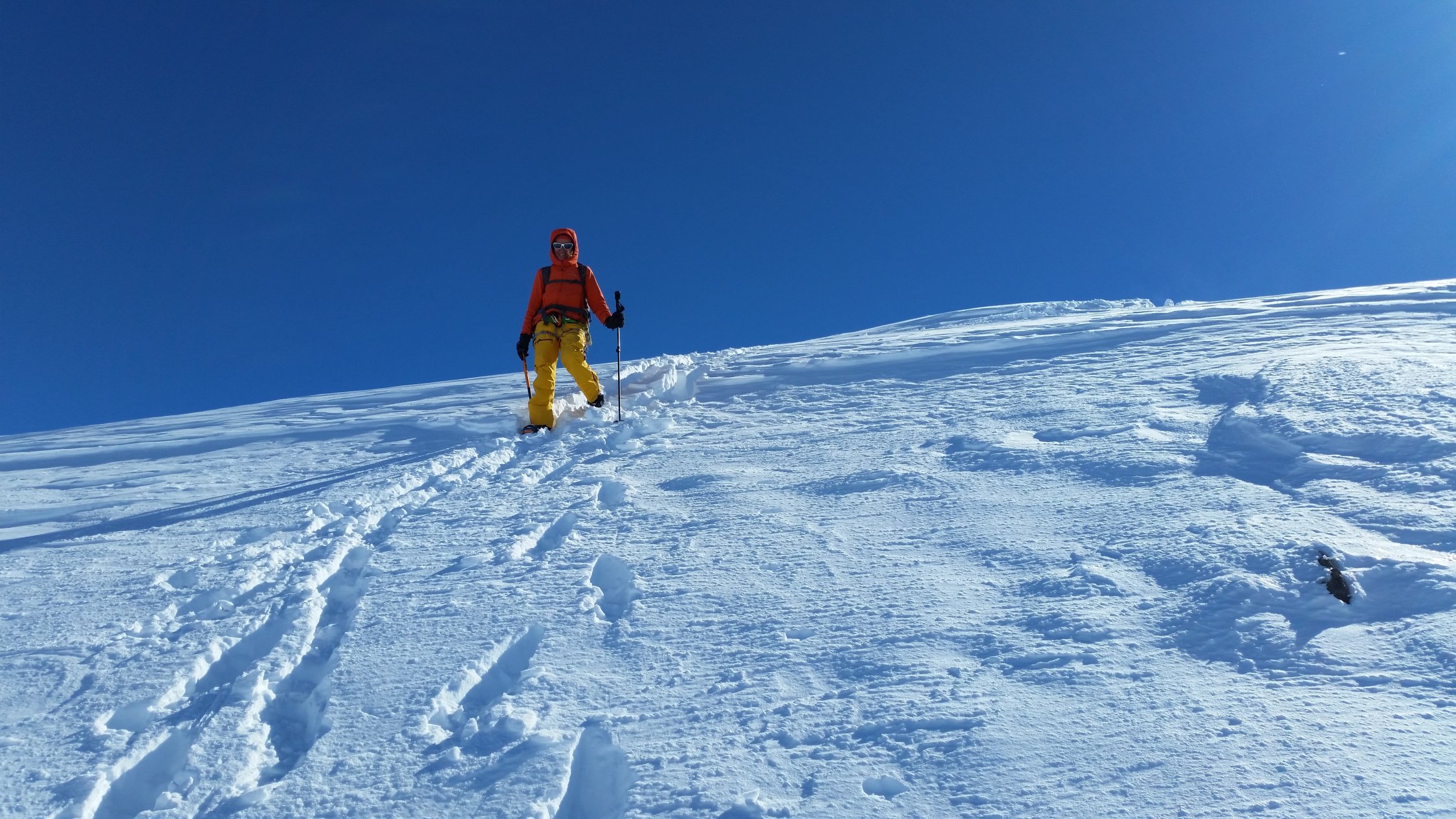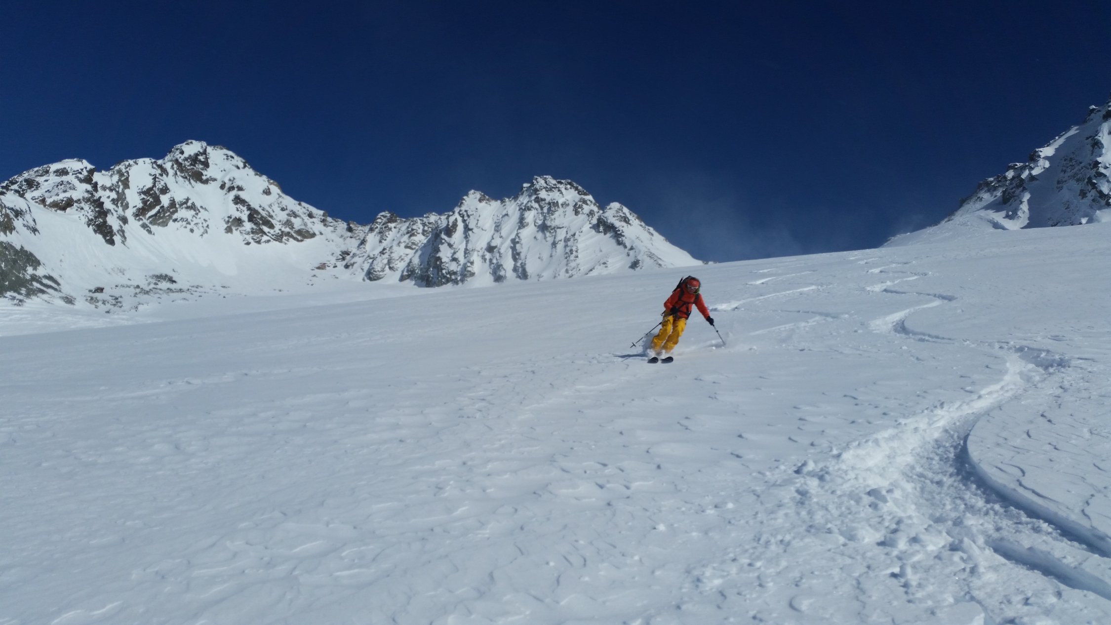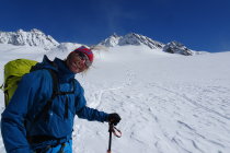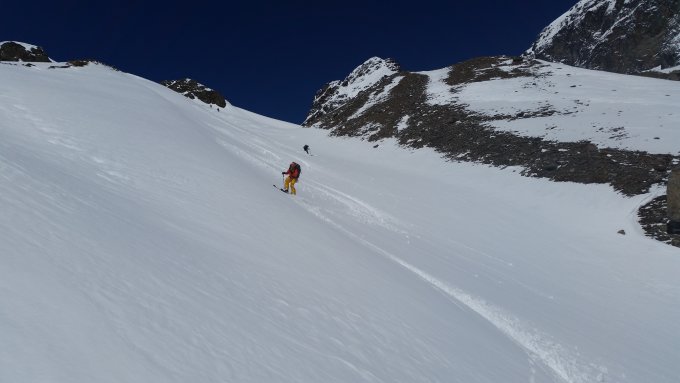 Ab Toui Hütte weiterer Aufstieg zum Vermuntpass in Sulzschnee (hier wird der Schnee langsam magerer). Ab Vermuntpass in östliche Richtung bis Skidepot Piz Mon. Abfahrt erst in schönen Pulver und die letzten Meter in weichem Schnee zur Wiesbadner Hütte.