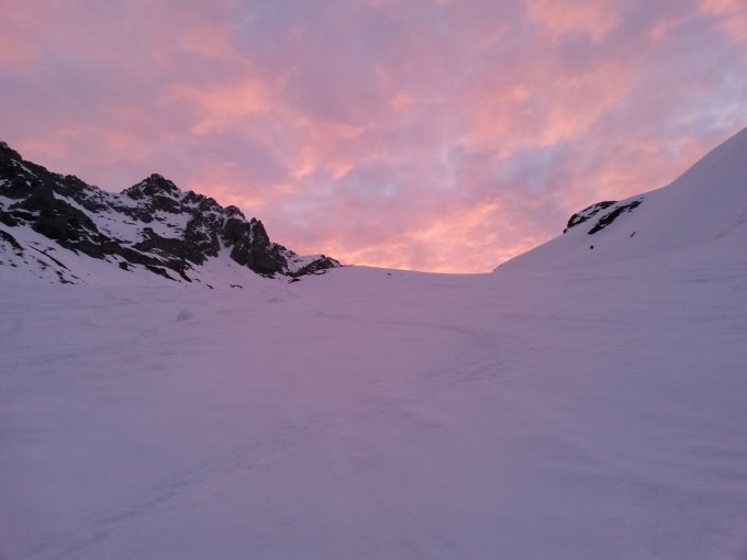 Nach der ersten Biegung Schnee gut durchgefroren. Wolkig. Am Gipfel sogar sonnig.Erste steile Rinne zum Gipfel hochgestiegen , oberber Teil zu Fuß. Gute Tritte. Direkte Abfahrt vom Gipfel, steil aber griffig. Danach perfekte Abfahrt. Austieg zur Schindlerspitze und direkte steile Abfahrt nach Norden und gute Piste bis zum Auto.