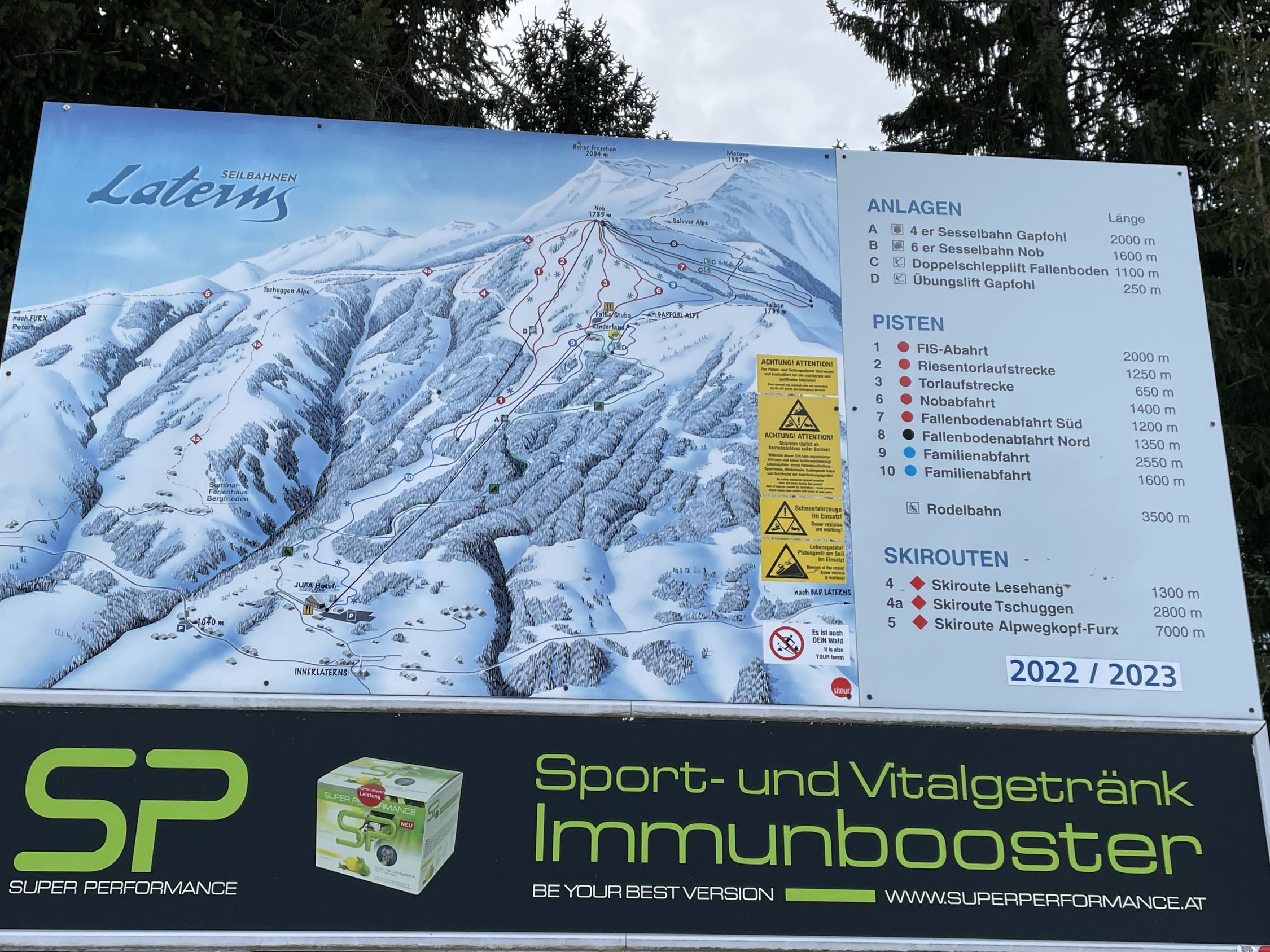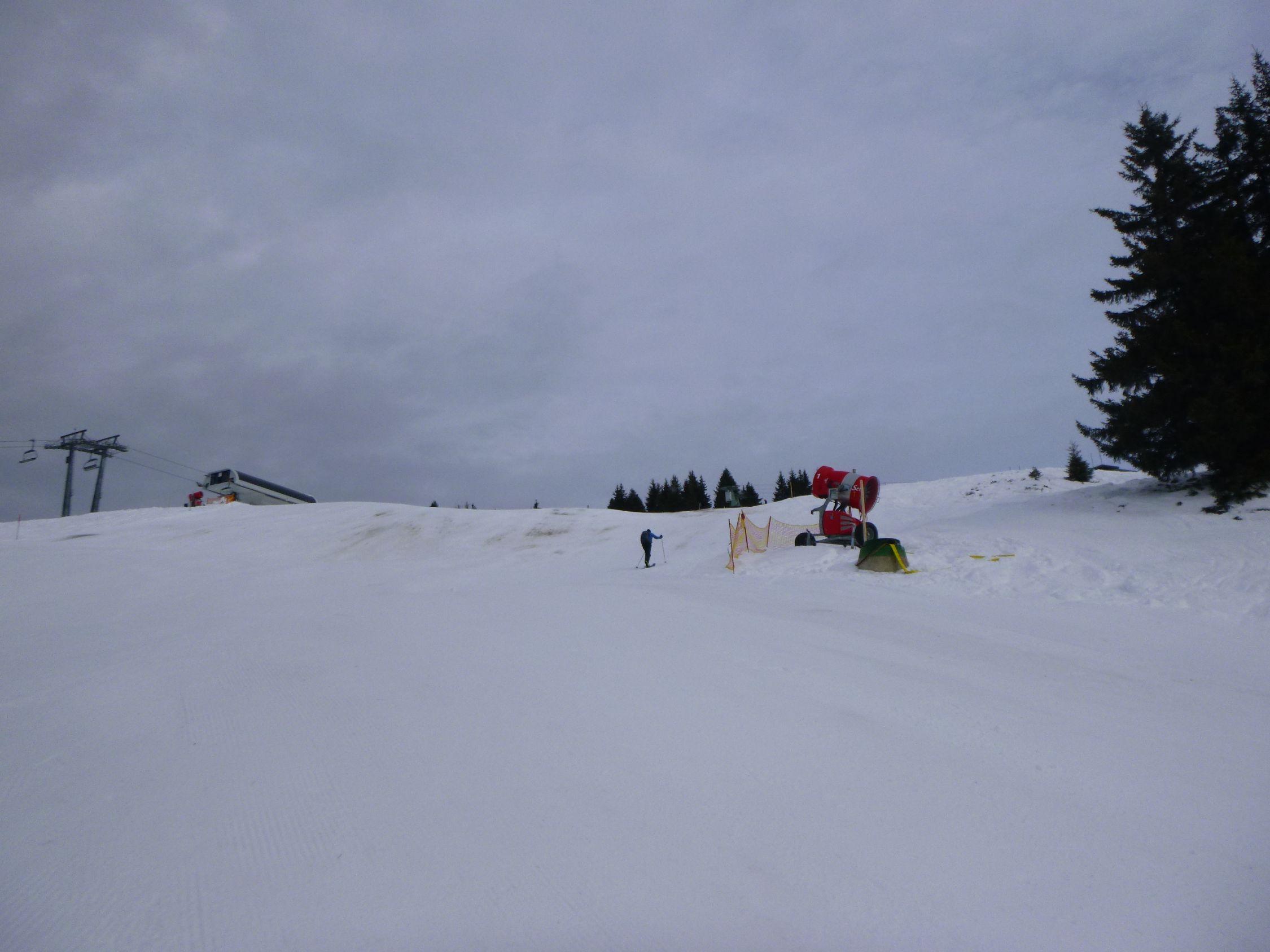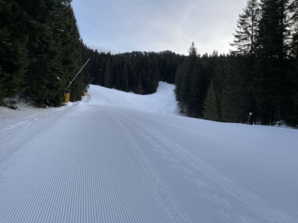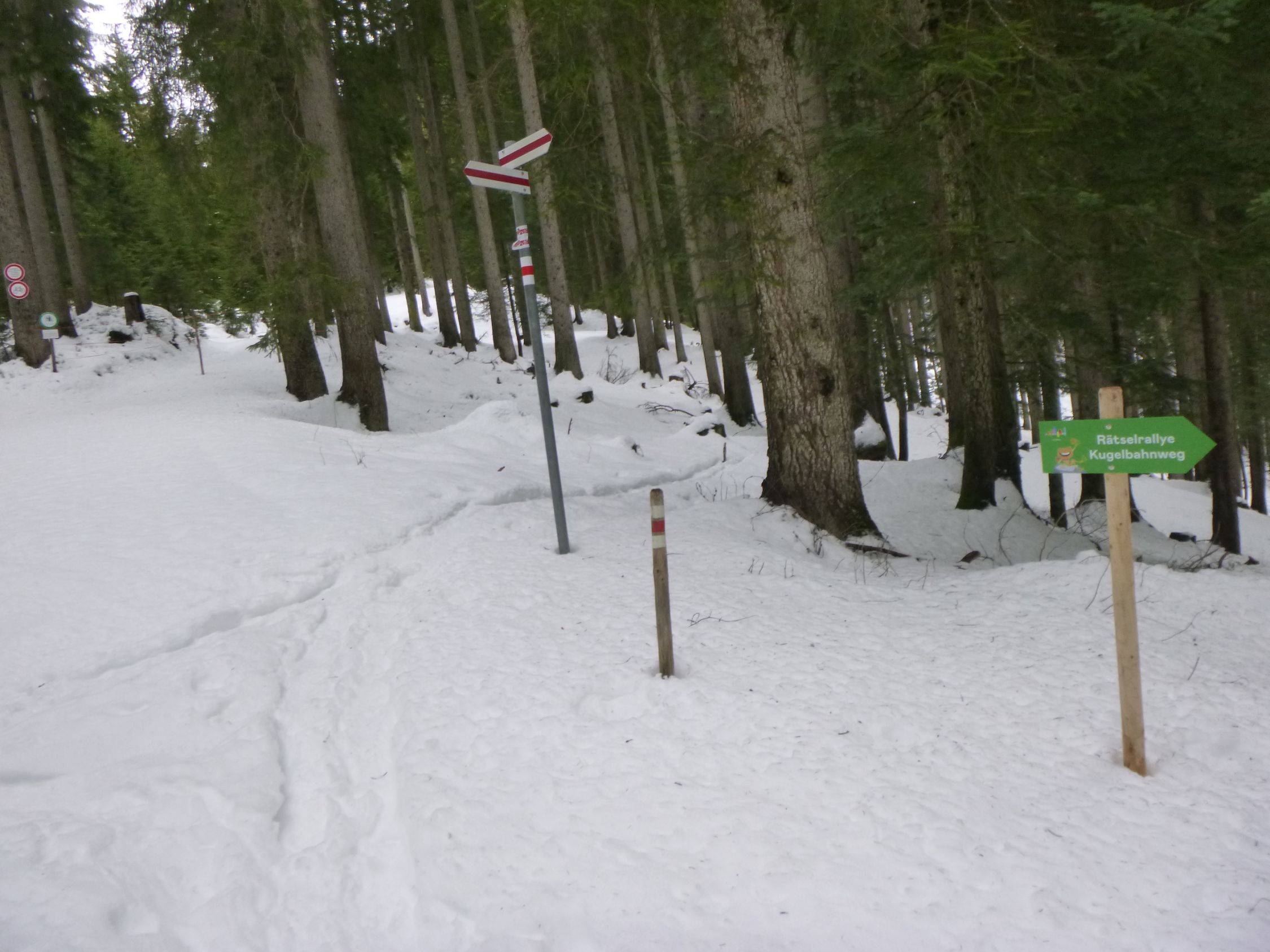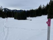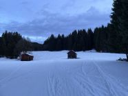 Tourenbeginn um 07:30 Uhr bei +2°C unter bedecktem Himmel, gegen Mittag kam die Sonne dann immer mehr durch. Schneeschuhe konnte man noch an der Bushaltestelle anschnallen. Der untere ehemalige FIS-Hang trug noch 10 cm Schnee, der allerdings ab Mittag schon aufgeweicht und von vielen Tourenskifahrern in den letzten Tagen ziemlich abgefahren war. Im Bereich der Falba-Stuba beträgt die Schneehöhe ca. 25 cm an unverspurten Stellen.