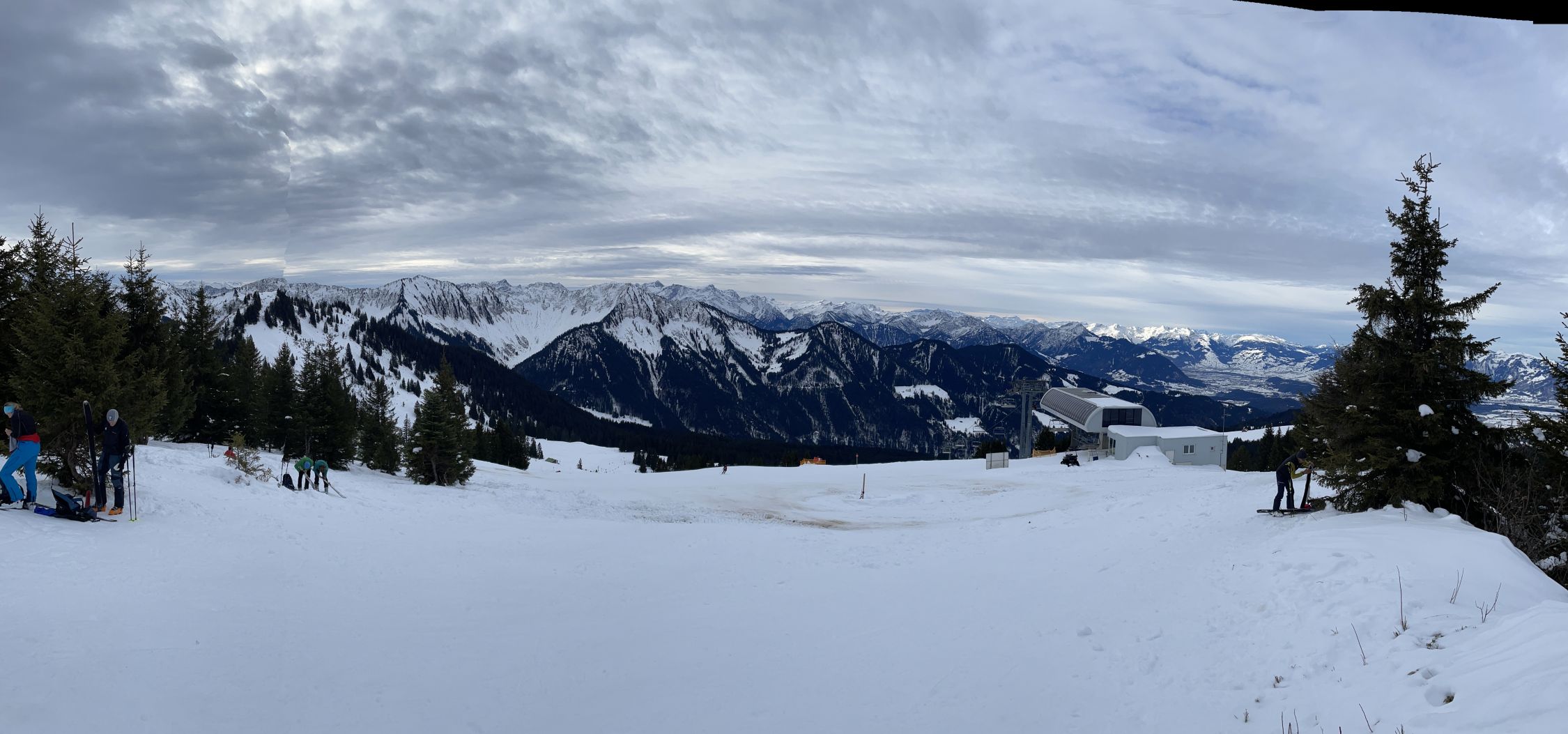 Vom Gipfel sieht zum nahen Freschen und zur Hohen Matona im Norden. Im Süden sieht man die Bergspitzen des großen Walsertals, im Westen das Rheintal und dahinter den Alpstein, im Nordwesten Teile vom Bodensee.