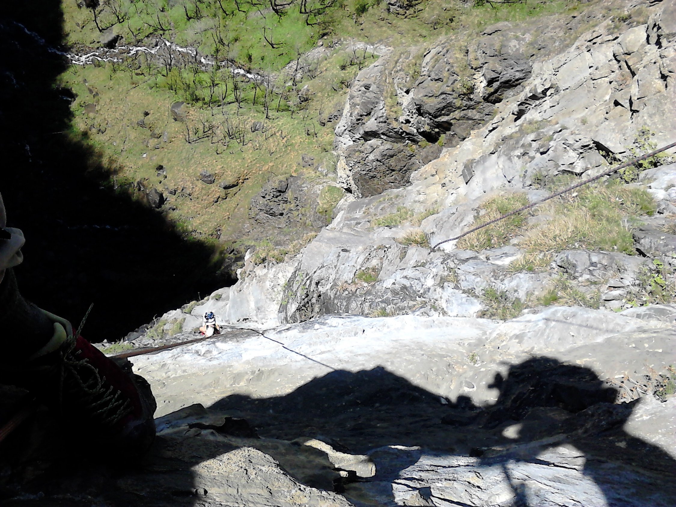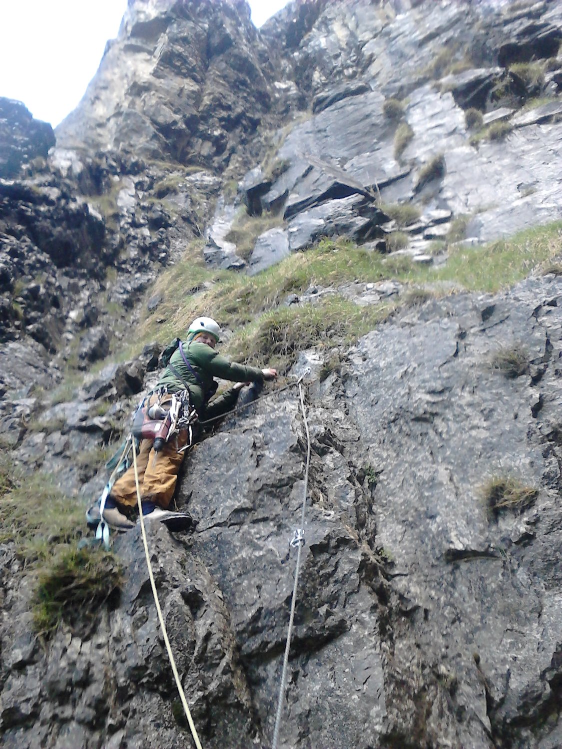 Am Dienstag 2. Mai begannen Jan und ich unser MSL-Kletterprojekt an der linken Felswand der untersten Stufe der Serenbachfälle. Mit klammen Fingern bohrte ich "meinen" ersten Bolt für die 1. Kletterseilläng so hoch wie möglich über dem Stand. Schon nach 15m und einigen Bohr-, Turn-, Friend- und Hookübungen war ich so erschöpft, dass ich den Löffel/bzw. das Bohrmaschinchen an Jan abgeben musste. Er vollendete diese ca. 35m-SL in meisterlicher Manier, denn es folgt nun zwar nicht mehr ganz so steiles Gelände, aber ohne Möglichkeiten für Klemmgeräte, zudem immer wieder leicht brüchig und auch für Hooks heikel.