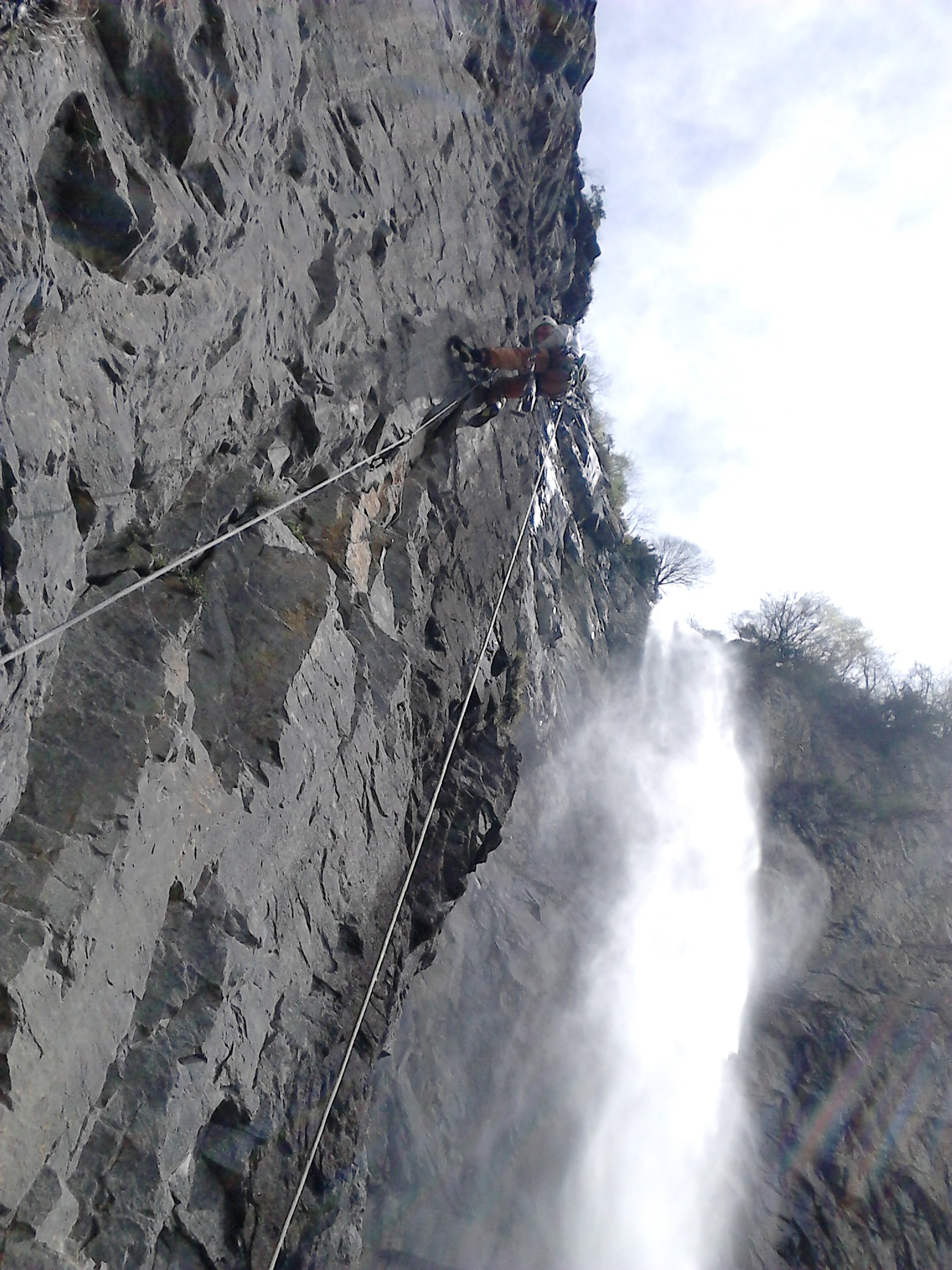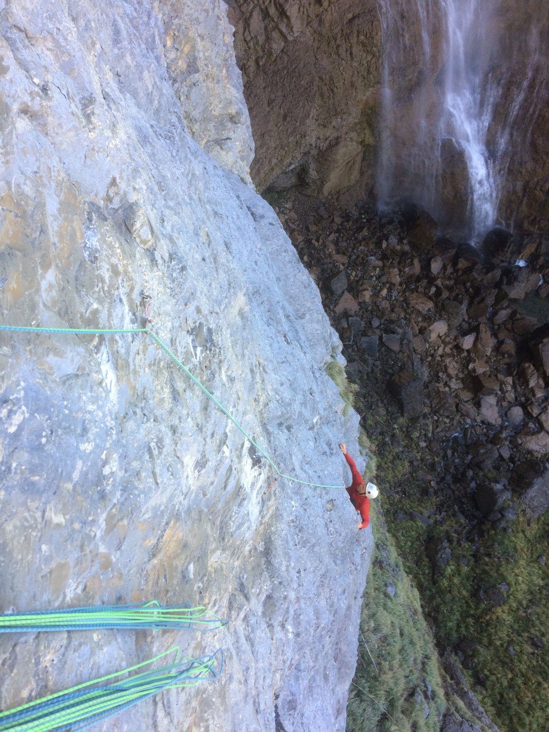 Noch gibt es entlang der Route viel zu putzen; einen mühsamen Fallout-Belag des Wasserfalls, vermutlich feinster Gesteinsstaub aus der Gischt, müssen wir entlang der Kletterei noch wegbürsten.