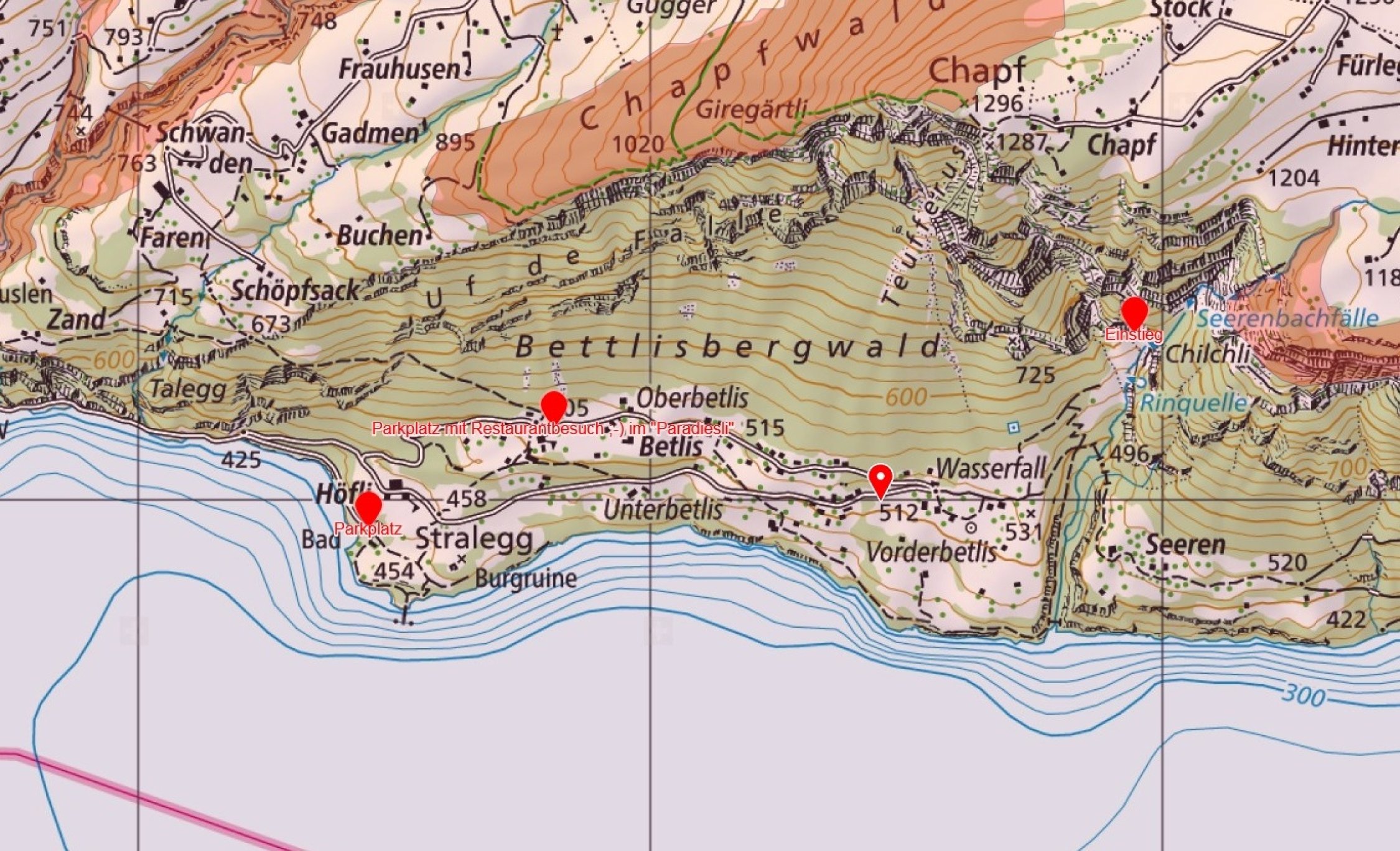 Von den Parkplätzen gemütliches Schlendern durch das wunderschöne Betlis, weiter zur Aussichtsplattform Seerenbachfälle, den Pfad kurz davor li hoch weitergehen, einen Bachlauf überqueren, durch immer feuchteres Gelände (Karstquellen!) und moosbedeckte Steinhalde an den Wandfuss: Man suche sich nun den am wenigsten nassen Platz, etwas geschützt von der Gischt des Wasserfalls (im Frühling/Frühsommer).