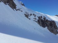 Die Felsstufe ist nicht mehr so leicht zu passieren. Ich hab meine Skis aufgeladen, allenfalls können im Lawinenkegel Steigeisen von Nutzen sein.