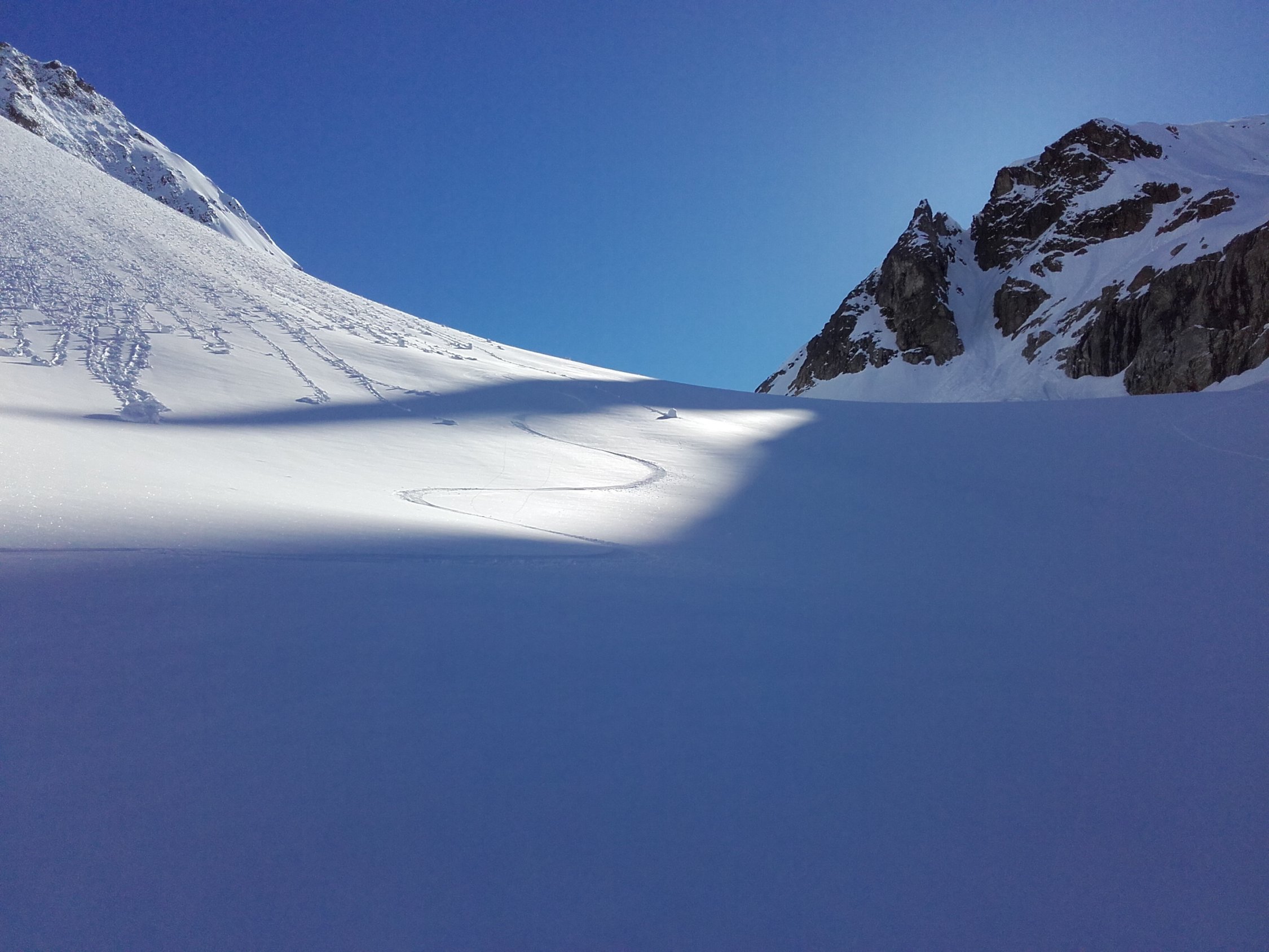 Das Wetter war heute schon ab 7:00 Uhr top und die Wolken haben sich verzogen. Hab mich dennoch entschieden, erst am Nachmittag auf den Giglistock zu steigen, dies mit viel Spurarbeit. Es war viel wärmer als erwartet. Bis auf den Gipfel hatte die Sonne schon ihre Wirkung. Pulver war nicht mehr zu finden. Aber durch die späte Abfahrt war der Schnee nicht mehr so tief und ich konnte dennnoch ein paar Hänge zieren.