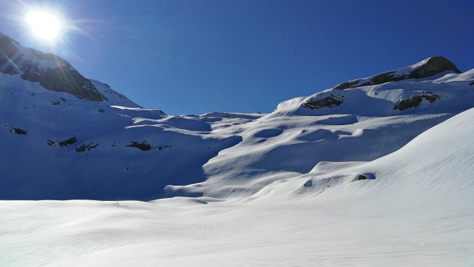 Start 06:30 Uhr. Ab Parkplatz Grunerli (1529m) gut 30 Minuten Ski tragen, anschliessend durchgehende Schneedecke bis Gipfel. Schnee dank klarer Nacht durchgehend gefroren. Gipfelabfahrt bei super Sulz.