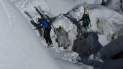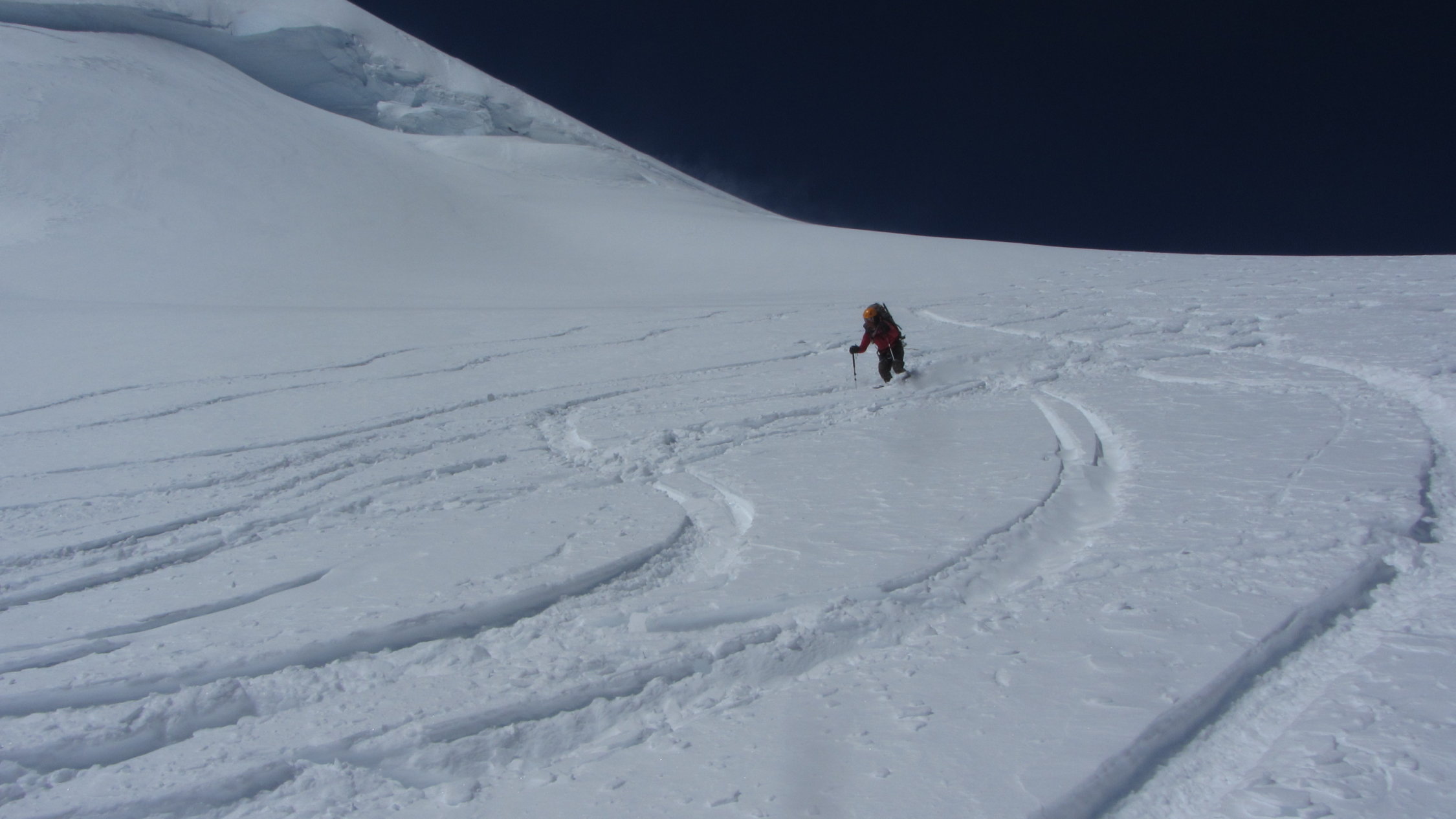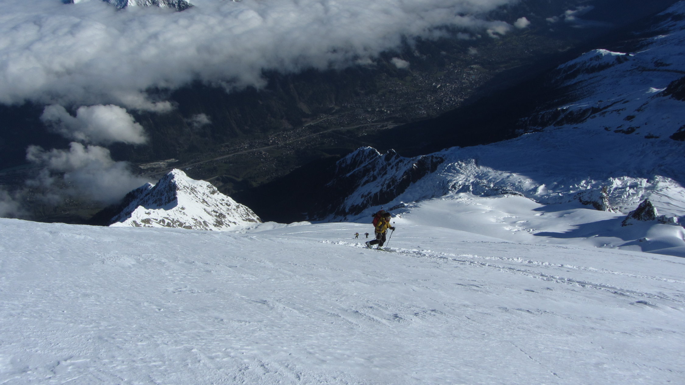 Aufstieg zur Grand Mulet am Dienstag, 8.5., gegen Mittag, sehr hohe Lawinengefahr aus der Nordwand der Aiguille di Midi. La Jonction entsprechend der Tageszeit sehr weich, Spaltenbrücken vorhanden aber instabil und heikel. Am 9.5. Tourbegin um 2.30 Uhr über den Nordgrat des Dome de Gouter. Nach den Schneefällen der vergangenen Wochen (bis 1 Meter) von der Grand Mulet weg sehr gut angelegte, neue Spur. Ab ca. 3600 Meter auf dem Nordgrat des Dom de Gouter Blankeis (bis 40°). 3,5 Seillängen gesichert, danach wieder sehr gute Spur durch den Neuschnee. Zustieg zum Vallot Biwak abgeblasen und eisig, nur mit Steigeisen zu begehen; Abbruch 100 HM unter Vallot-Biwak. Der erste Aufschwung des Bossesgrat Blankeis, nach Angaben anderer Seilschaften keine Gipfelbesteigung an diesem Tag. Keine Aufstiegsspur über Petit und Grand Plateau, die wurden erst am 10.5. gelegt. Keine Spuren in der Überschreitung via Mont du Tacul. Abfahrt vom Plateau unterhalb des Biwak die ersten Meter Bruchharsch, danach im Grand und Petit Plateau feiner Pulver bis zur Hütte. Viele offene Spalten, insgesamt aber sehr gute Bedingungen in der Abfahrt. Am 10.5. Abstieg um 7.30 Uhr, Spaltenbrücken in La Jonction deutlich kleiner aber gut durchgefroren und stabil. Weitere Abfahrt eisiges Rumgegurke unter der Aiguille di Midi-Nordwand.