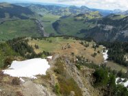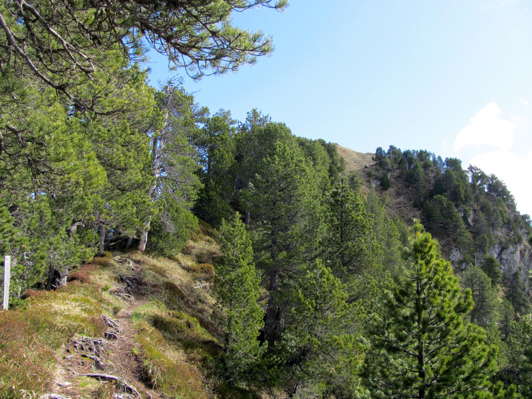 Abstieg über die Südostflanke zur Alphütte Roggenegg auf gut ersichtlichem Pfad. Die Schneepassage war im guten Trittschnee gut zu begehen. Die Stöcke boten in dem steilen Gelände guten Halt.