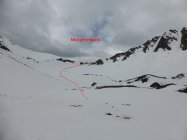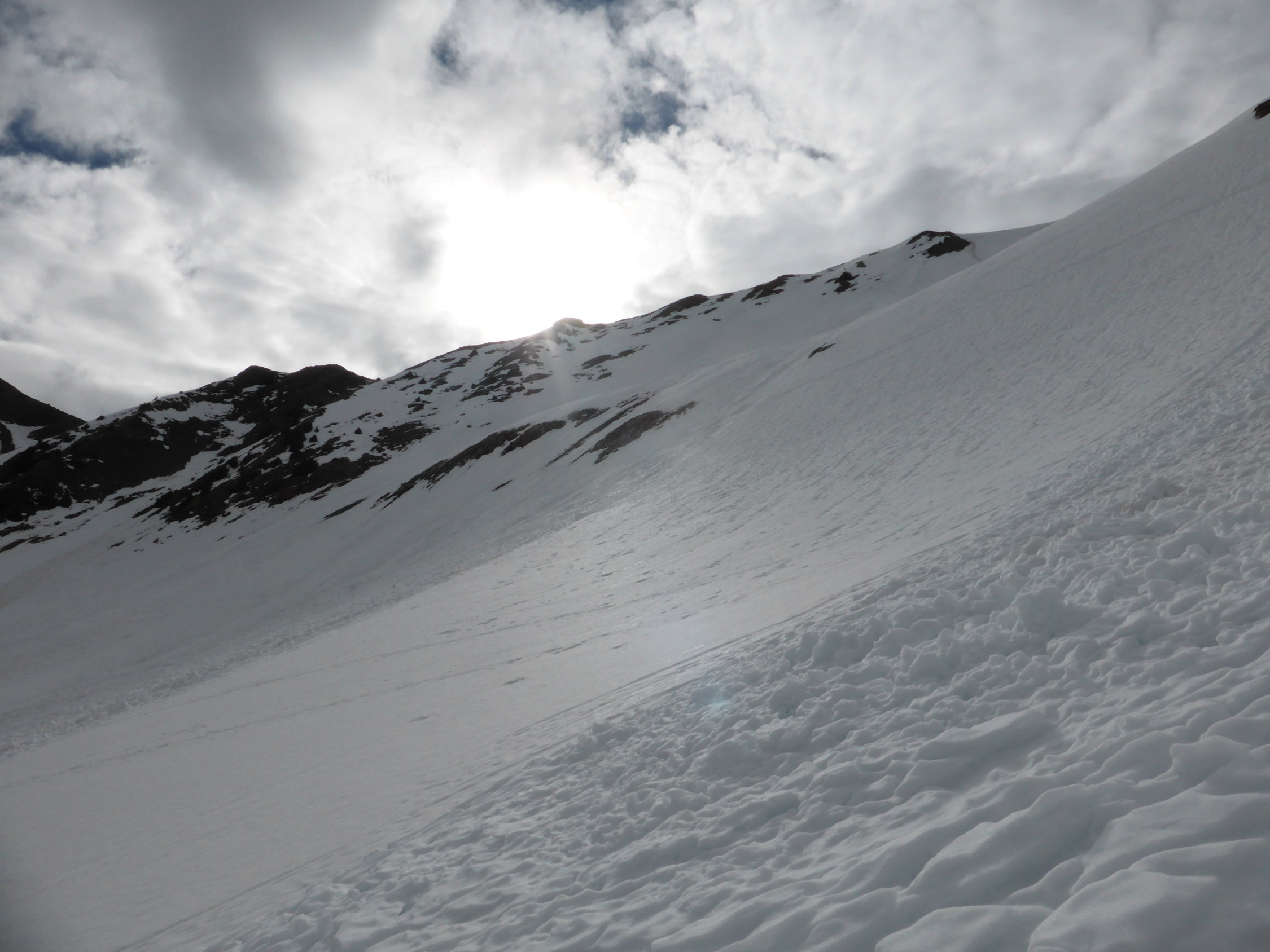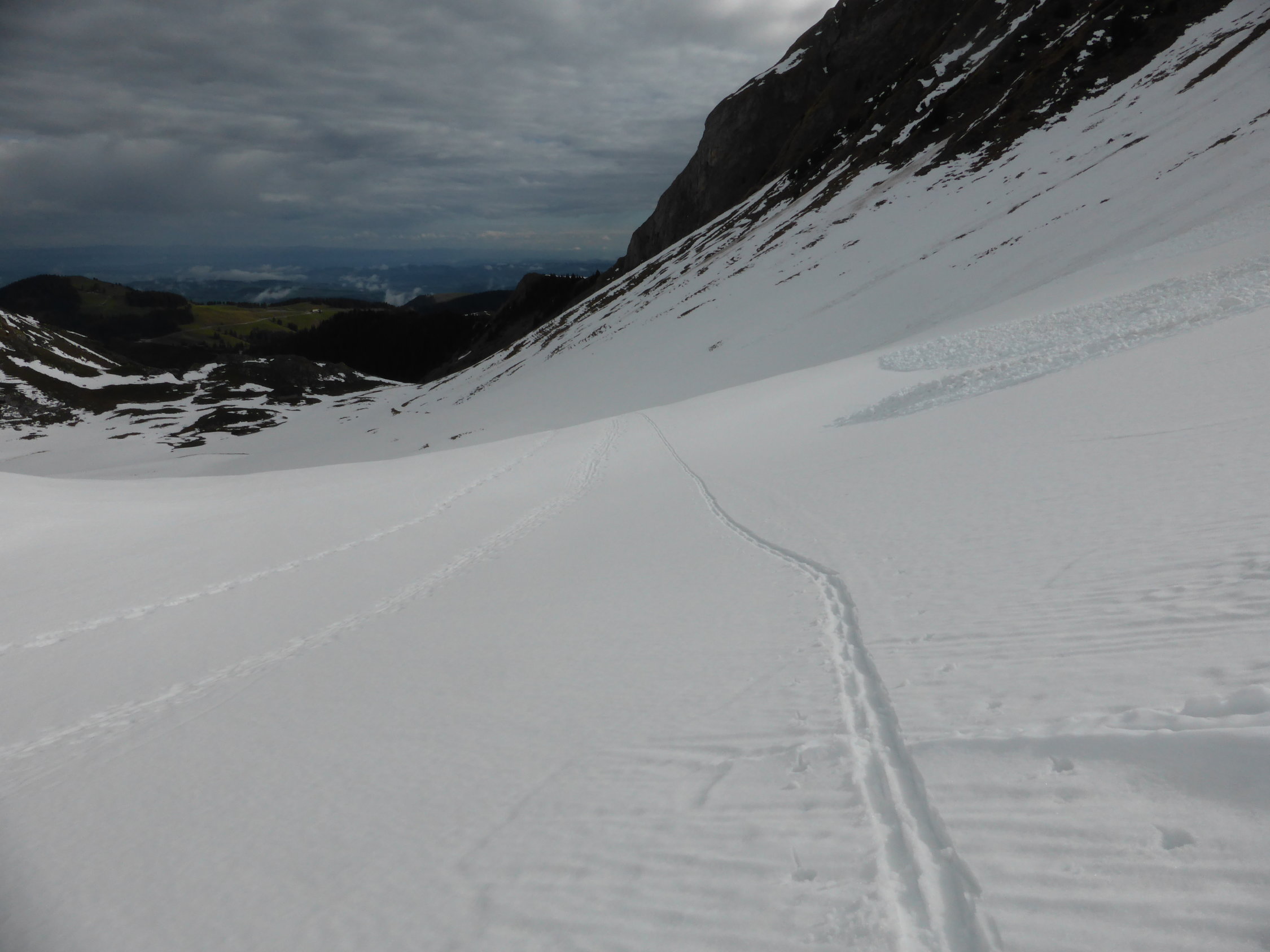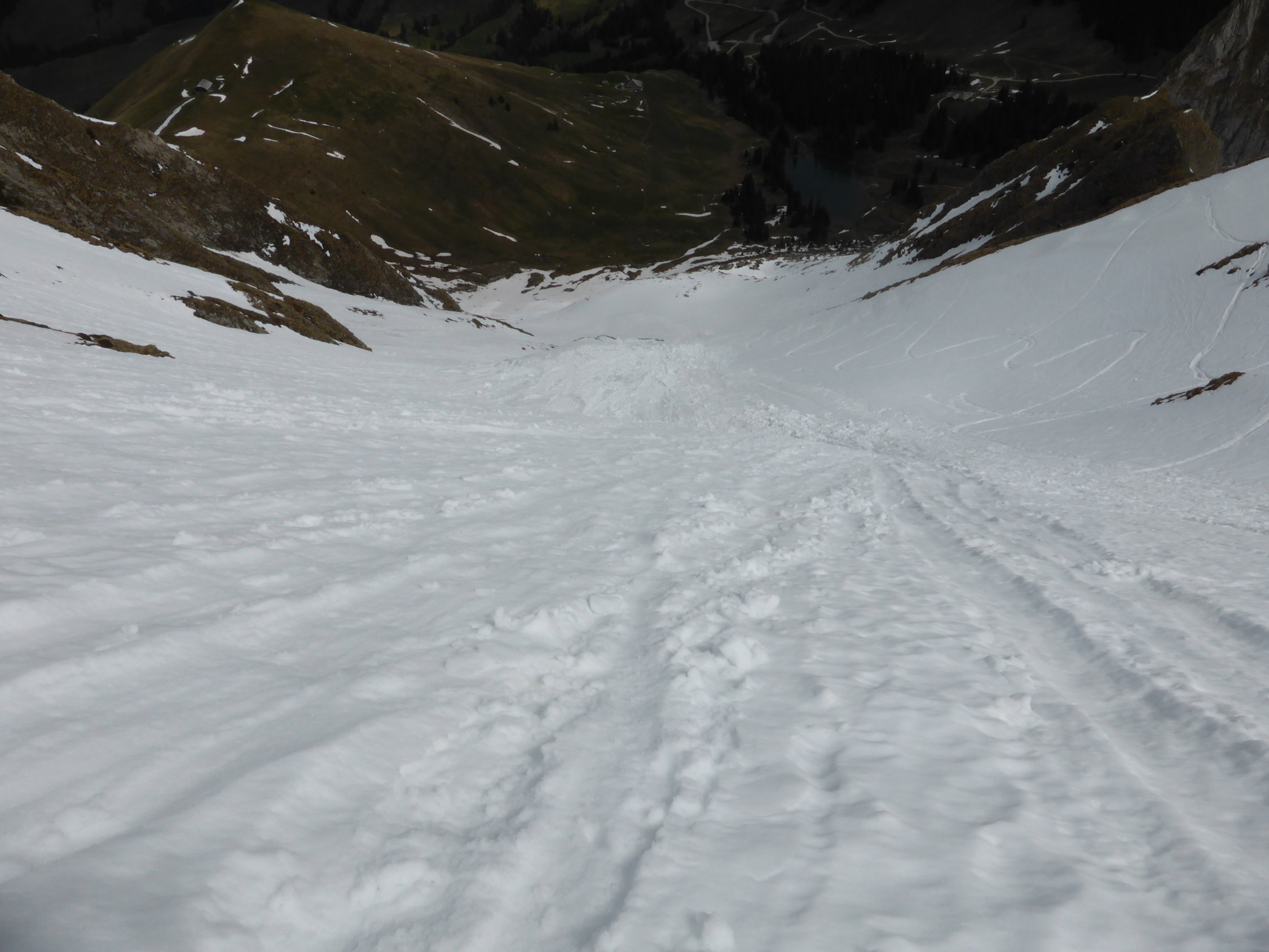 Abfahrt; in der Nordflanke vor allem in der ersten Mulde viele Nassschneerutsche, ca. 1/3 der Abfahrt etwas mühsam, danach ca. 2/3 doch sehr gut zu fahrende Verhältnisse, Schnee bis zum Bächlein am Fuss der Nordflanke, danach ist Fussmarsch angesagt