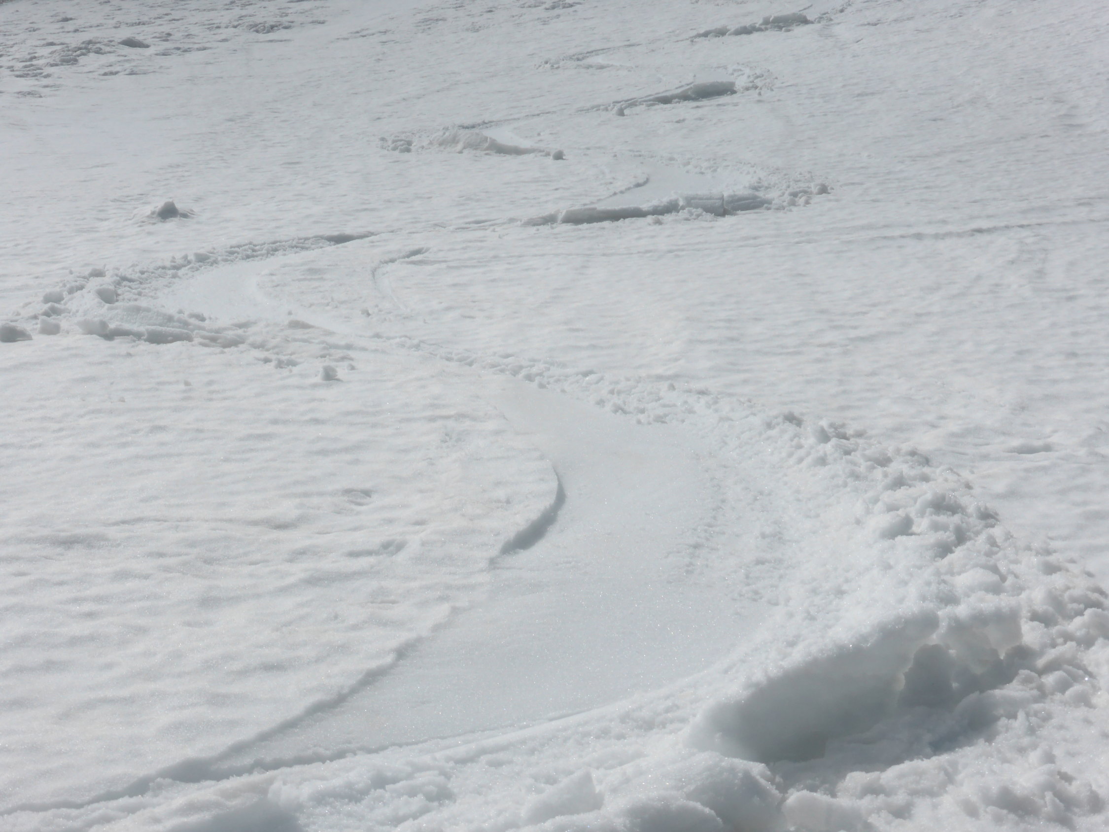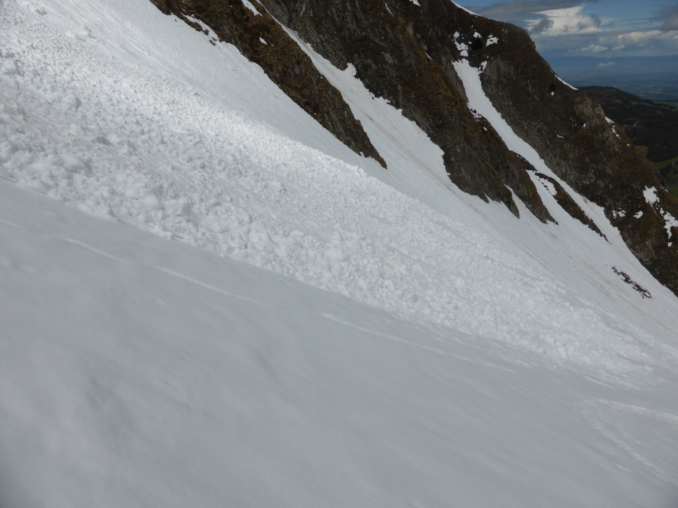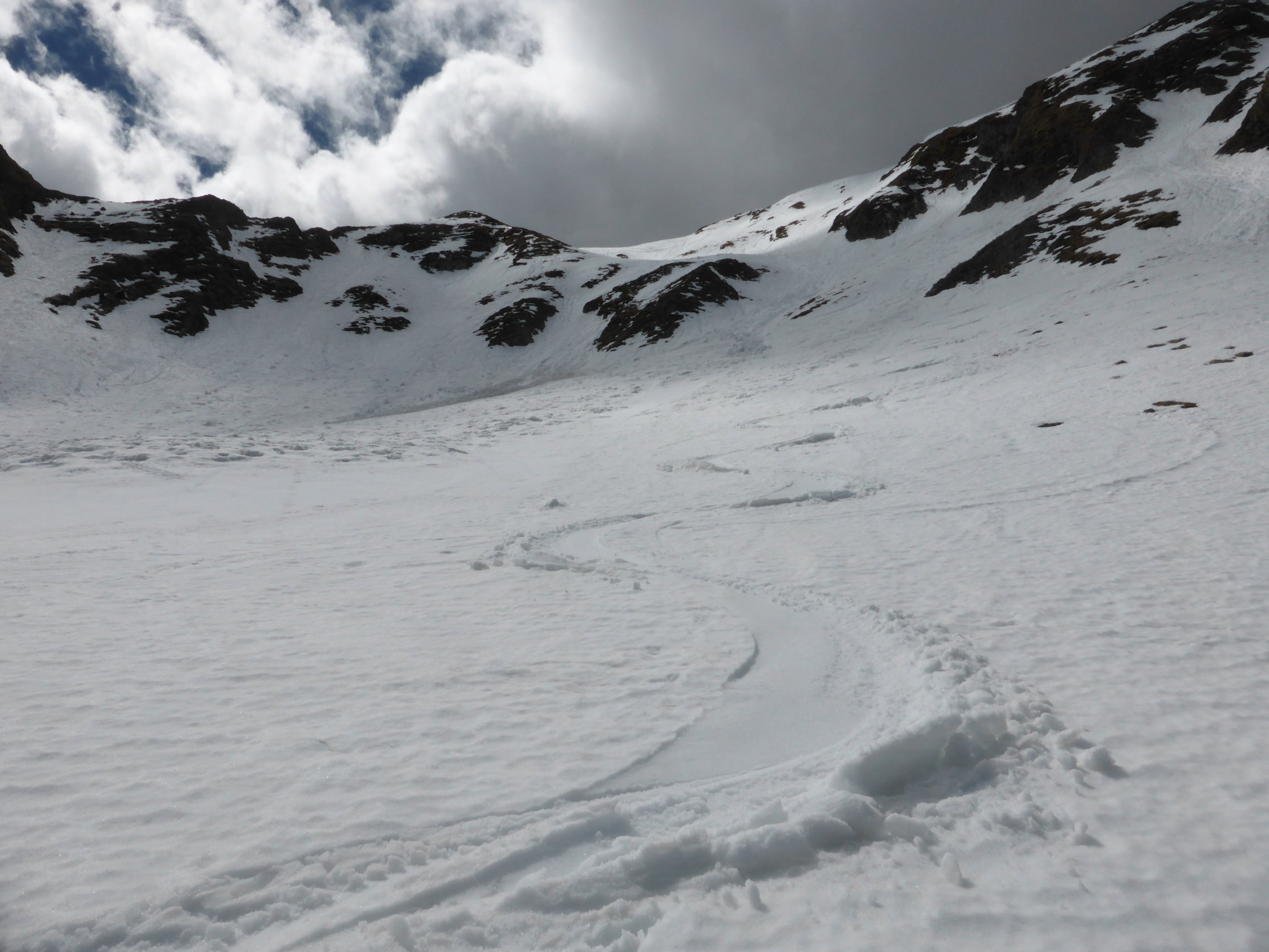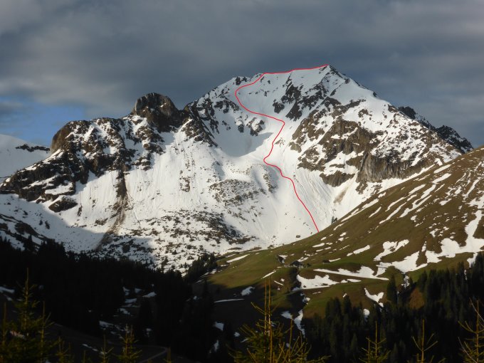 Abfahrt; in der Nordflanke vor allem in der ersten Mulde viele Nassschneerutsche, ca. 1/3 der Abfahrt etwas mühsam, danach ca. 2/3 doch sehr gut zu fahrende Verhältnisse, Schnee bis zum Bächlein am Fuss der Nordflanke, danach ist Fussmarsch angesagt