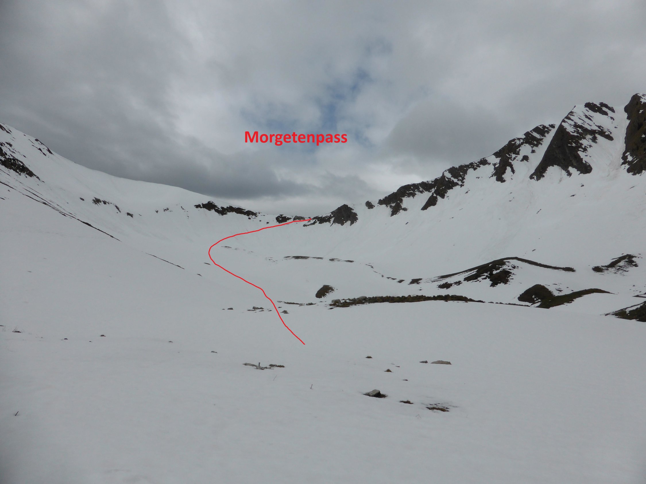 Schnee: Aufstieg; wegen fehlender Abstrahlung in der Nacht alles Nassschnee, ab ca.1650m durchgehende Schneedecke bis Gipfel mit einer kleinen Ausnahme kurz nach Morgetenpass
