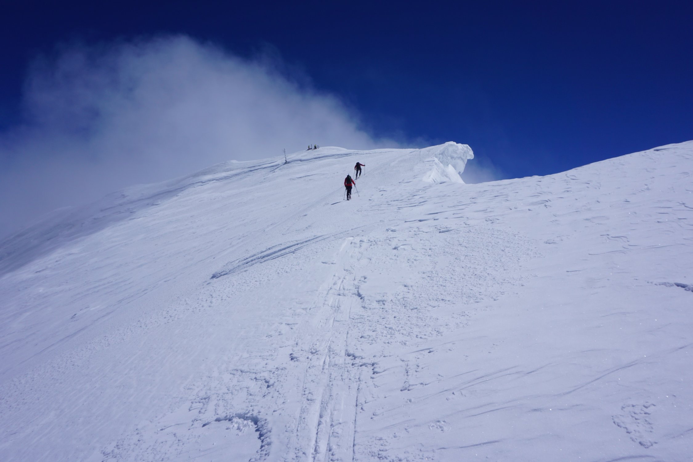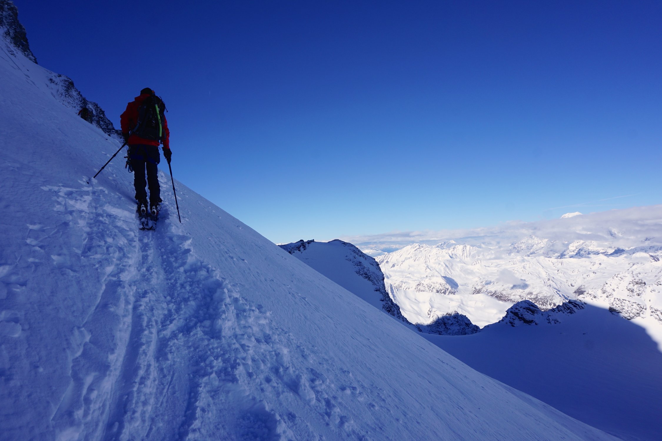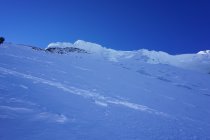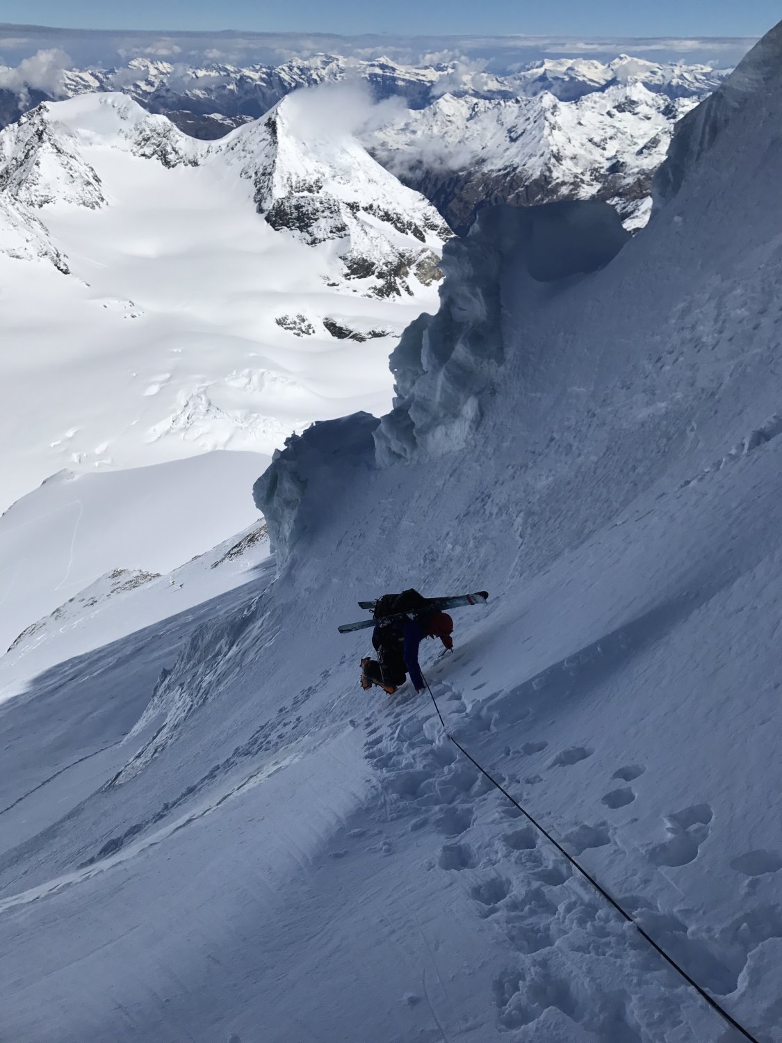 Start bei Schneefall und Nebel, Aufhellungen und Sonnenschein bis Mittag, leichte Schneeauflage im Couloir des Guides, ab halber Höhe Skitragen mit Steigeisen, im Abstieg zT Abseilen nötig. Der viele Neuschnee wurde zum Teil weggeblasen. Am Sonntag blieb es dann den ganzen Tag nebelfrei und die Abfahrt über den Corridor wurde bei besserer Sicht gefahren.