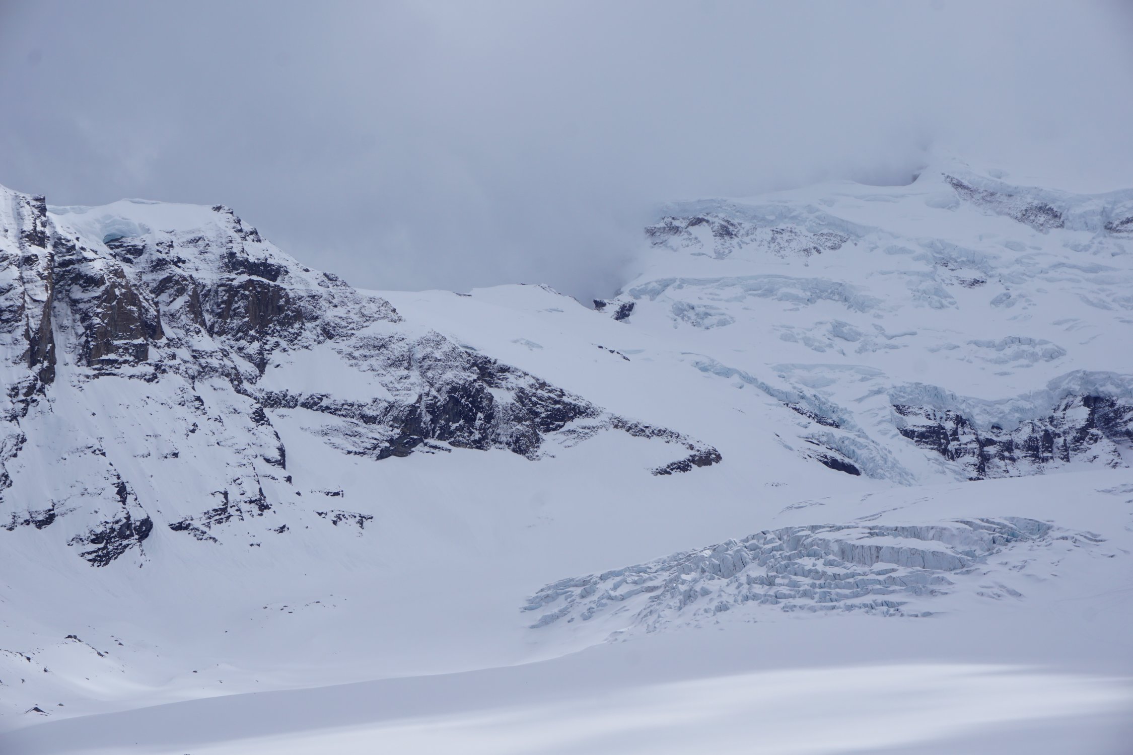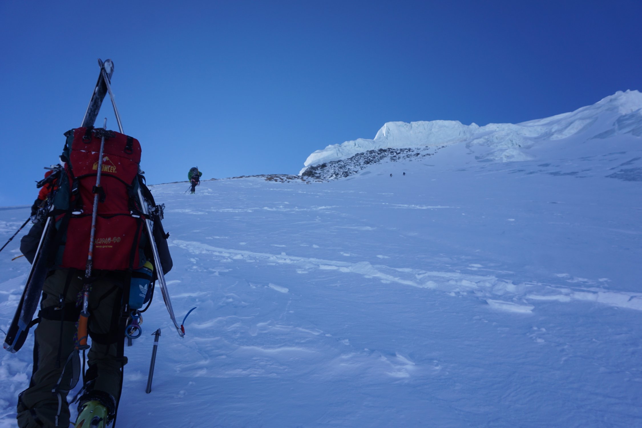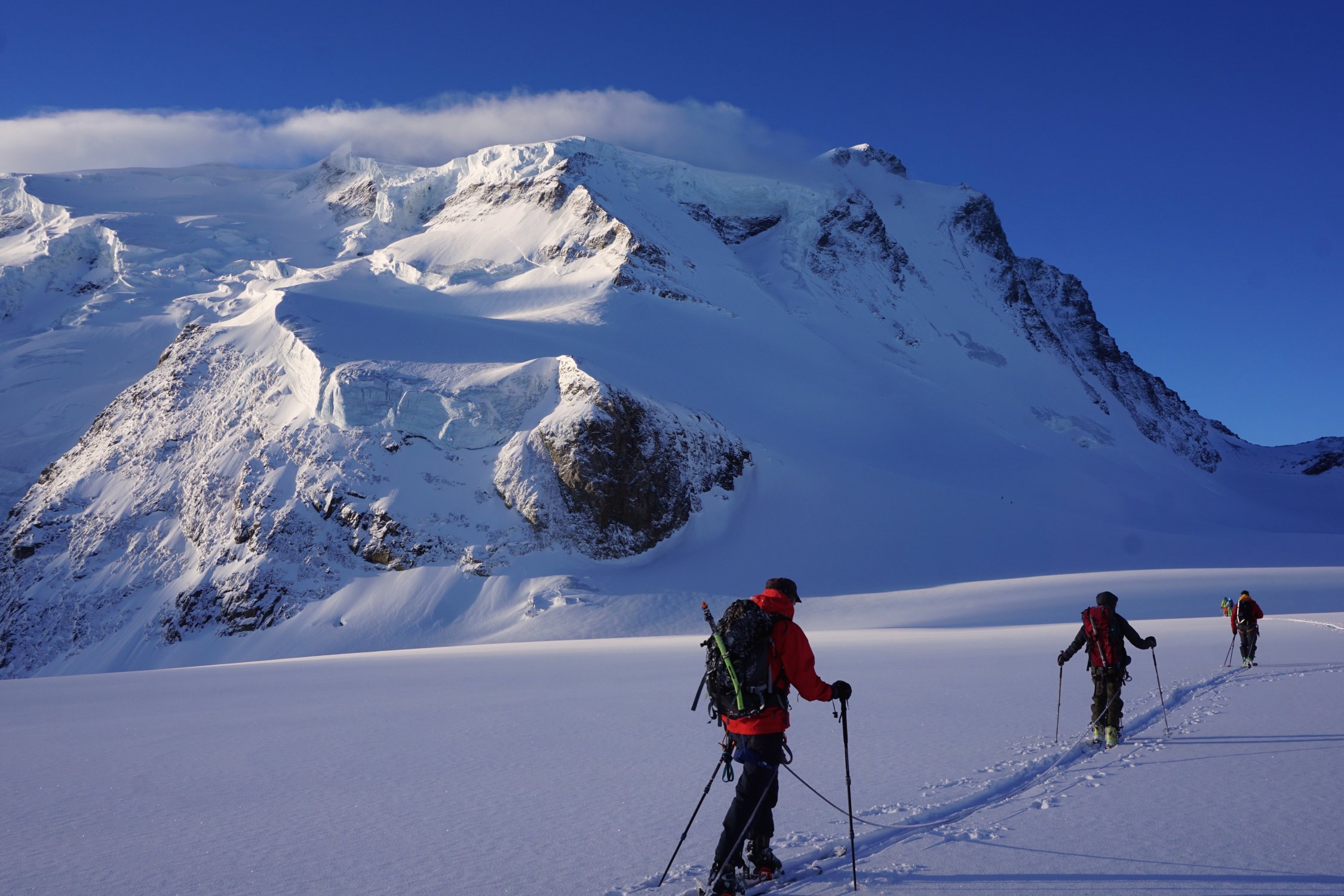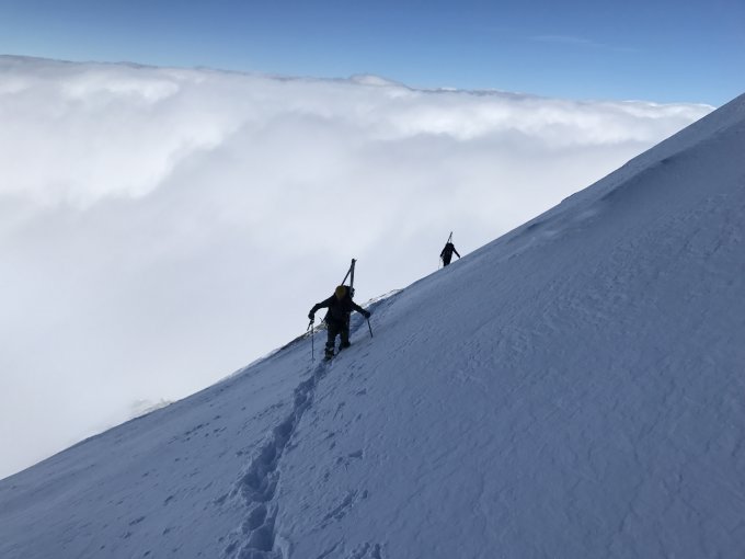 Start bei Schneefall und Nebel, Aufhellungen und Sonnenschein bis Mittag, leichte Schneeauflage im Couloir des Guides, ab halber Höhe Skitragen mit Steigeisen, im Abstieg zT Abseilen nötig. Der viele Neuschnee wurde zum Teil weggeblasen. Am Sonntag blieb es dann den ganzen Tag nebelfrei und die Abfahrt über den Corridor wurde bei besserer Sicht gefahren.