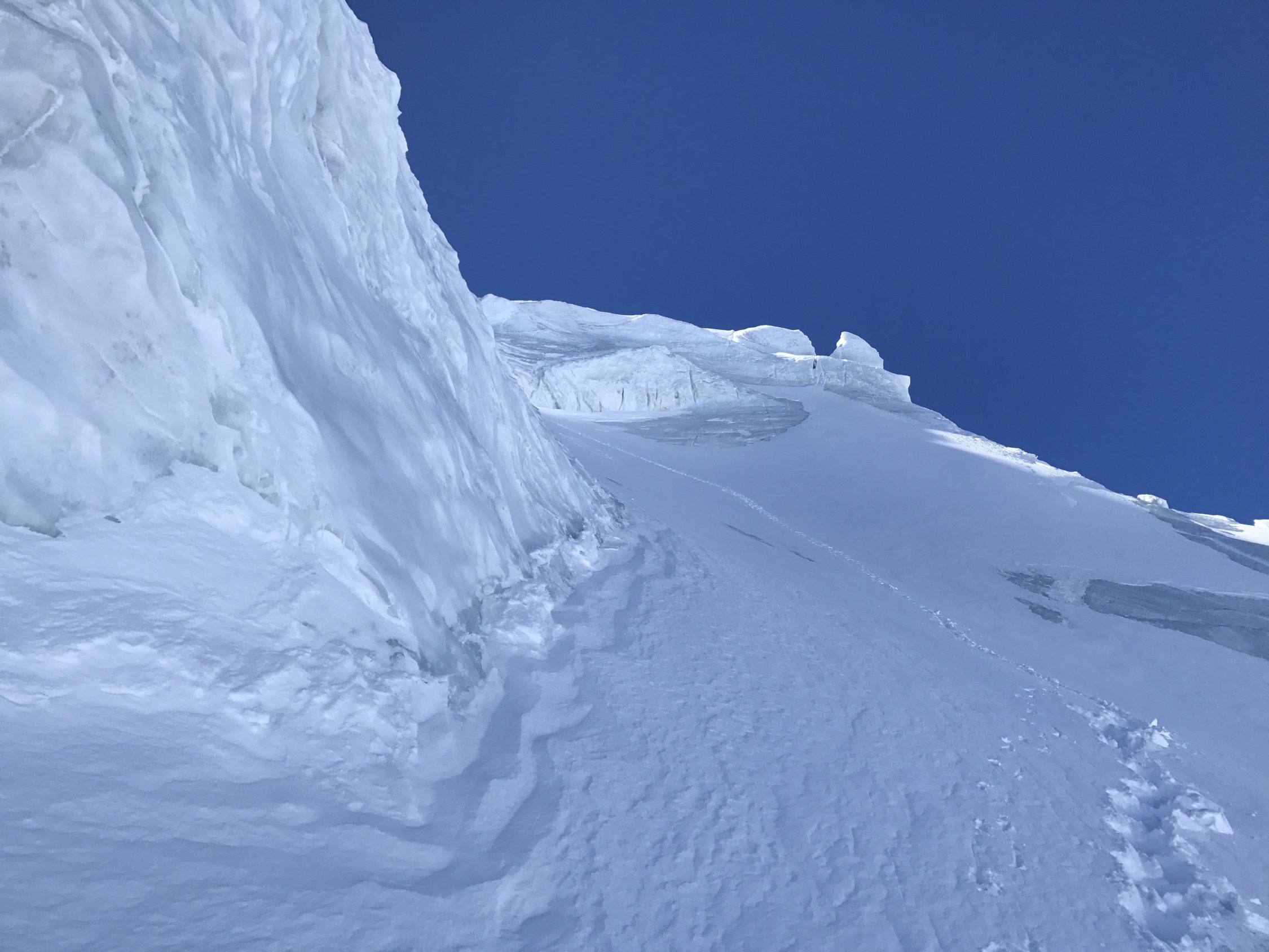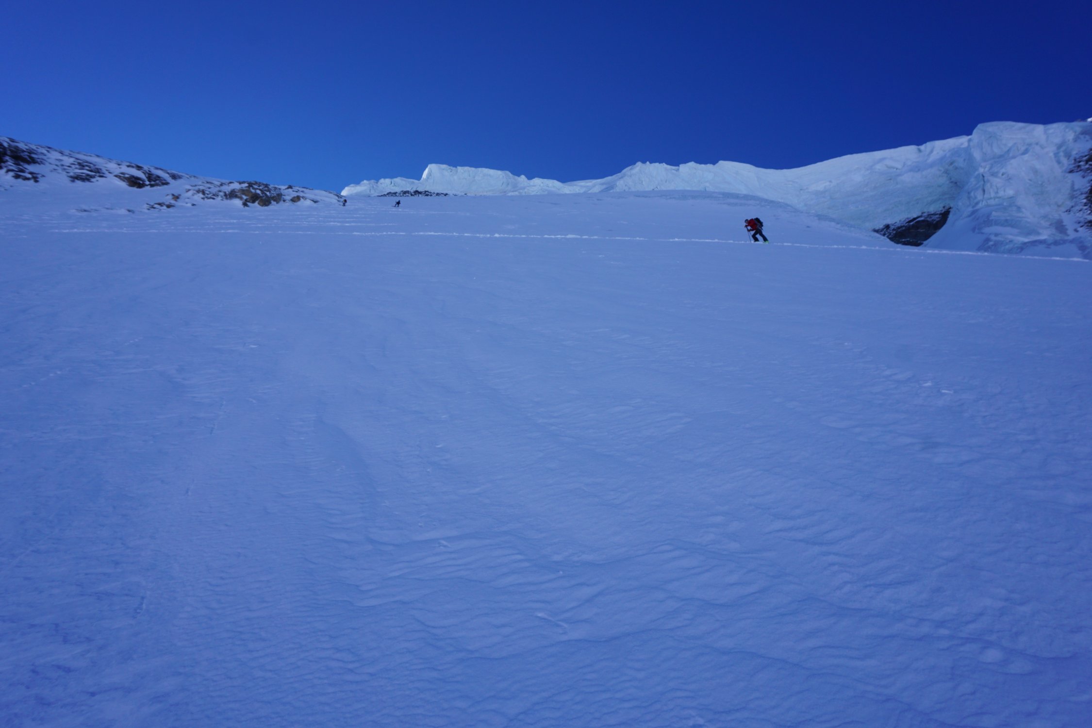 Wird eher besser, weil sich Neuschnee und Blankeis in der Flanke besser verbinden. Auf dem Hüttenweg sind zwei Tragstrecken, eine am Anfang und eine über den Flankenweg nötig.
