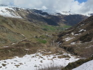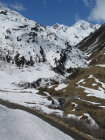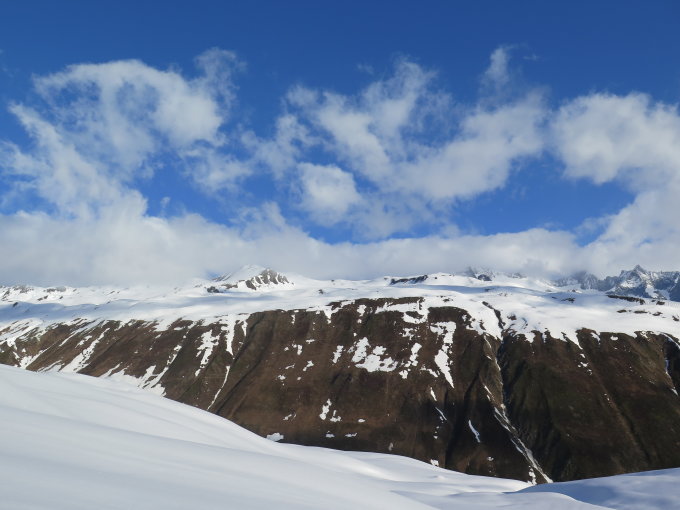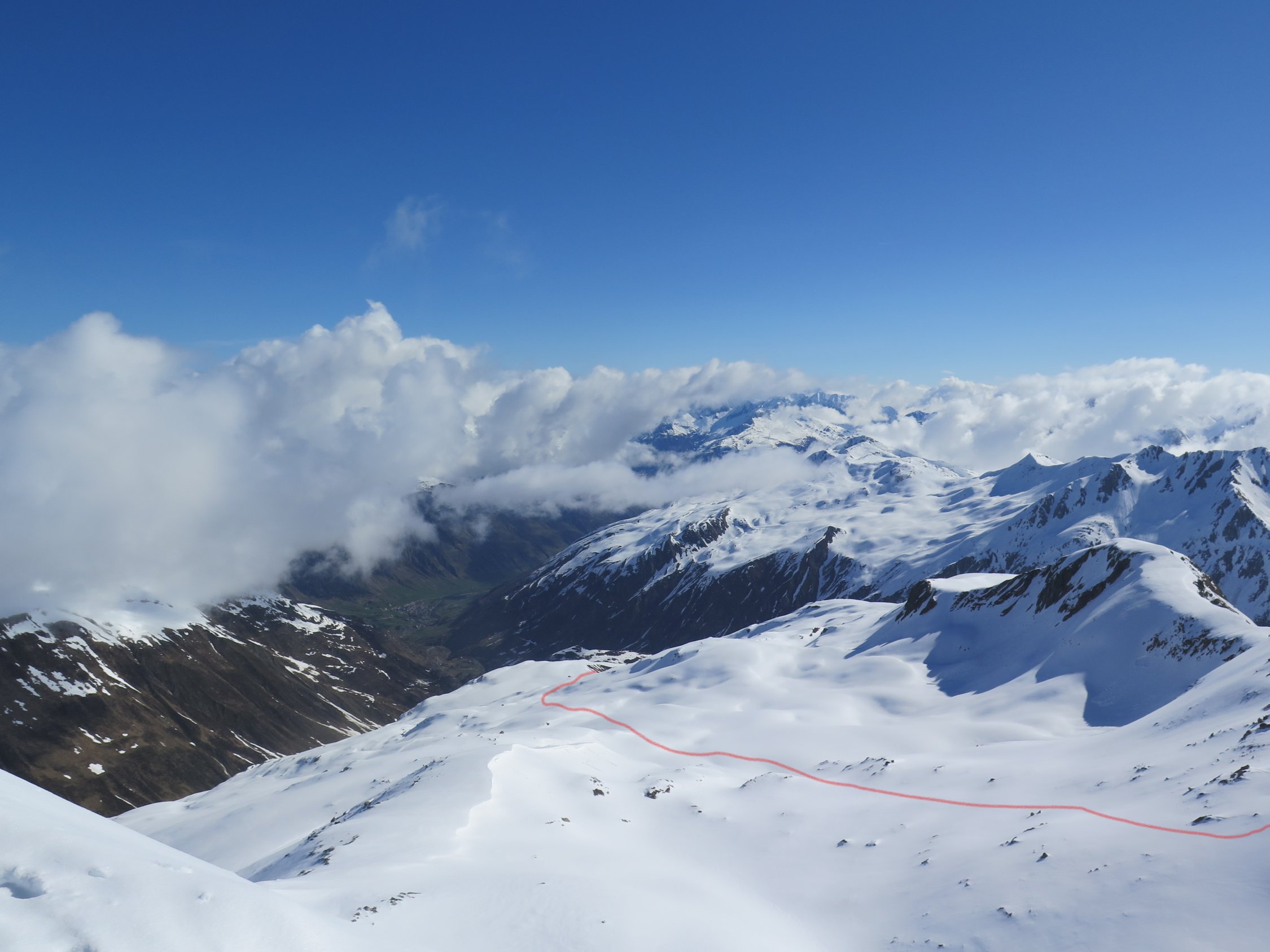 Start um 5.45(5°C)mit dem Velo vom Parkplatz Realp. Bis zum Schnee gefahren.Etwas weiter als bis Ebnen. Auf ca. 1850 m.ü.m. Von Da an Geschlossene Schneedecke. Bin der Strasse entlang bis Oberchäseren und dan Normalroute.