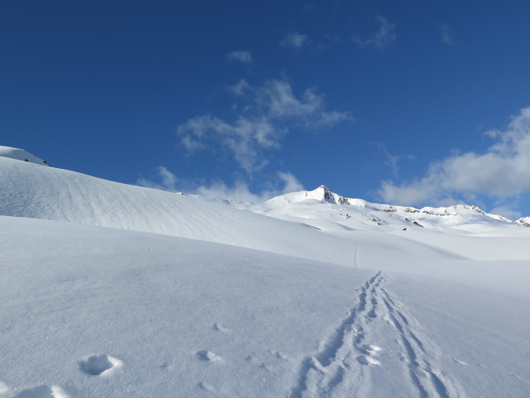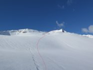 Schnee bis auf ca. 2400 m.ü.m. weich oder leichte Harschkruste. Ab 2400 m.ü.m. wurde die Kruste stärker, aber immer noch nicht ganz tragend. Erst ab ca. 2600m.ü.m. War der Schnee Hart, aber recht Griffig. Mit Harscheisen gings bequemer.