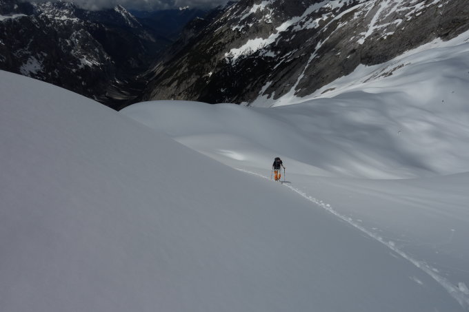 Bis ca. 1700m Schi- und Tragepassagen im Wechsel, ab dem Roßkar durchgängig Schnee. Schwer und sulzig bis Gipfel