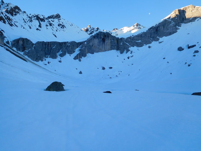 Start 5h30 am P13. Ca. 5 min zu Fuss, dann durchgehend mit Ski - etwas beengt durch die Steilstufe oberhalb Butzchammera - direkt über N-Flanke zum NW-Grat zum Gipfel.