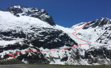 Die Skier konnten bald nach der Staumauer montiert werden mit 2/3 kurzen Unterbrüchen. (siehe Foto). Der Schnee war am Morgen bis ca. 2200 nicht recht durchgefroren.