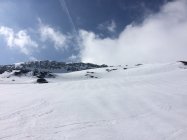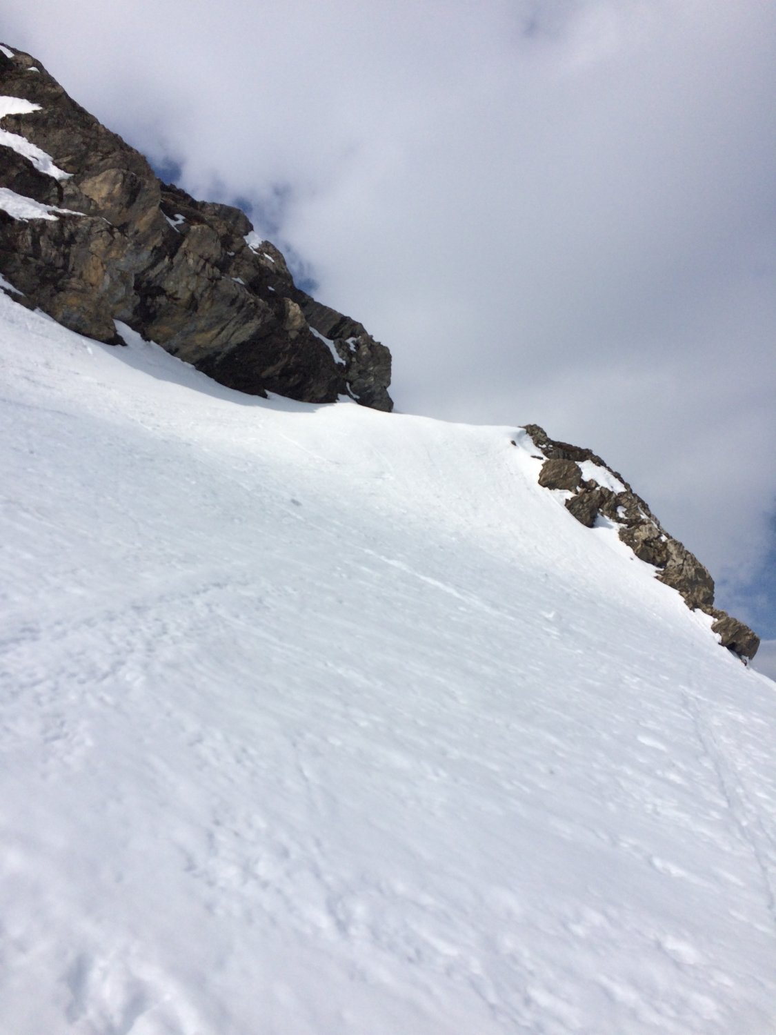 Wir sind um 7.15 aufs Bähnli, Schneedecke sehr feucht beim Start. Ab 2600 Meter wird's besser aber nicht gefroren. Steilstufe geht gut. Am Gipfel dann Nebel, Abfahrt den Aufstiegsspuren entlang. Bis auf 2 kurze Tragepassagen kann man noch bis zur Seilbahn abfahren.
