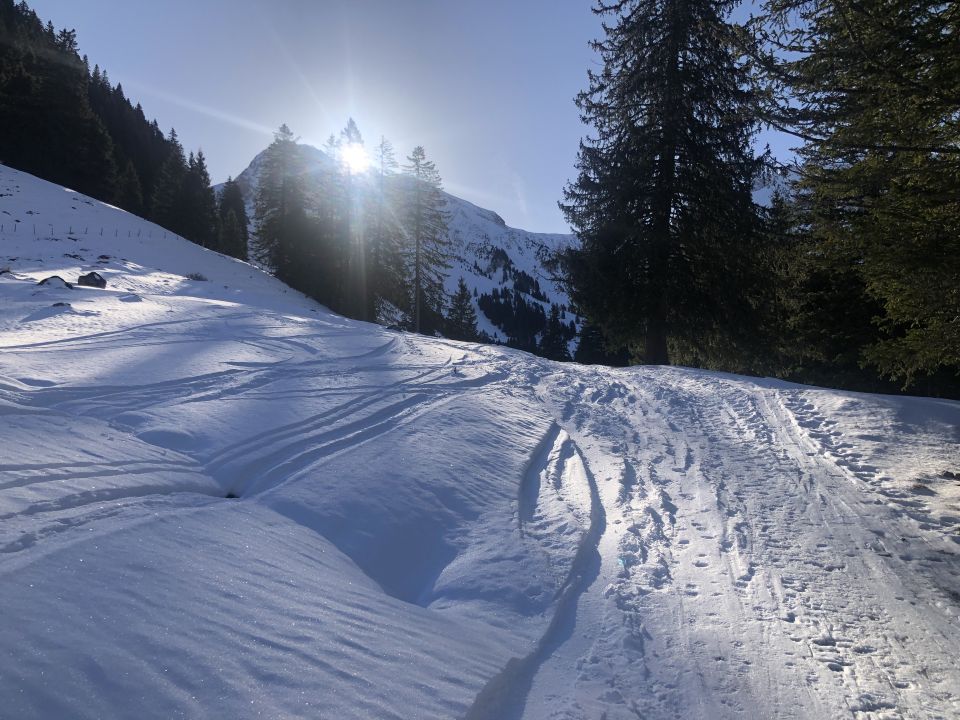 Abfahrt: gut gesetzter Pulver, ab Pt. 1716 erst rechts vom Graben bis ca. 1650 und ab hier westlich des Graben sehr schön runter zur Alp. Auch unterhalb der Alp bis Einmündung in den Alpweg zwar leicht gedeckelt, aber immer noch ein "Gut".